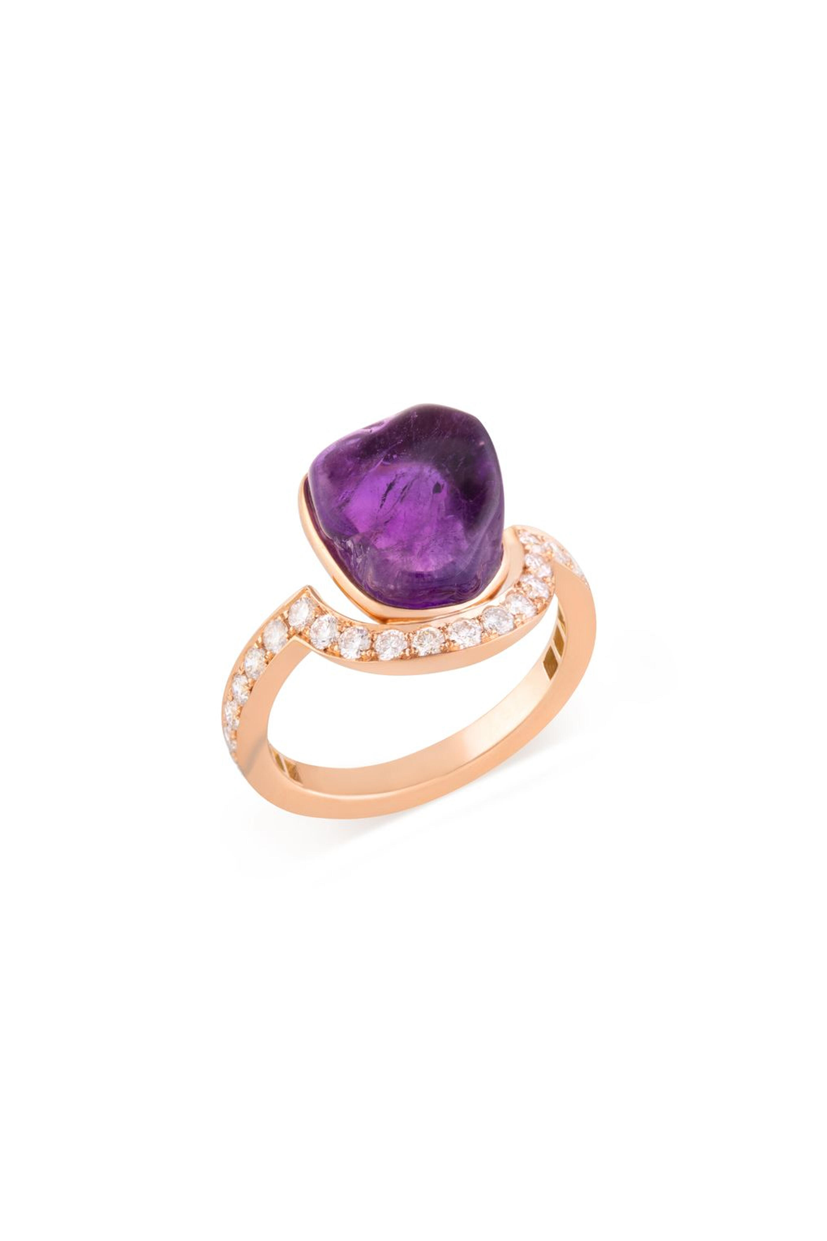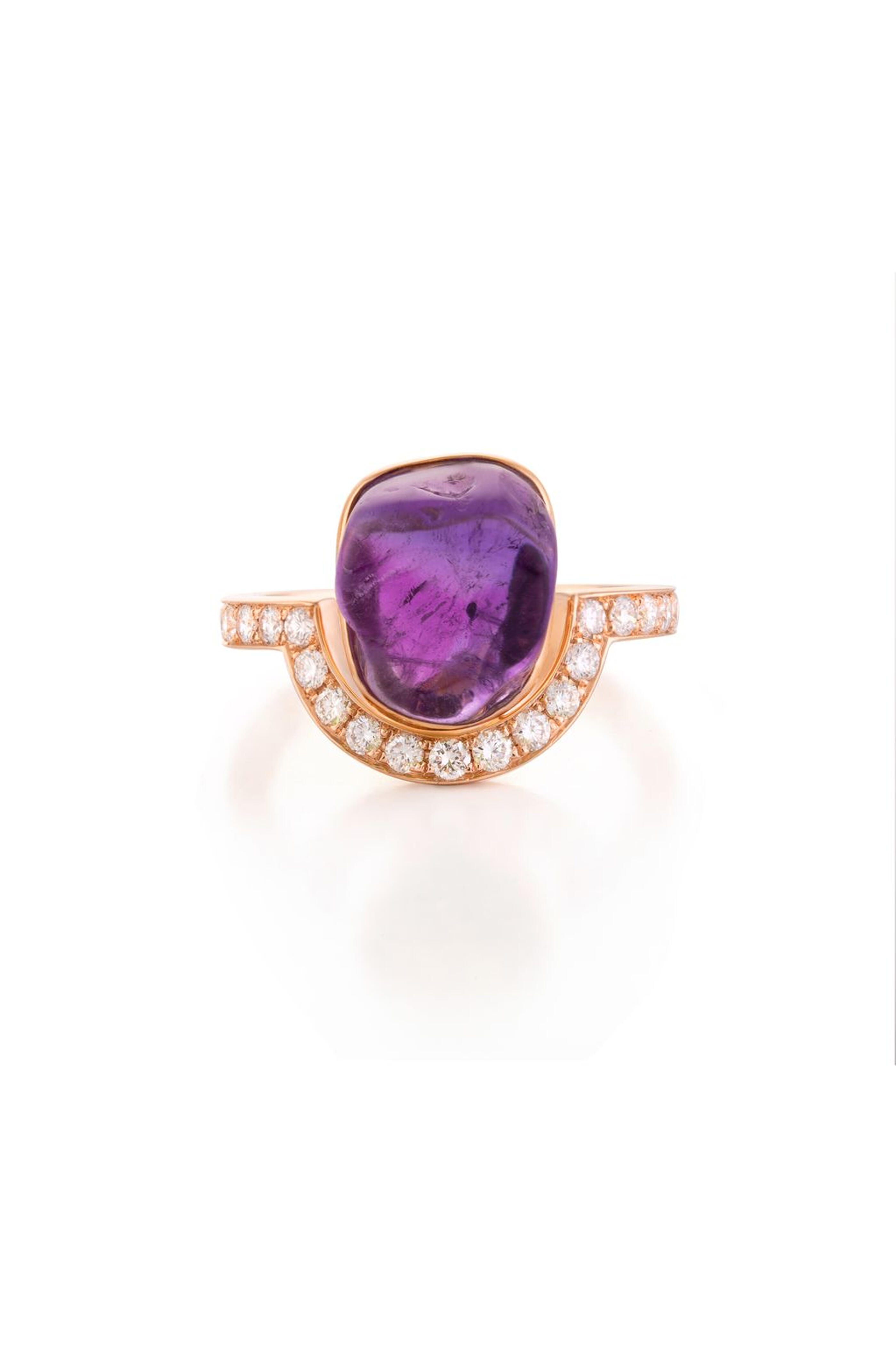 18k rose gold. Diamond. Purple Amethyst. Half-moon design. Stackable style. Prong setting. Imported. Call for ring size.
