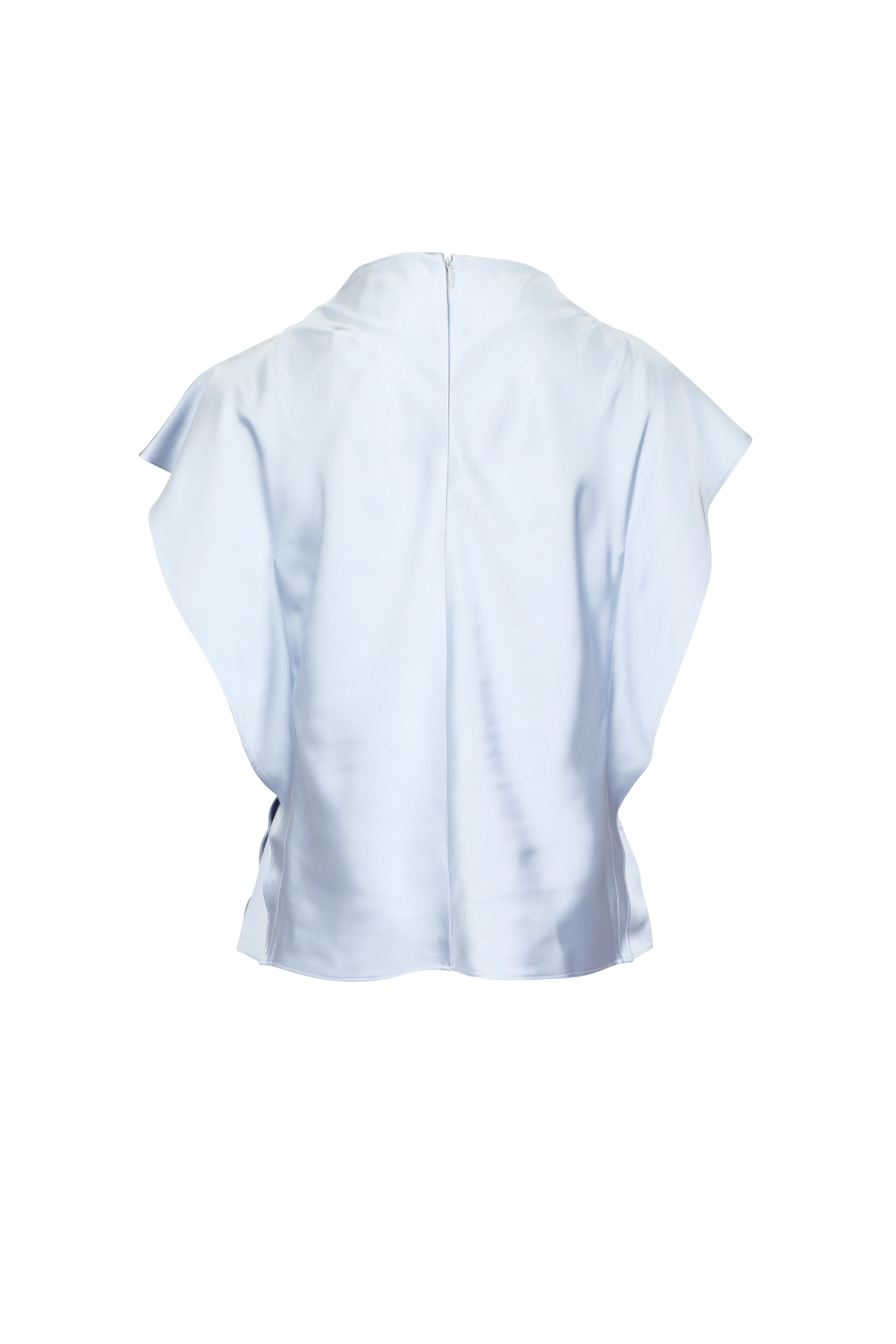 Draped neck. Short flutter sleeve. Hidden center back zipper. Bias cut. Imported. Top is 24" long. 98% polyester, 2% elastane. Dry clean only.
