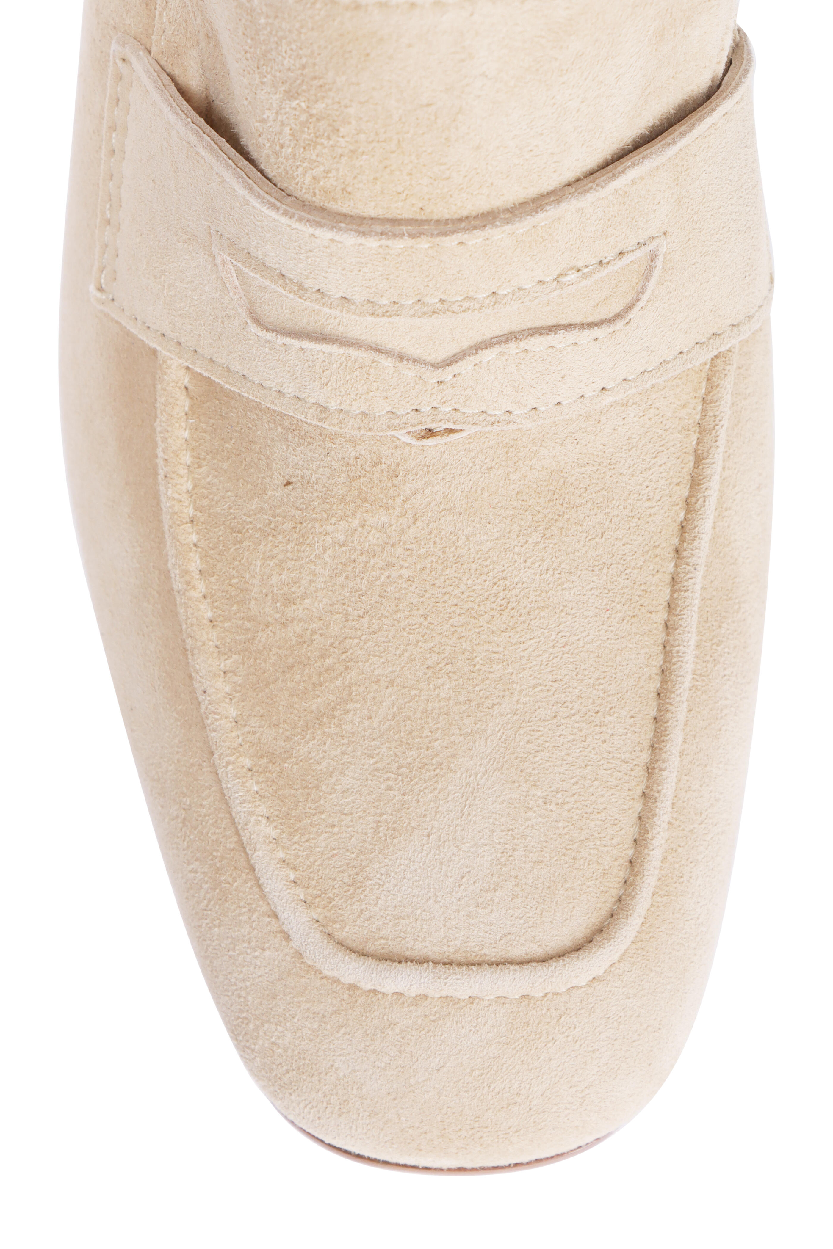 Suede upper. Leather lining and sole. Reinforced apron toe. Notched vamp. Strap with penny holder. Slip-on style. Block heel. Made in Italy. Heel measurement: 50mm.