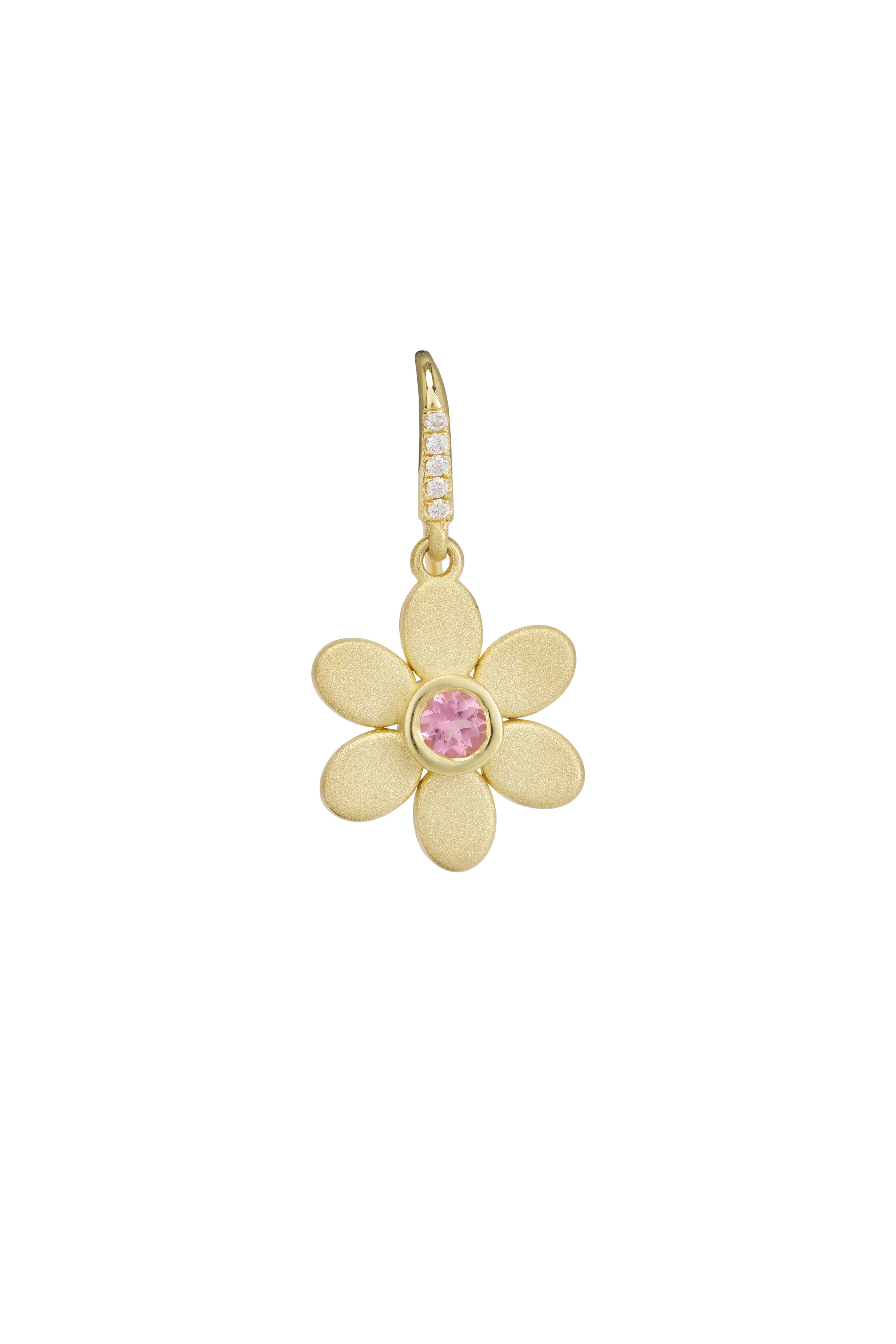 18k gold. Diamond 0.07 total carat weight. Pink tourmaline 0.45 total carat weight. Daisey design. Drop style. Diamond wire back. Made in the USA.