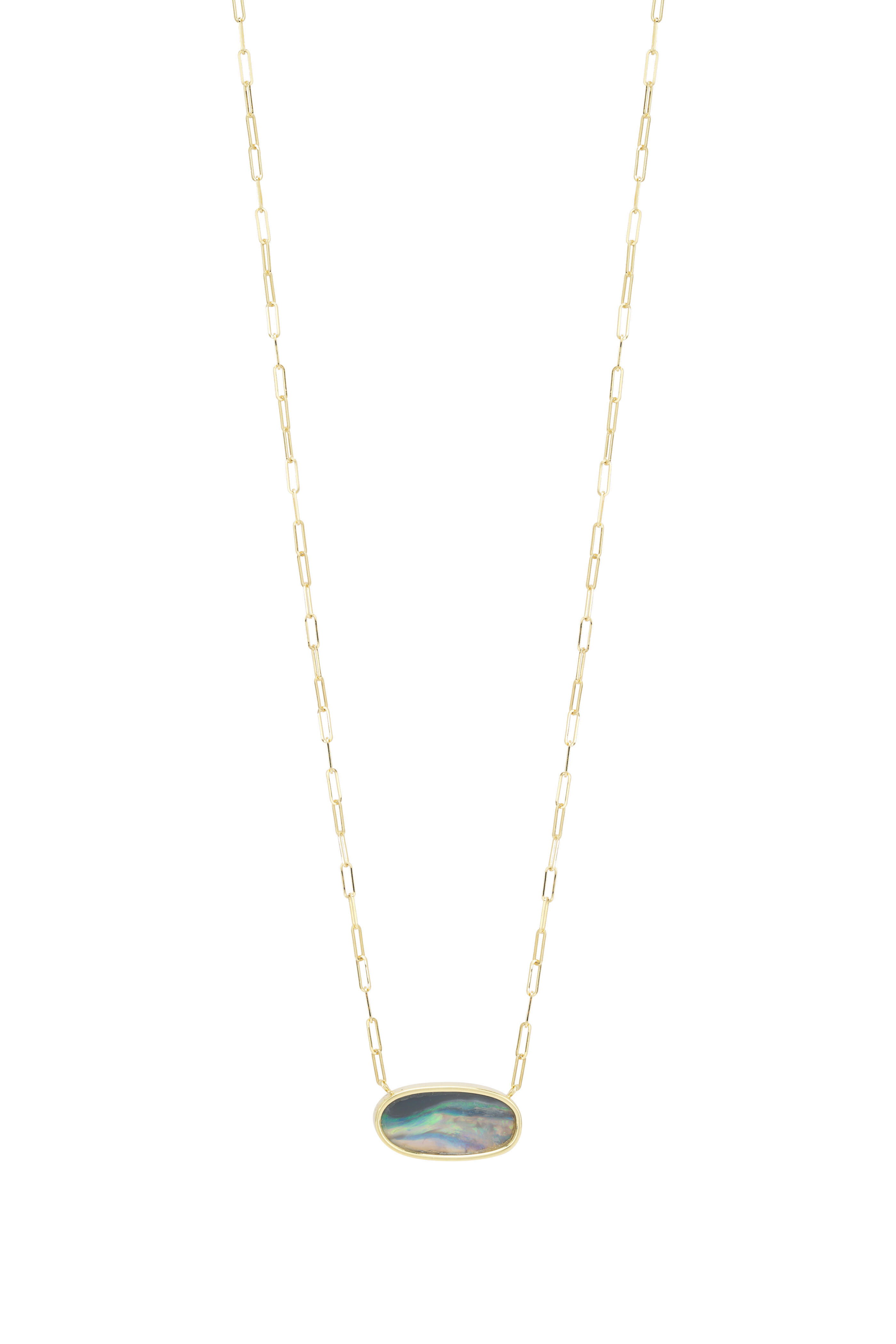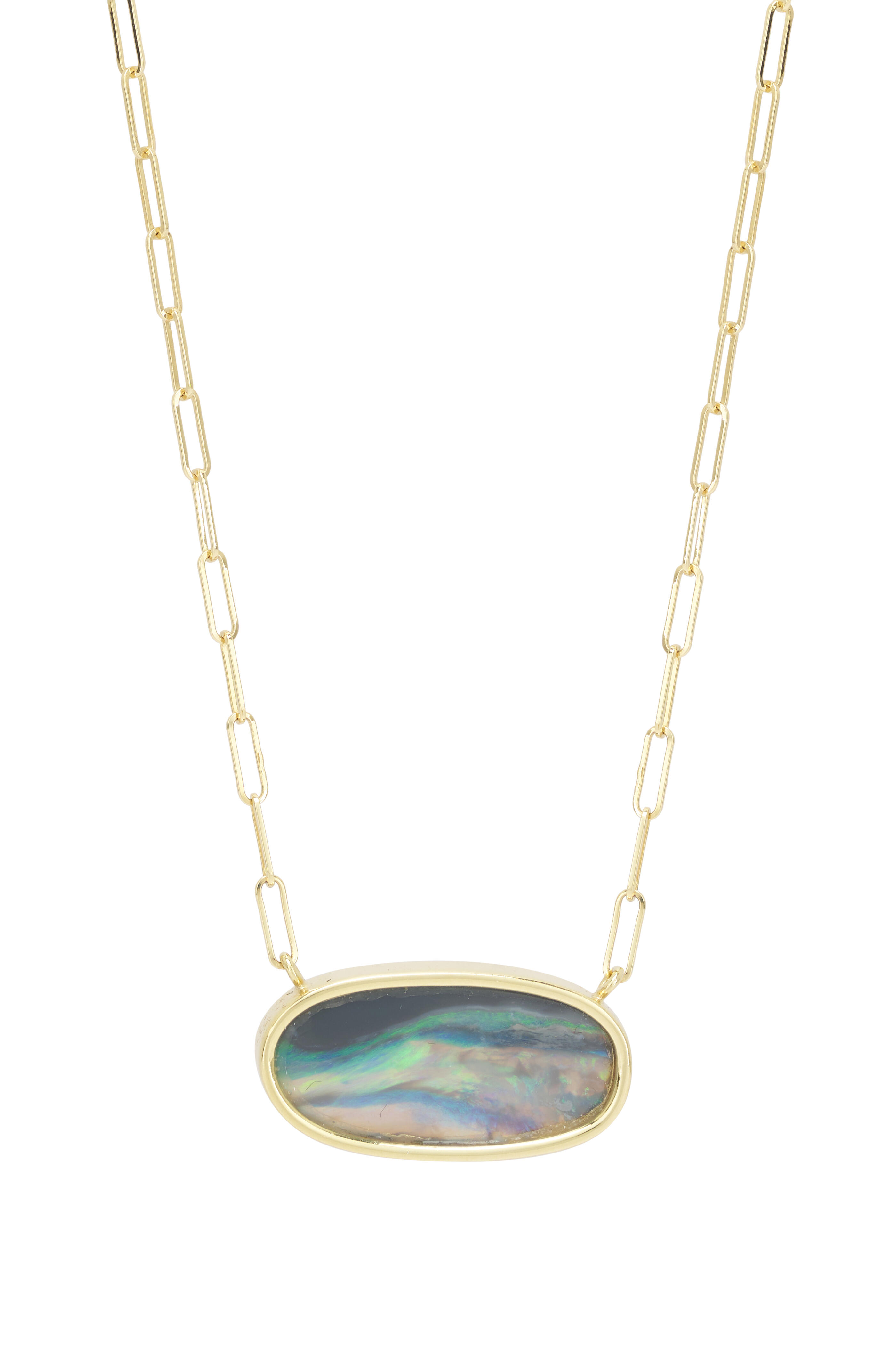 18k gold. Black opal 5.82 total carat weight. Oval cut. Gold bezel. Paperclip chain. Lobster claw clasps. Made in the USA.