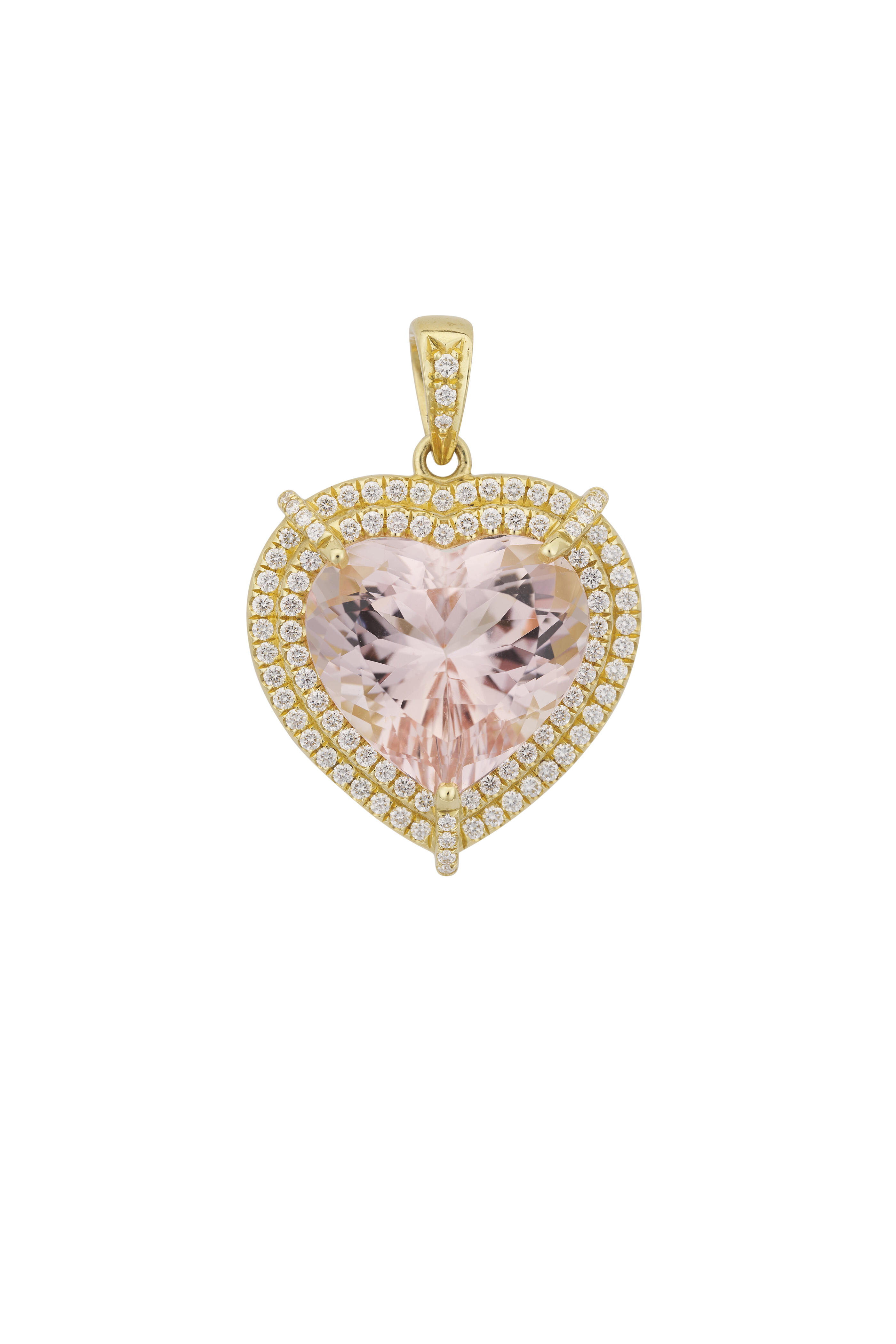 18k gold. Diamond 0.90 total carat weight. Morganite 13.53 total carat weight. Heart design. Double diamond halo. Prong setting. Diamond hinge bail. Made in the USA.