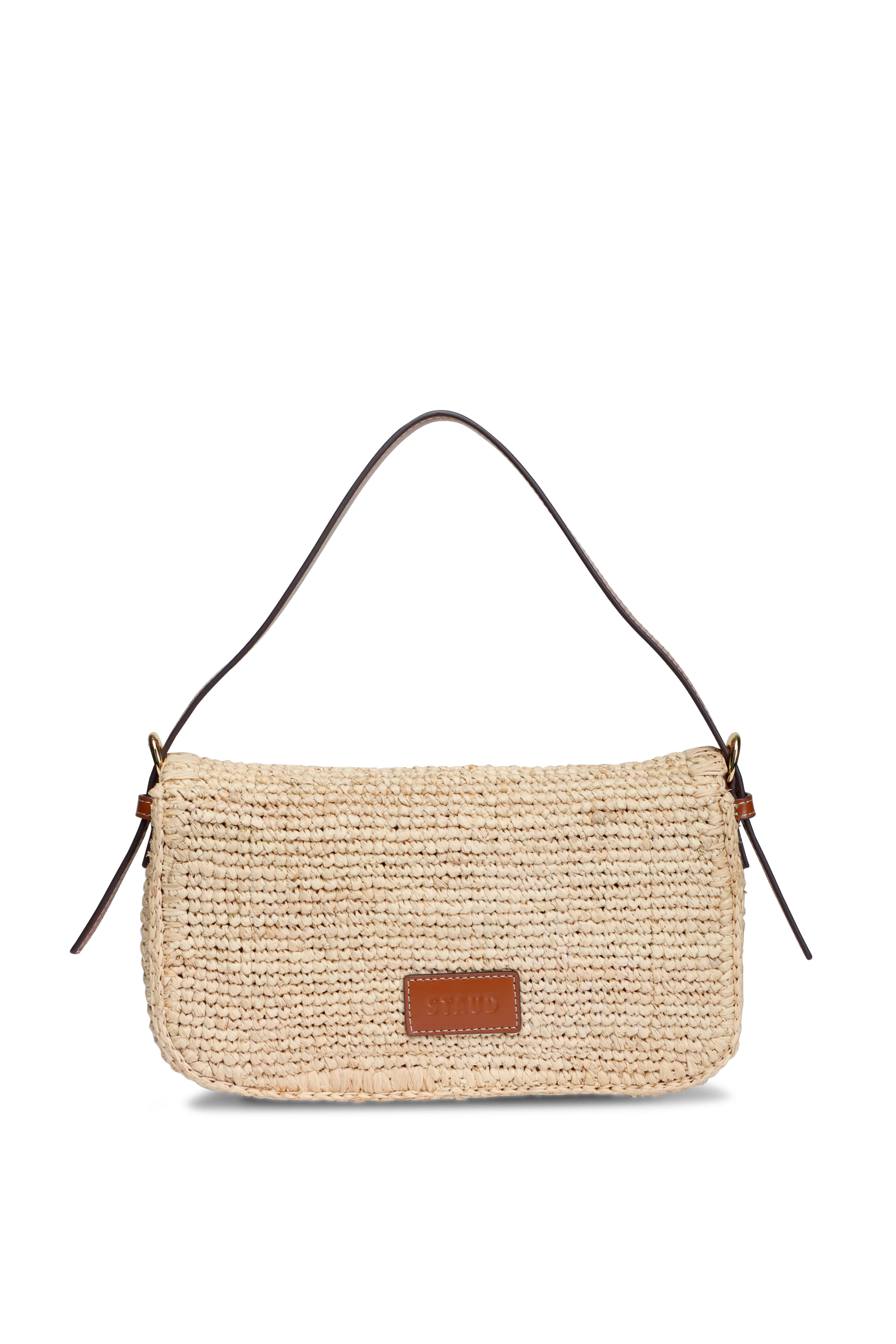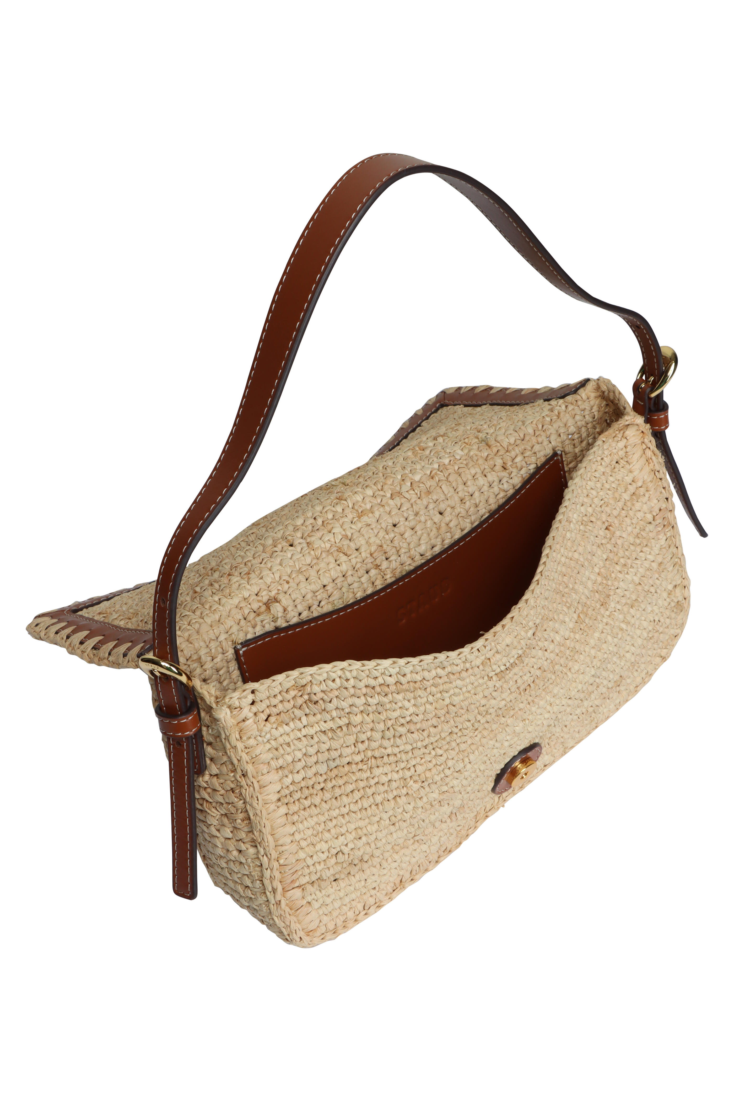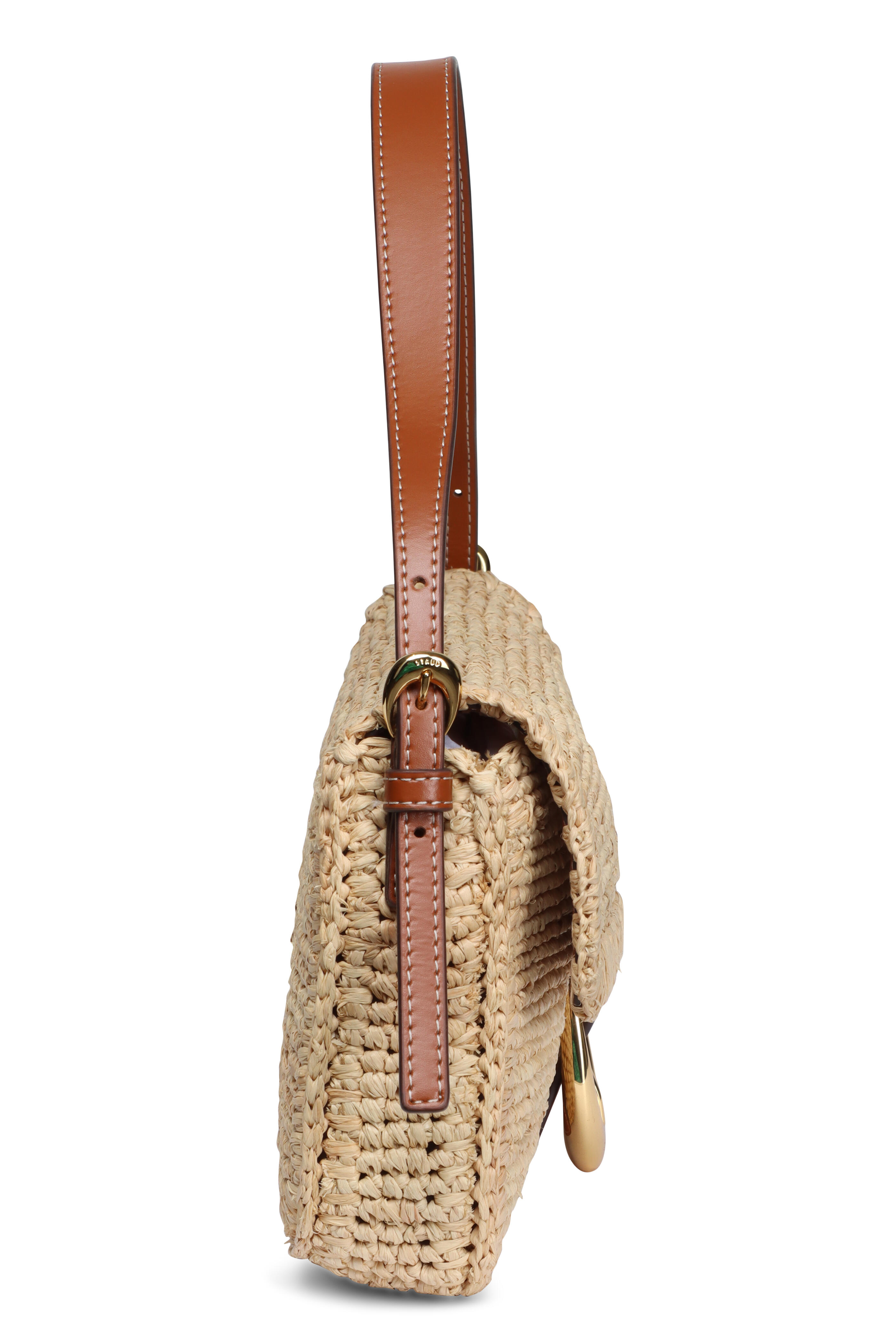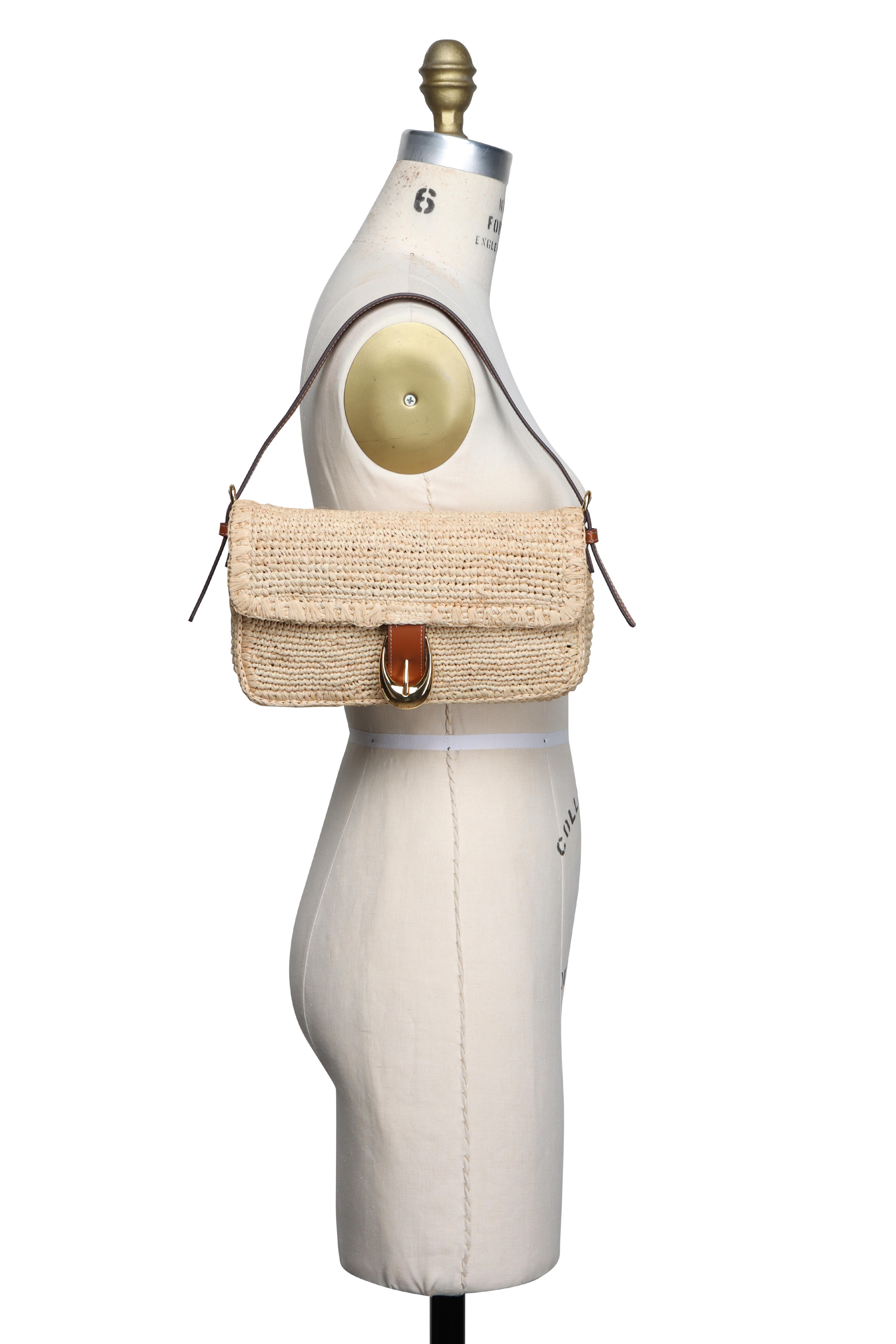 Unlined. Fold over flap; magnetic closure. Adjustable leather shoulder strap. Signature Moon buckle hardware. Interior leather wall pocket. Imported. Dimensions: 10.63" H x 6” L x 1.25" D. Shoulder drop: 6”. 100% Raffia outer.