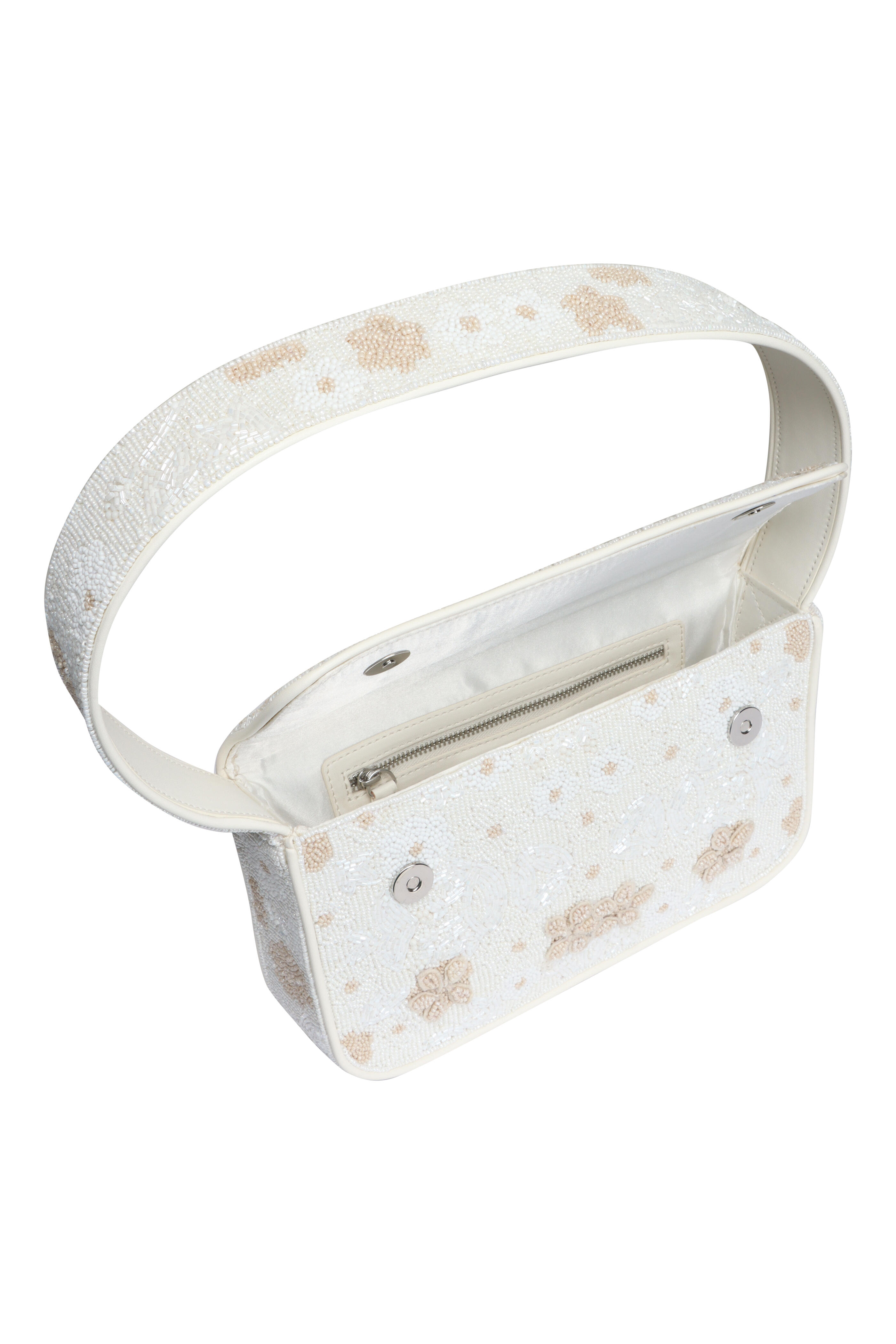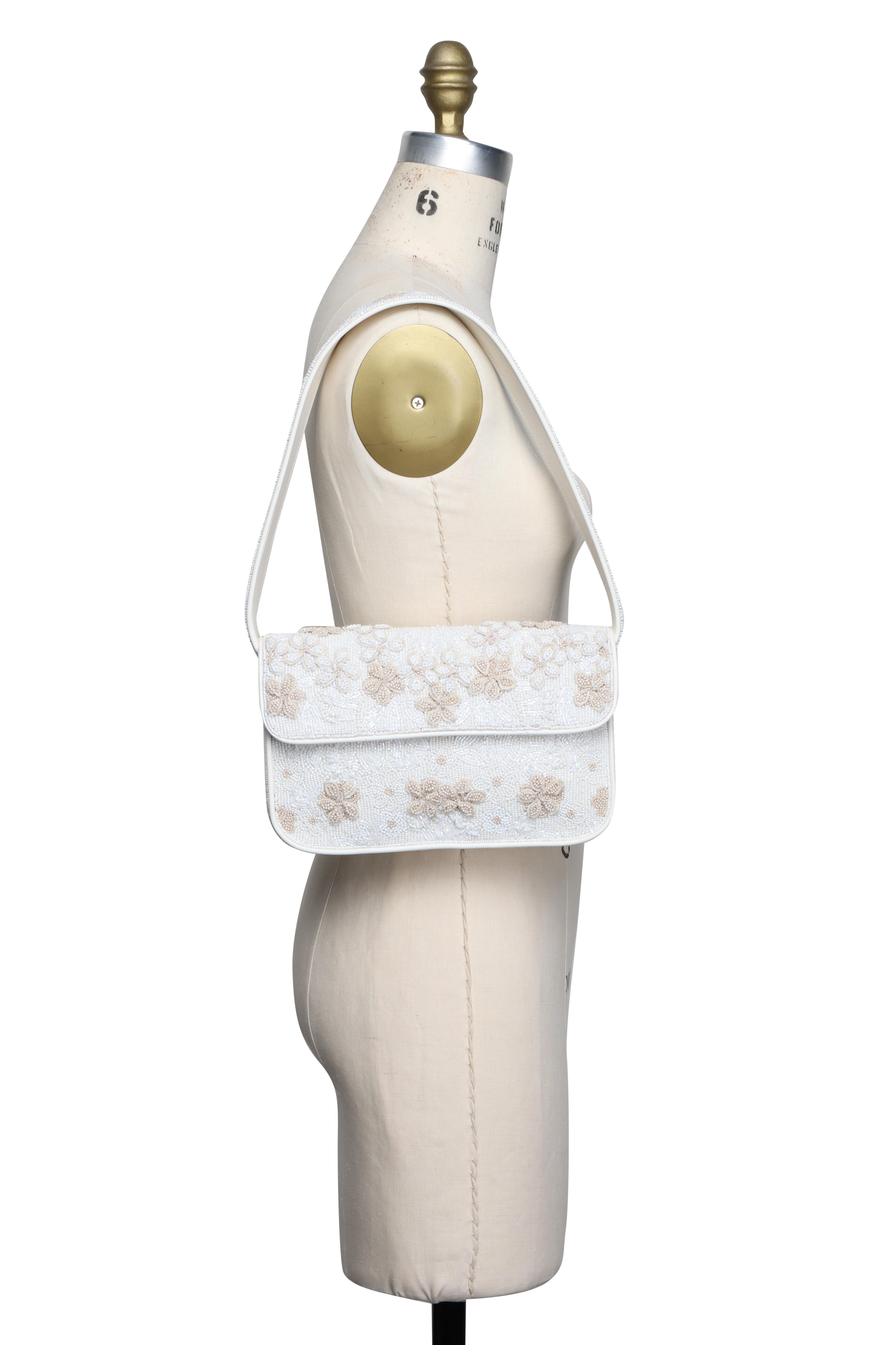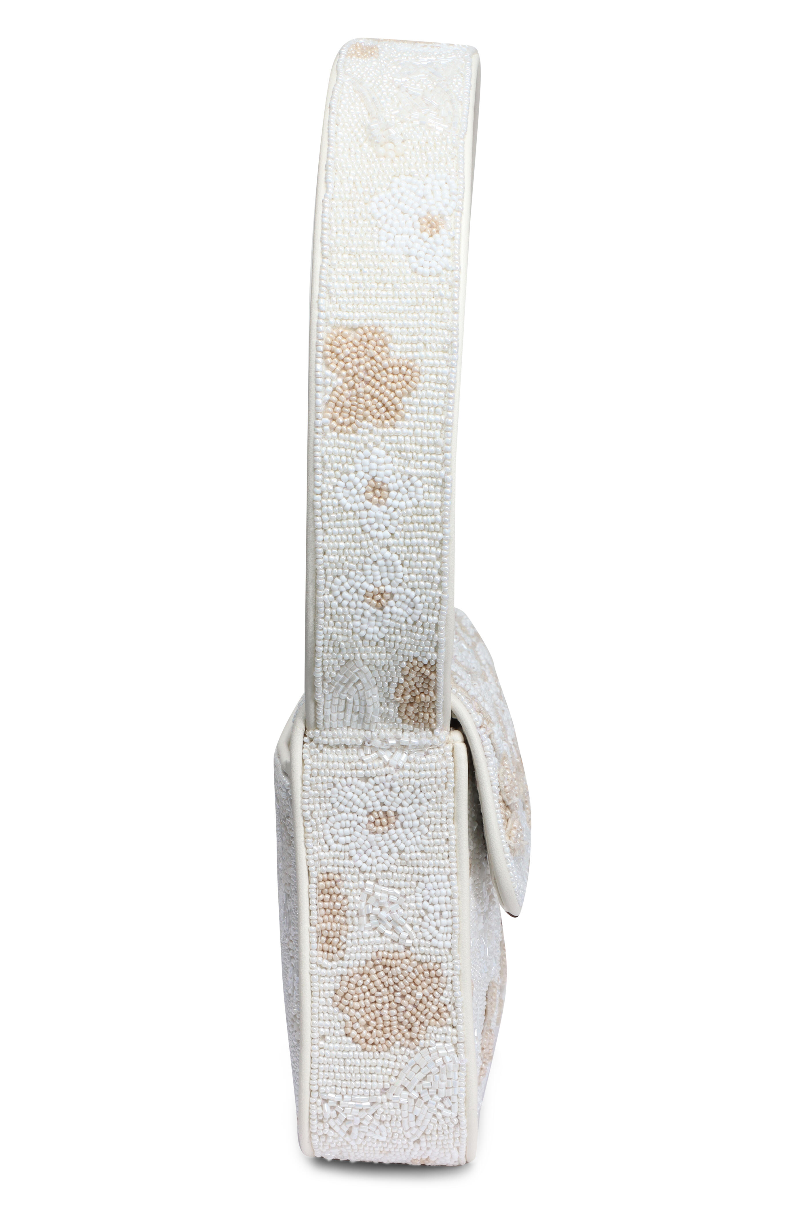Rayon lining. Fold over flap; magnetic closure. Top handle. Due to its unique nature, each piece’s artwork may vary slightly. Interior wall zipper pocket. Imported. Dimensions: 10” L x 6” H x 2” W. Shoulder drop: 8”. 100% Glass Beads outer.
