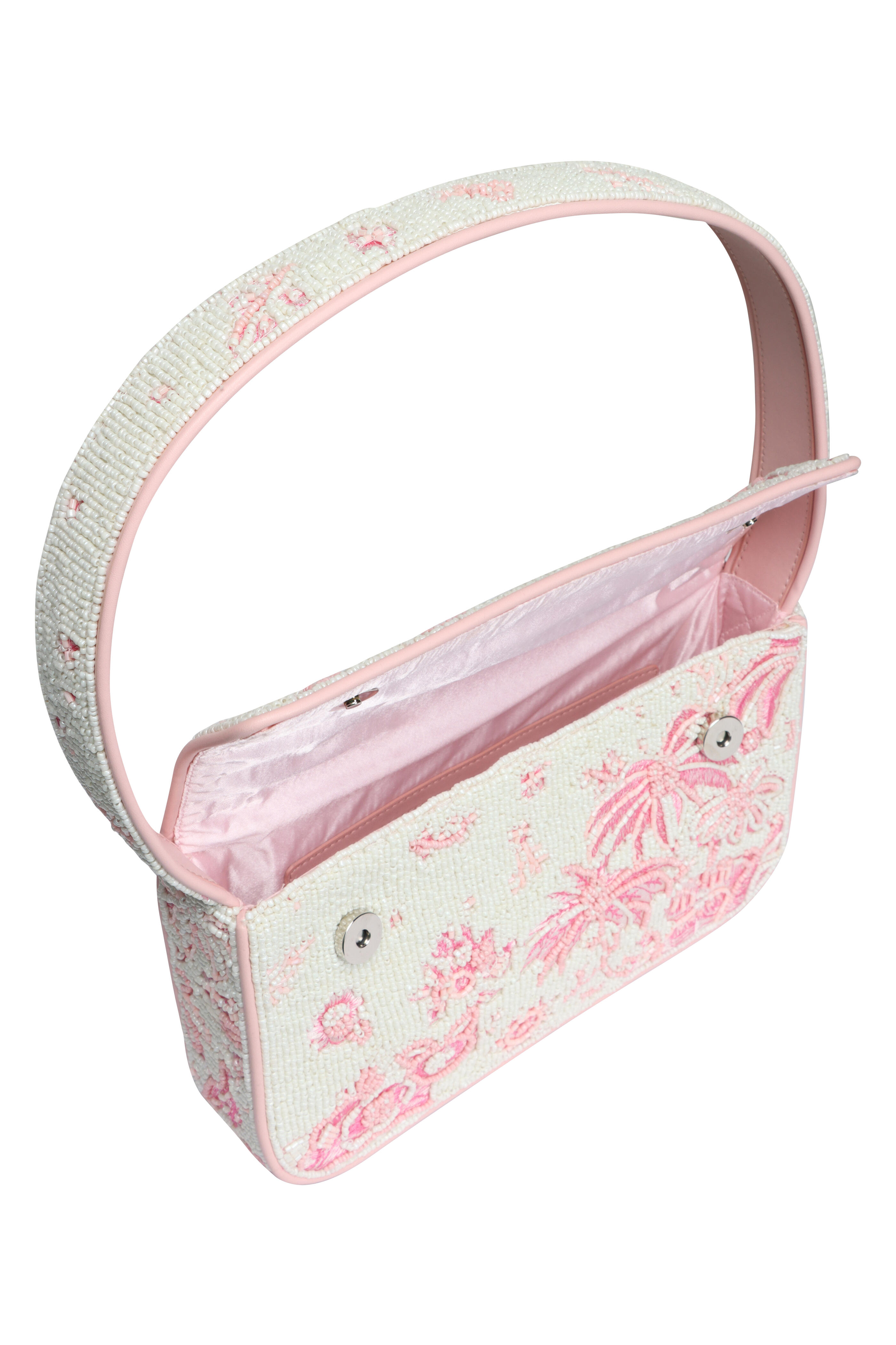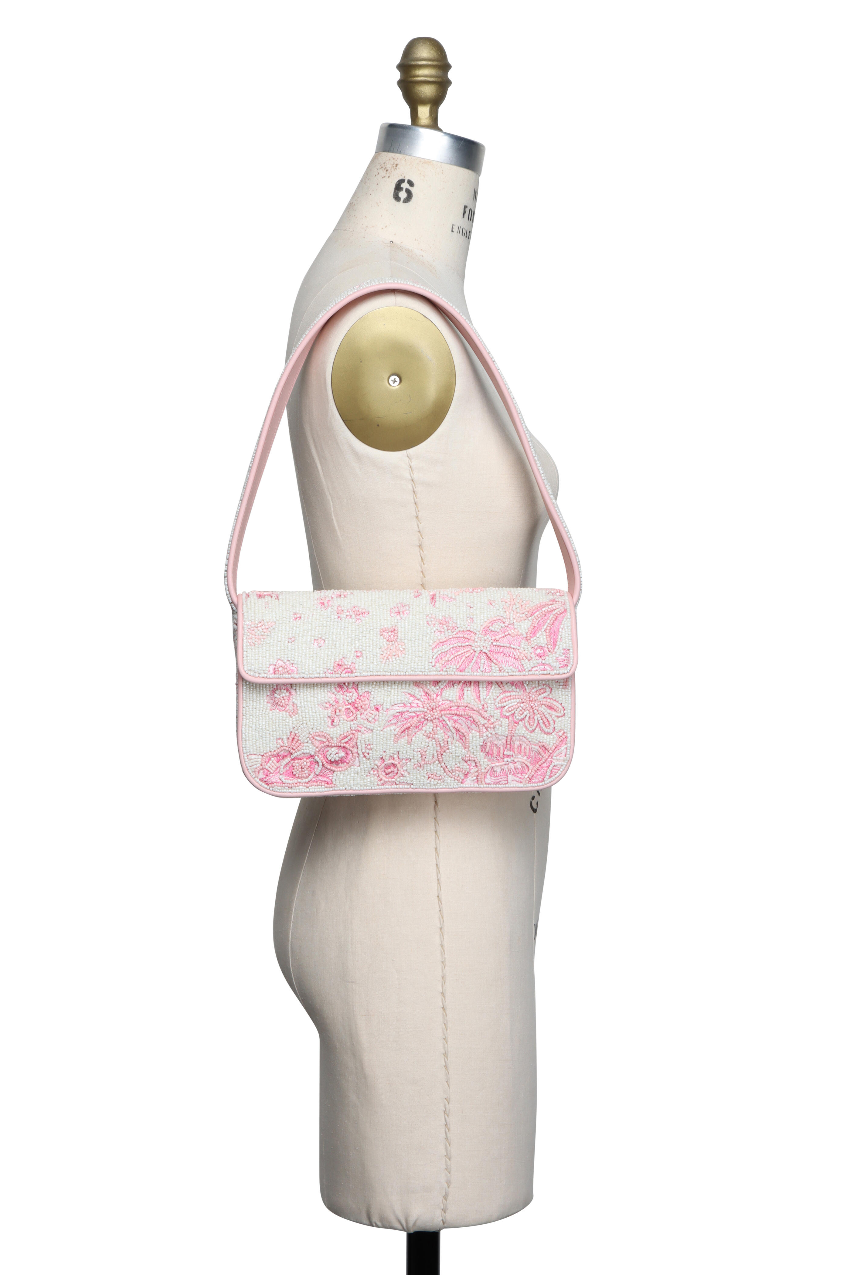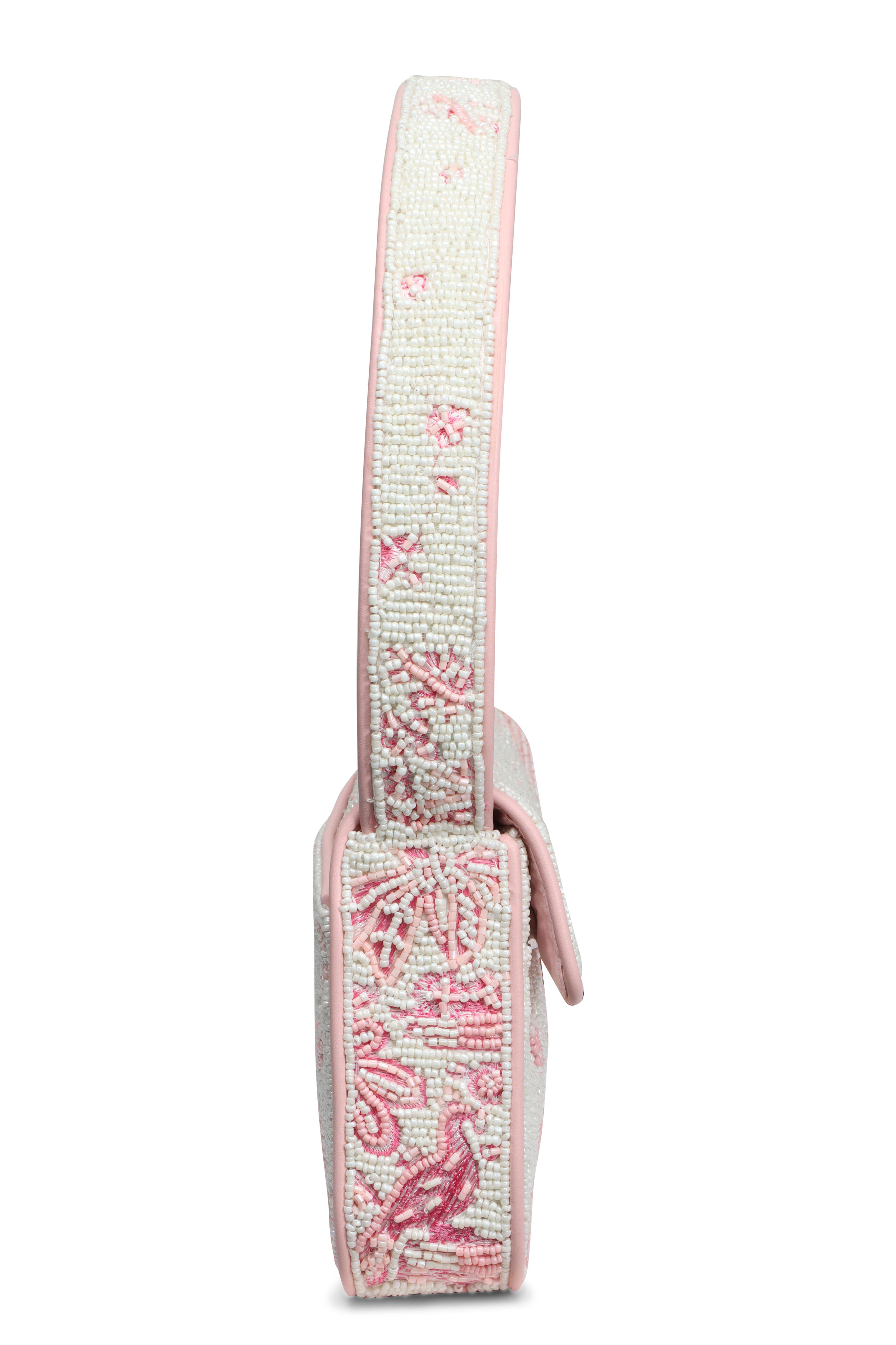 Rayon lining. Fold over flap; magnetic closure. Top handle. Due to its unique nature, each piece’s artwork may vary slightly. Interior wall zipper pocket. Imported. Dimensions: 10” L x 6” H x 2” W. Shoulder drop: 8”. 100% Glass Beads outer.