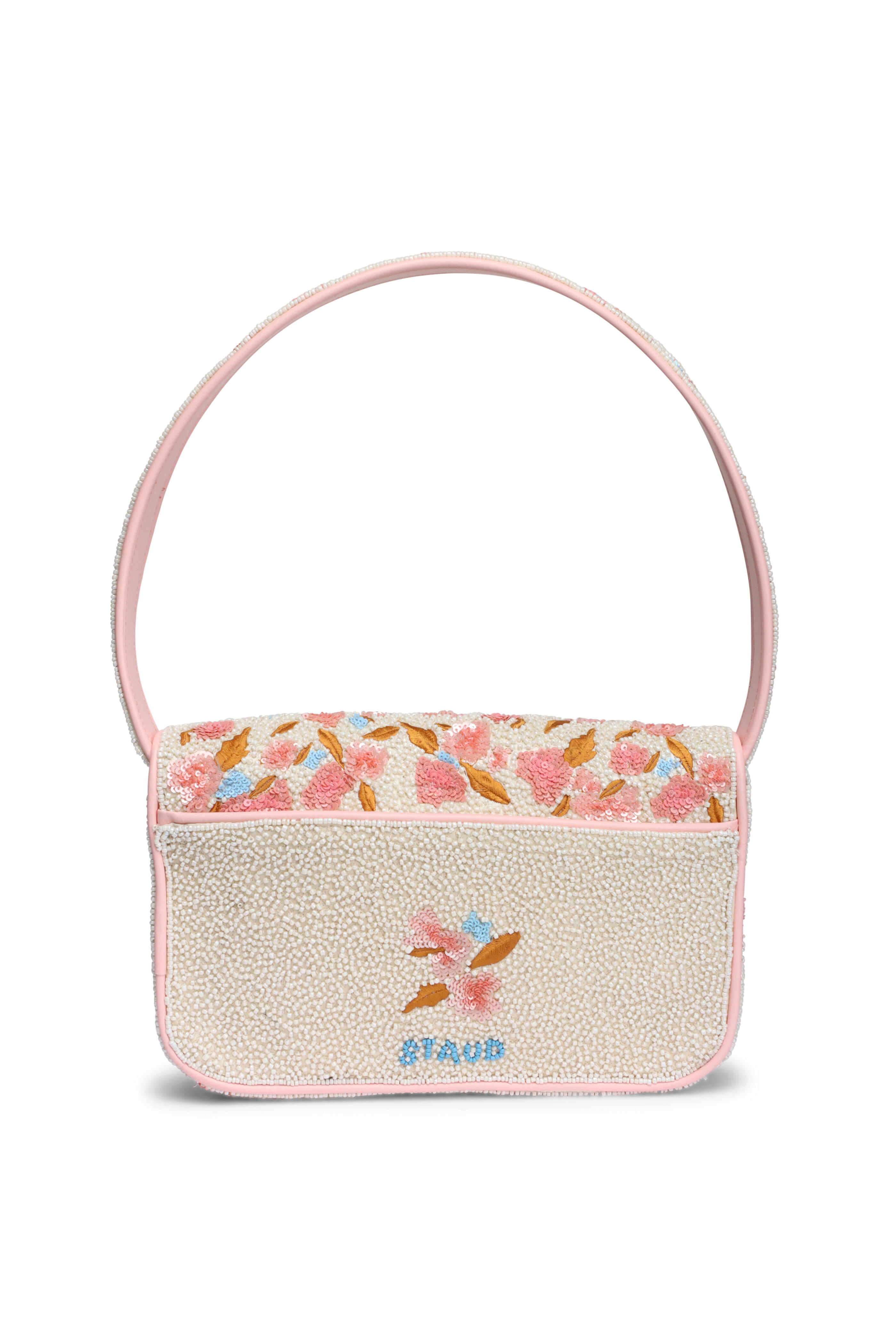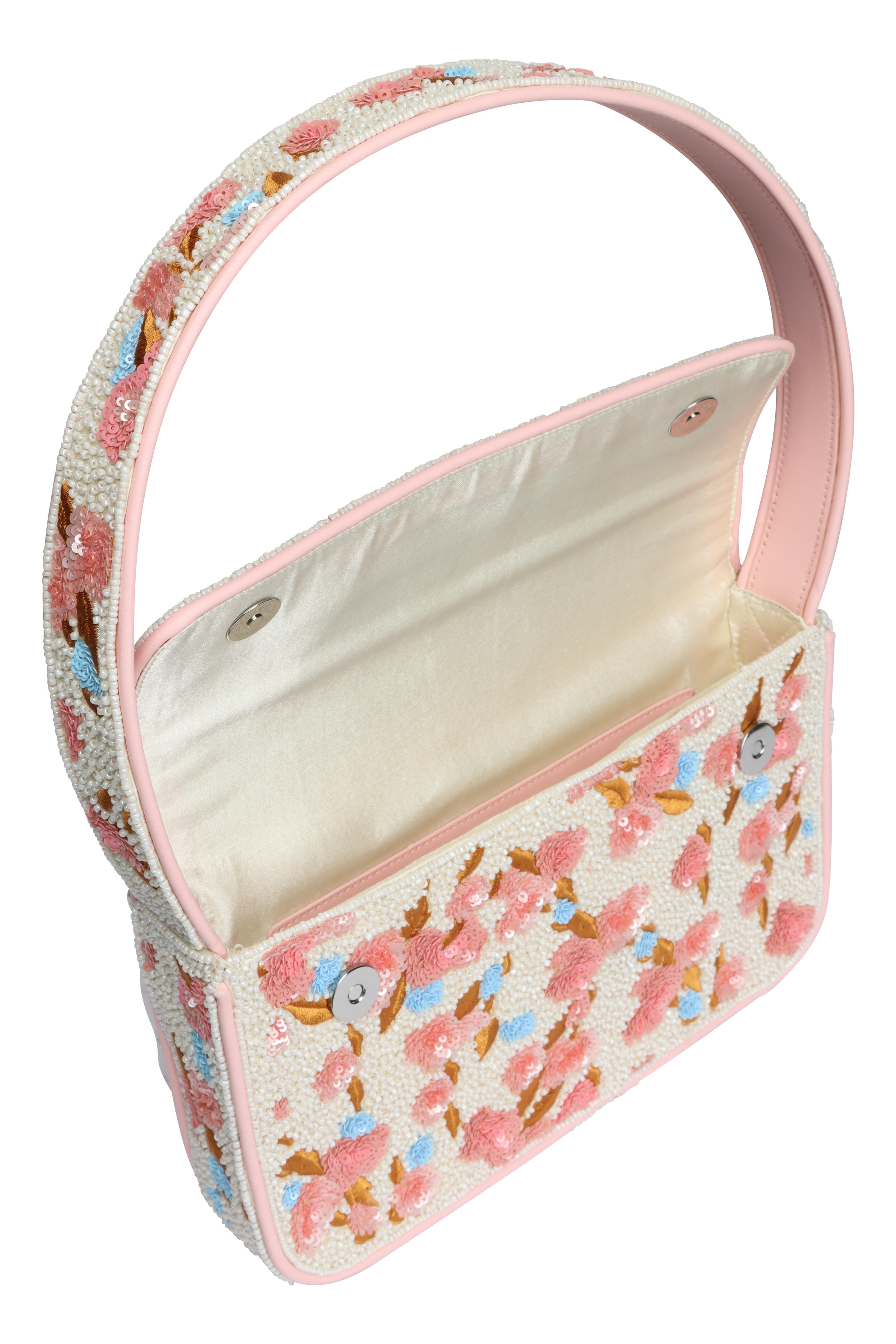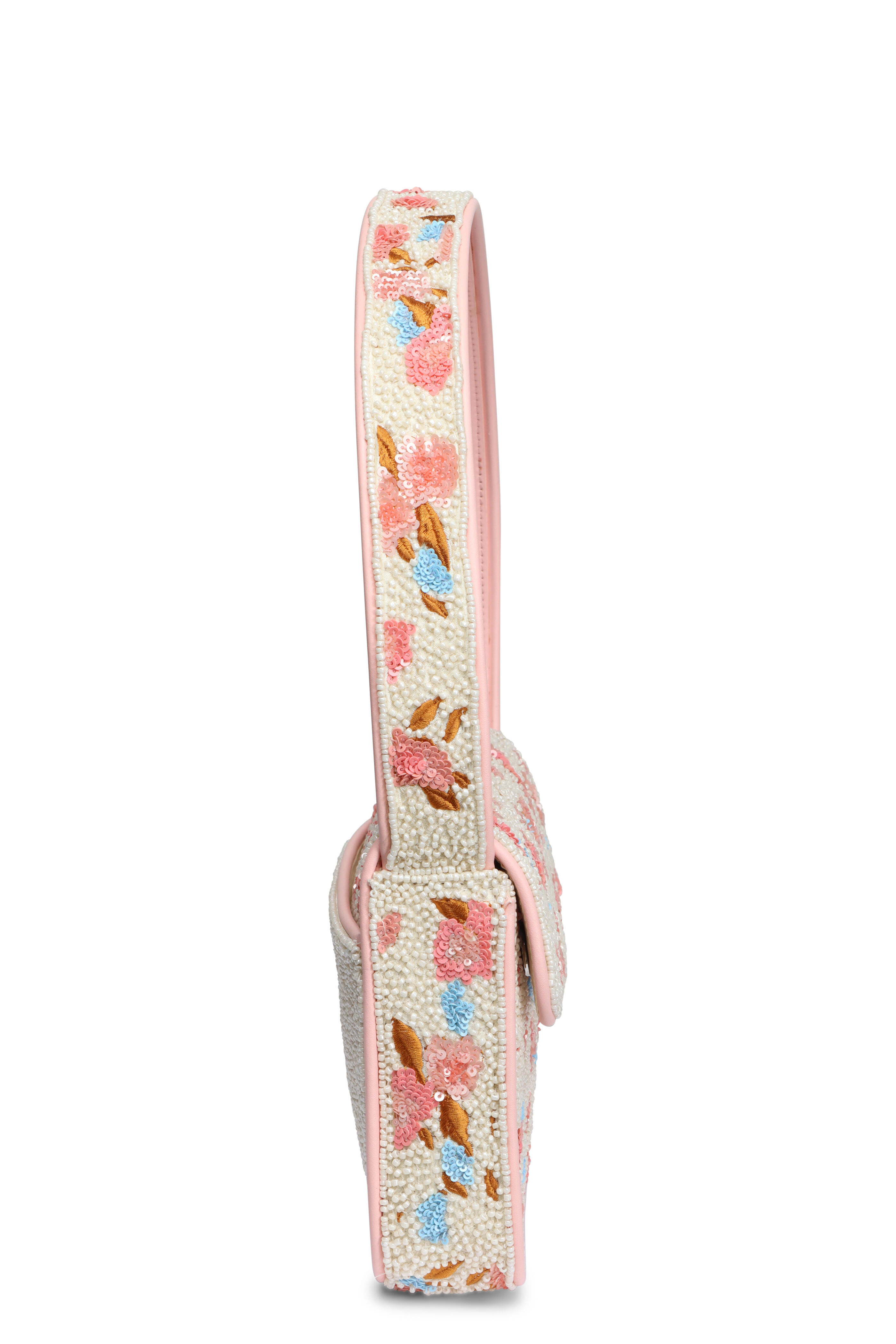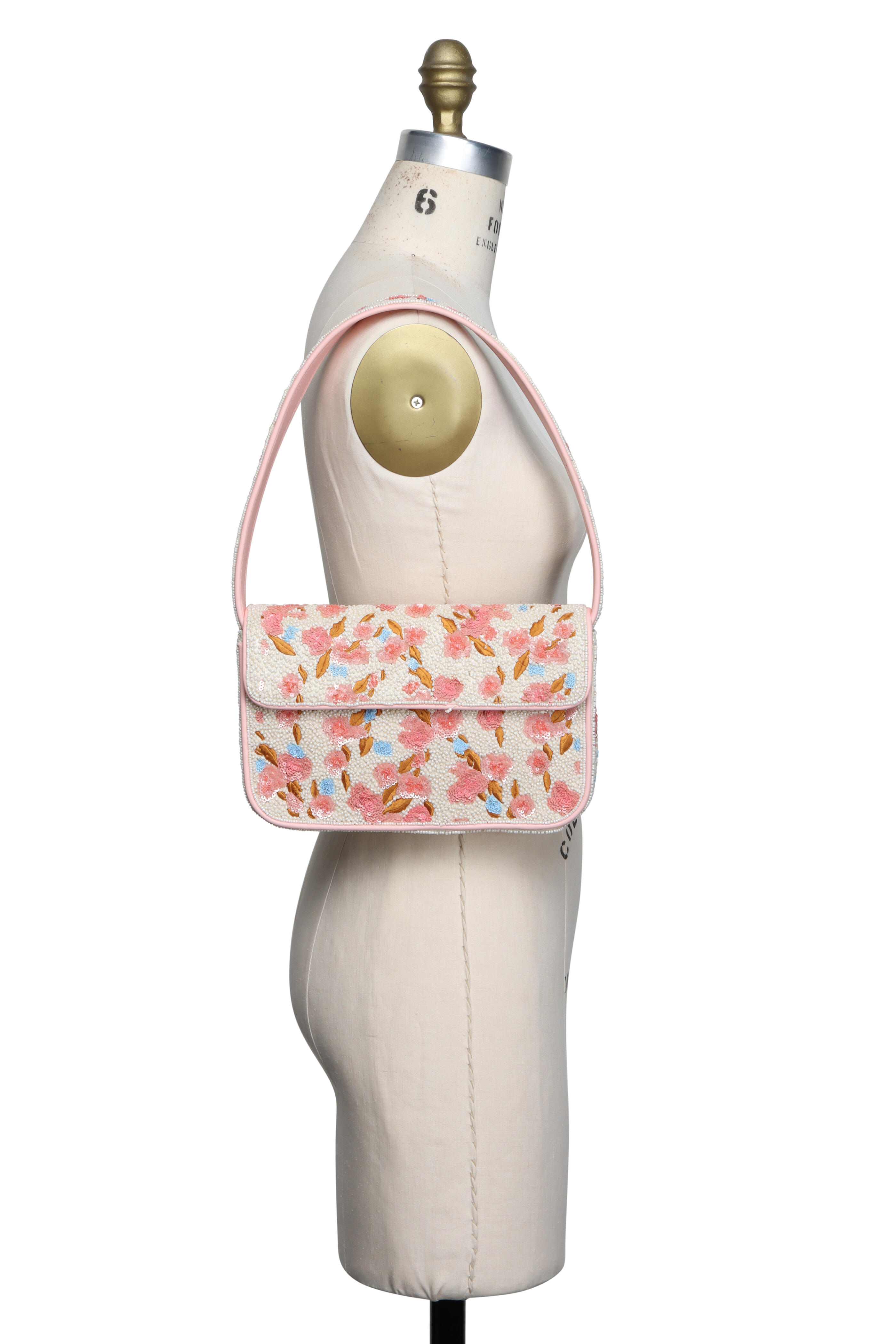 Rayon lining. Fold over flap; magnetic closure. Top handle. Due to its unique nature, each piece’s artwork may vary slightly. Interior wall zipper pocket. Imported. Dimensions: 10” L x 6” H x 2” W. Shoulder drop: 8”. 100% Glass Beads outer.