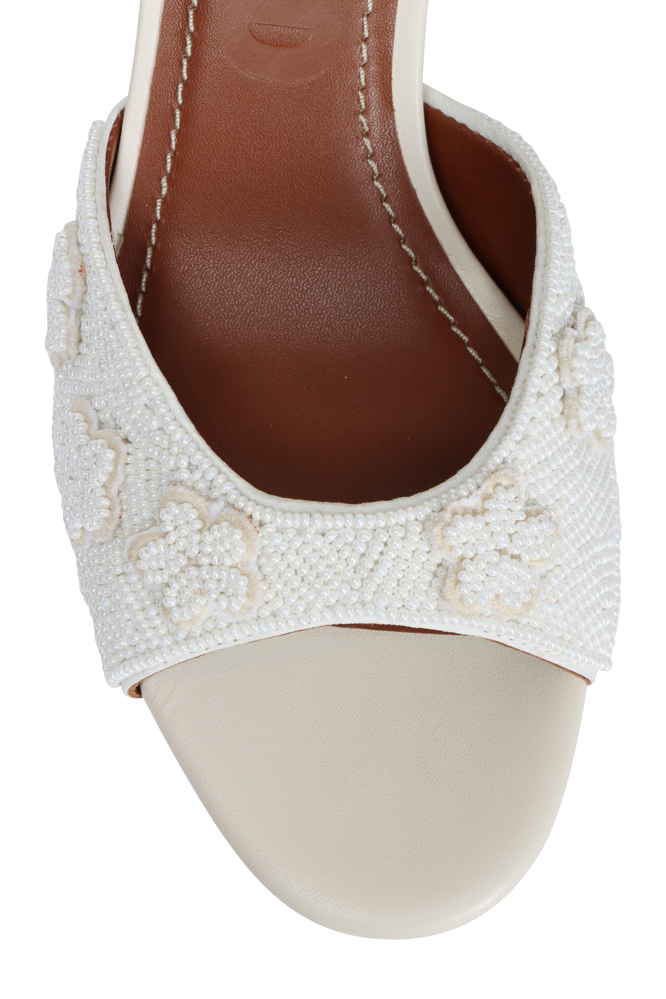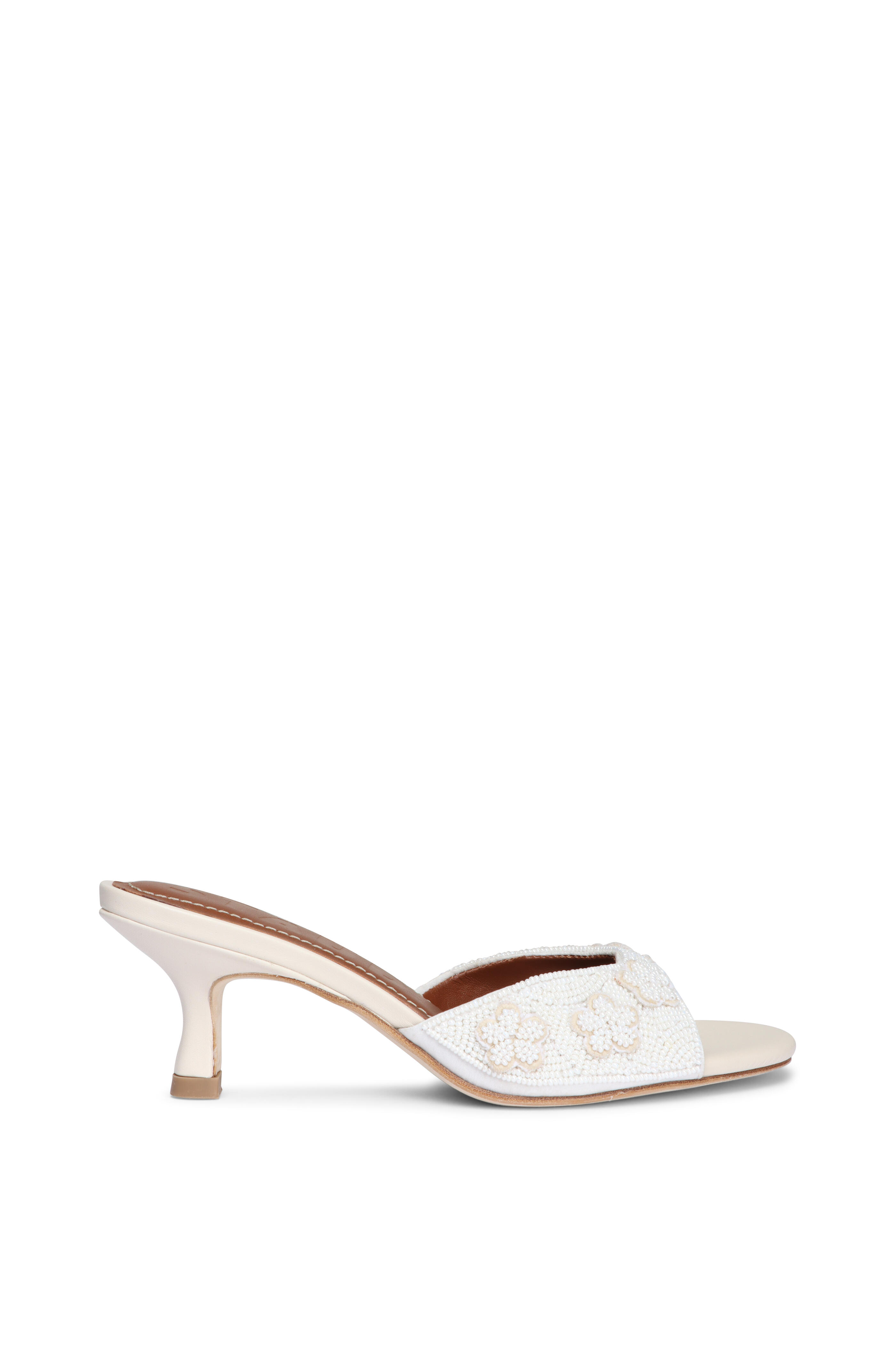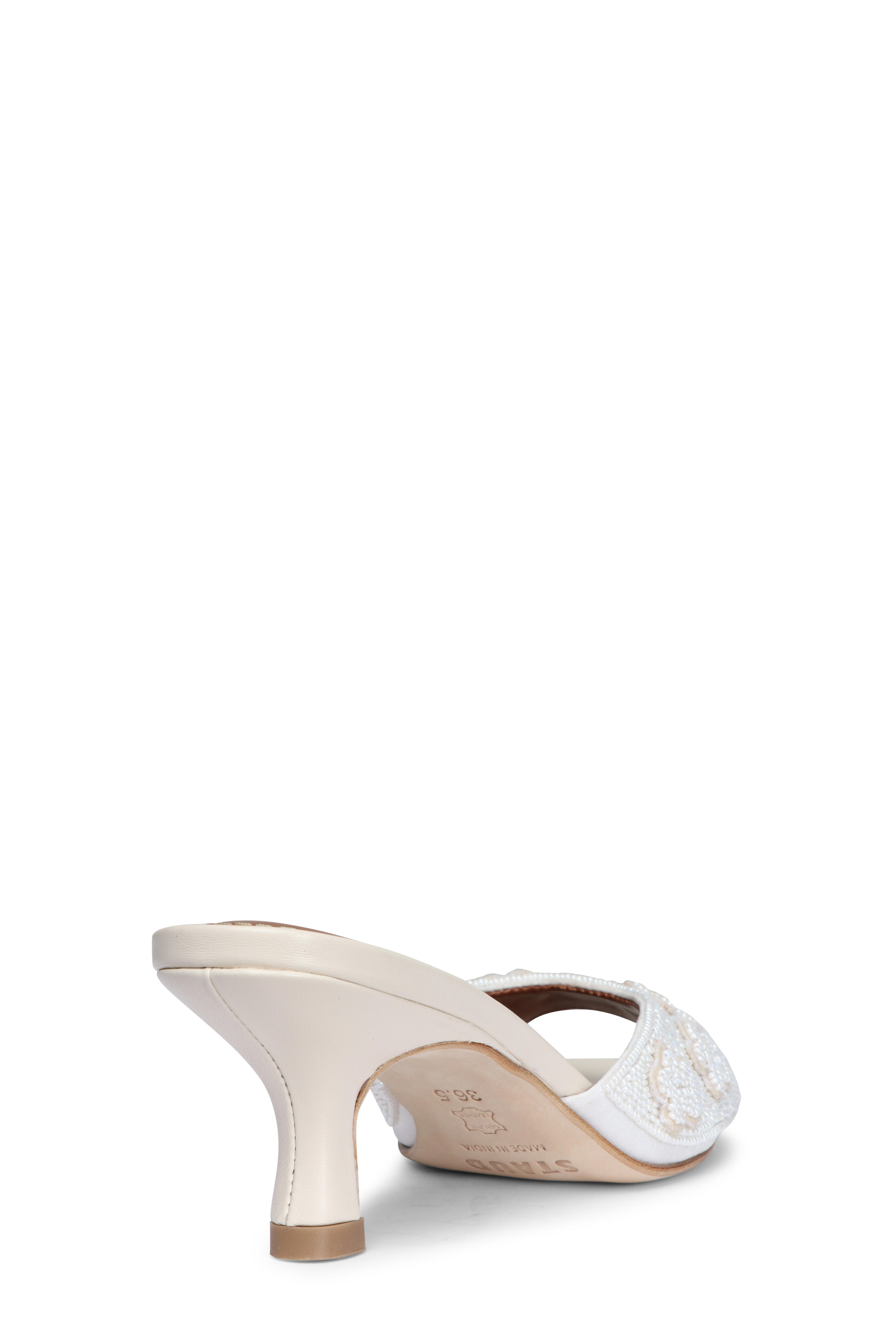 Glass beads and leather upper. Leather lining. Leather and rubber sole. Open toe. Slip-on style. Kitten heel. Imported. Heel measurement: 55mm.