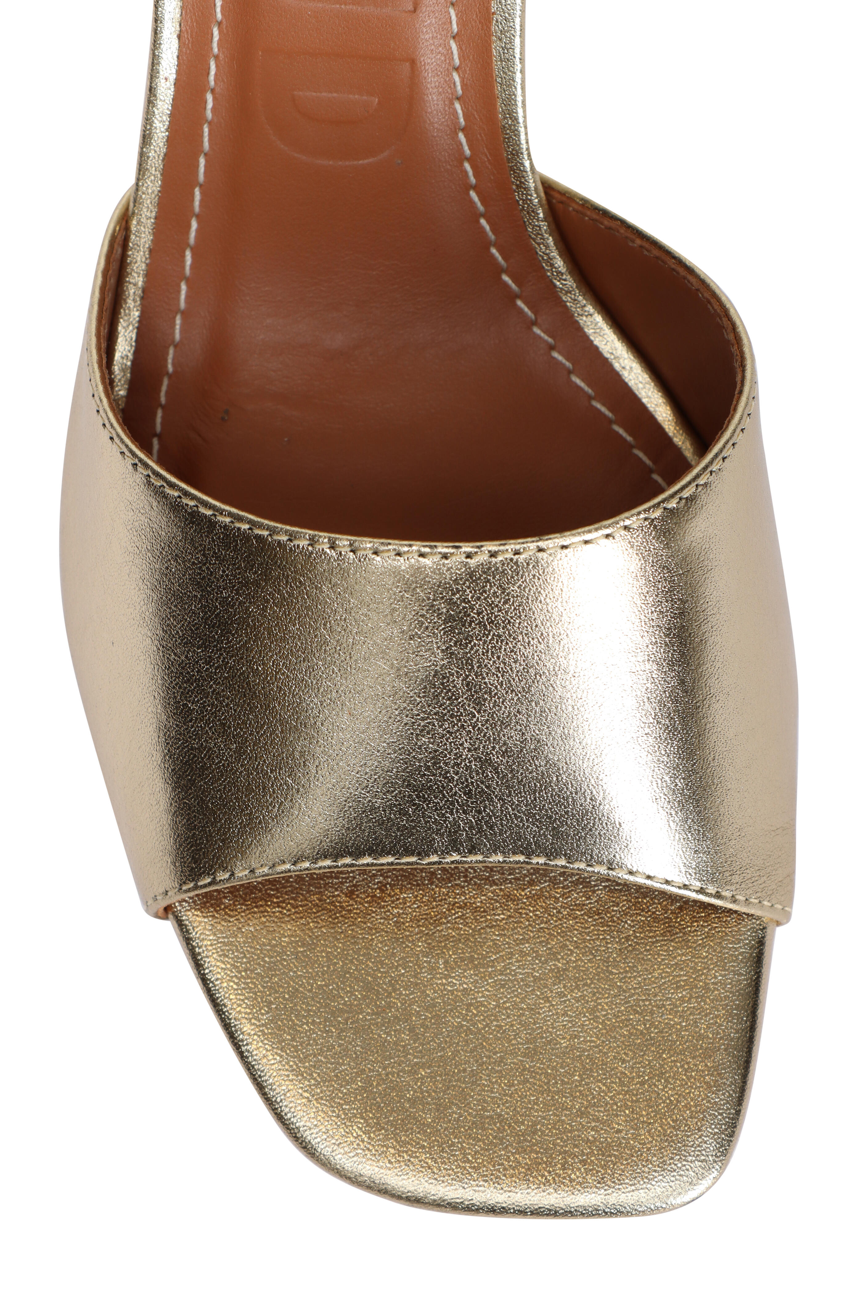 Metallic leather upper. Leather lining. Leather and rubber sole. Open toe. Slip-on style. Imported. Heel measurement: 65mm.
