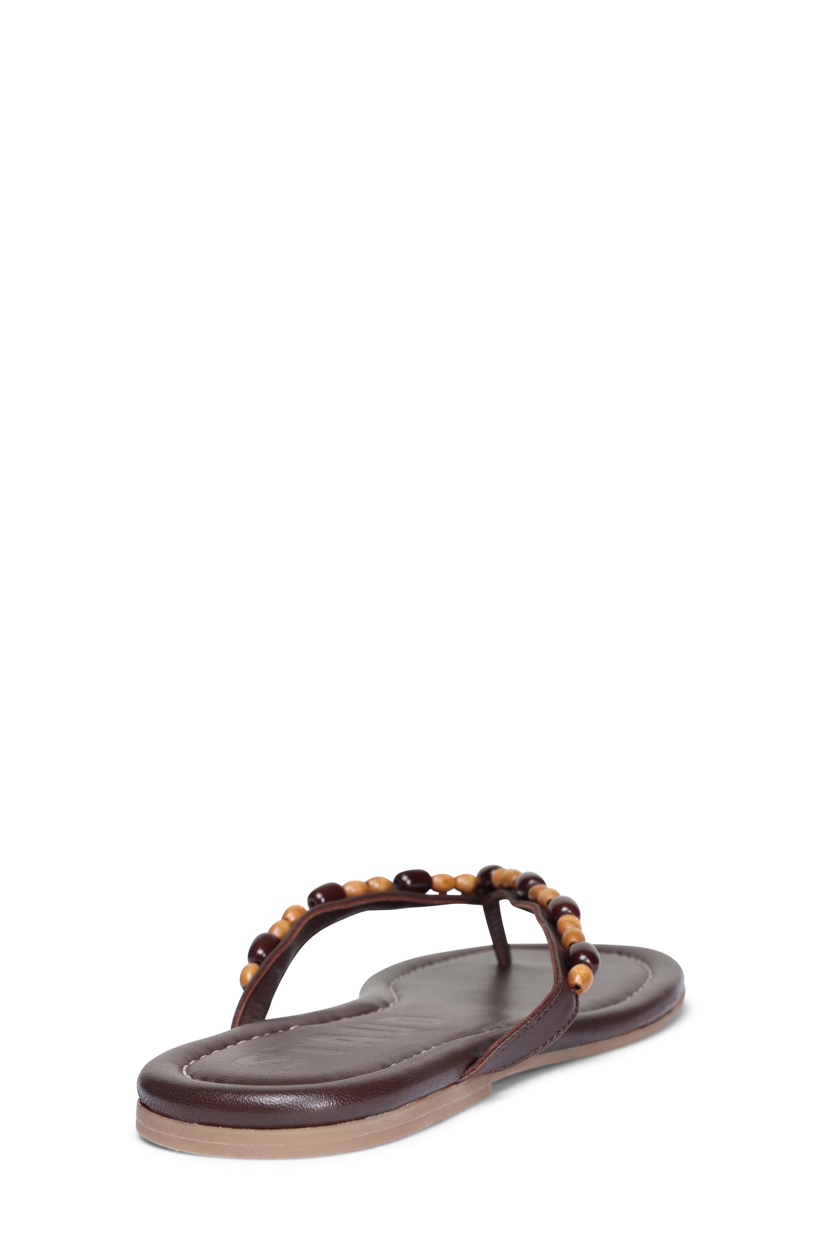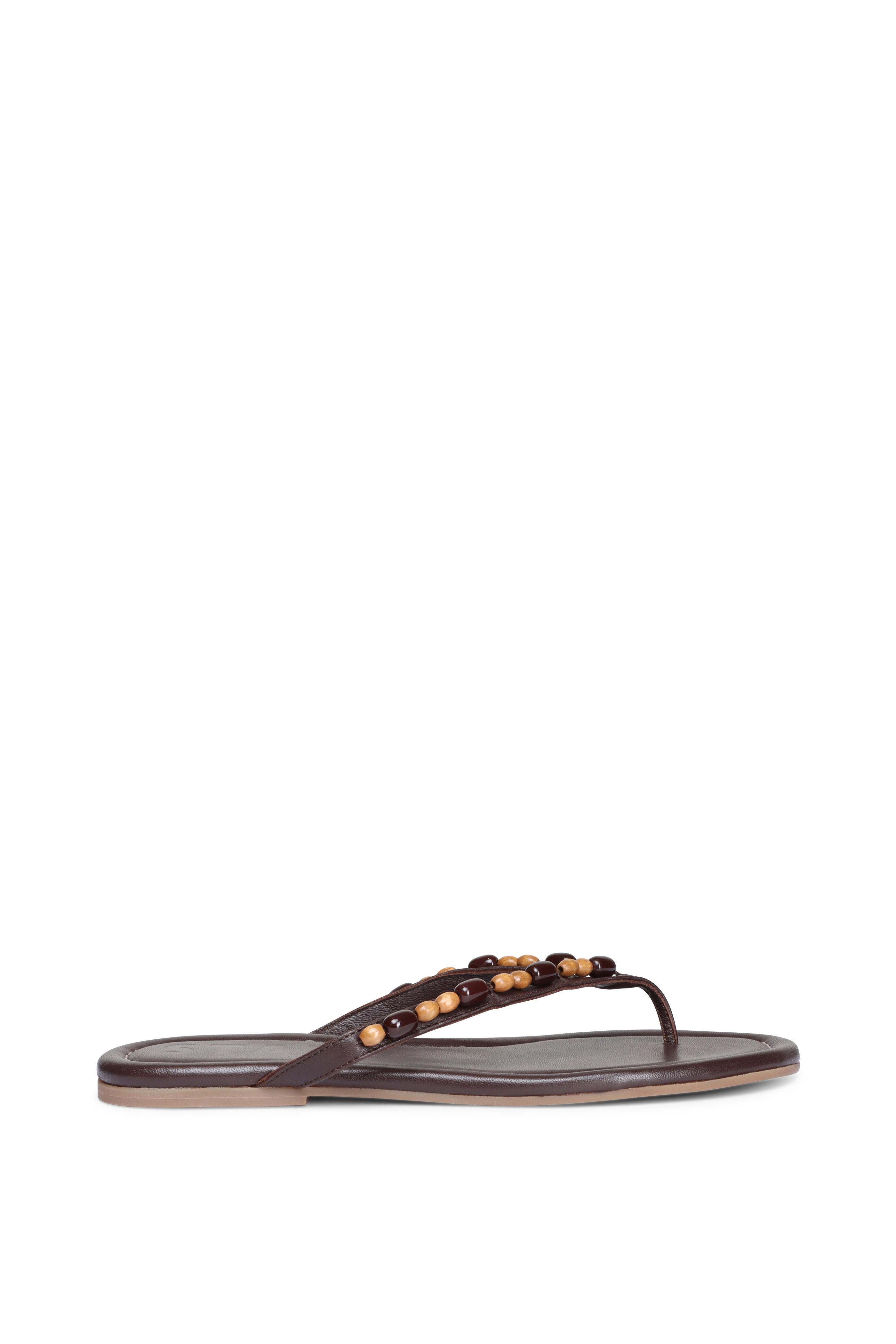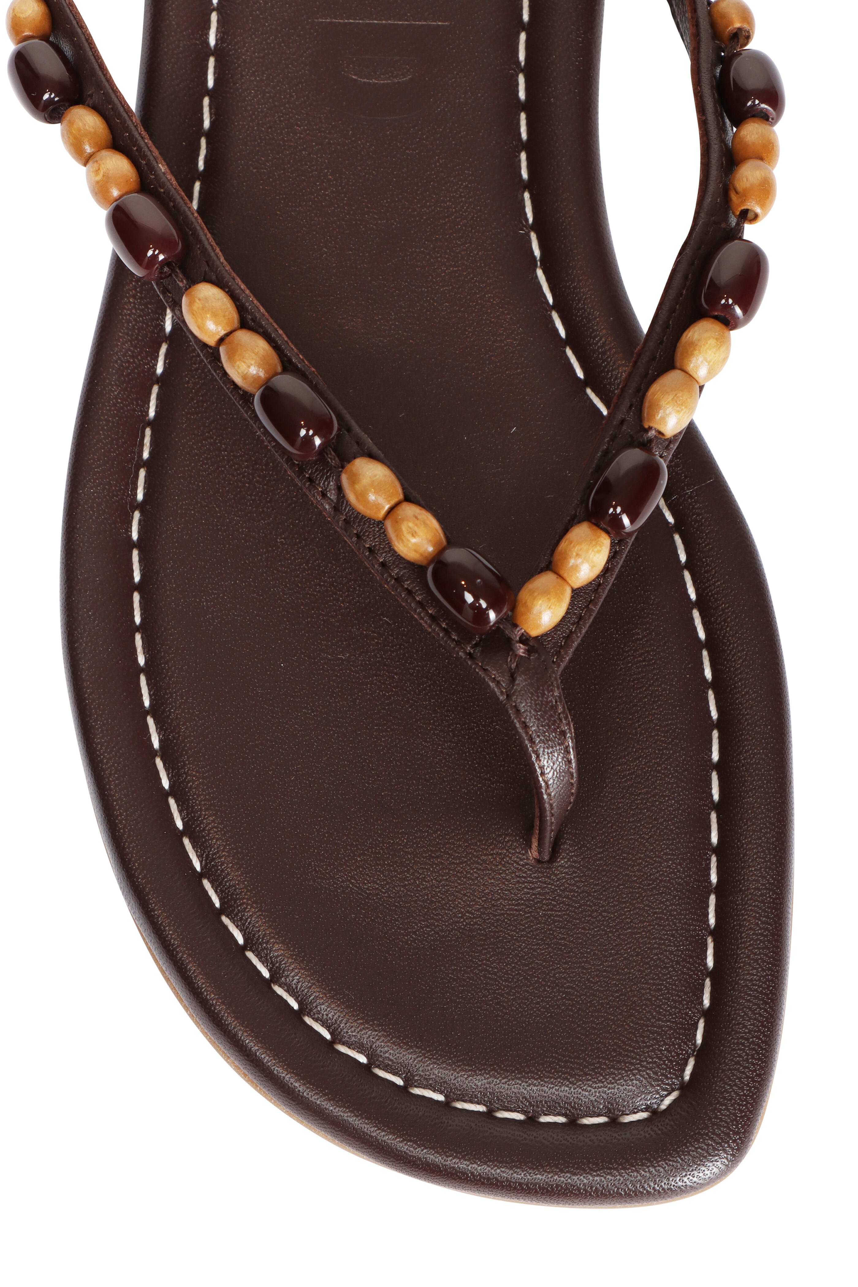 Lamb leather upper and lining. Rubber sole. Open toe. Wooden bead design. Slip-on style. Imported.