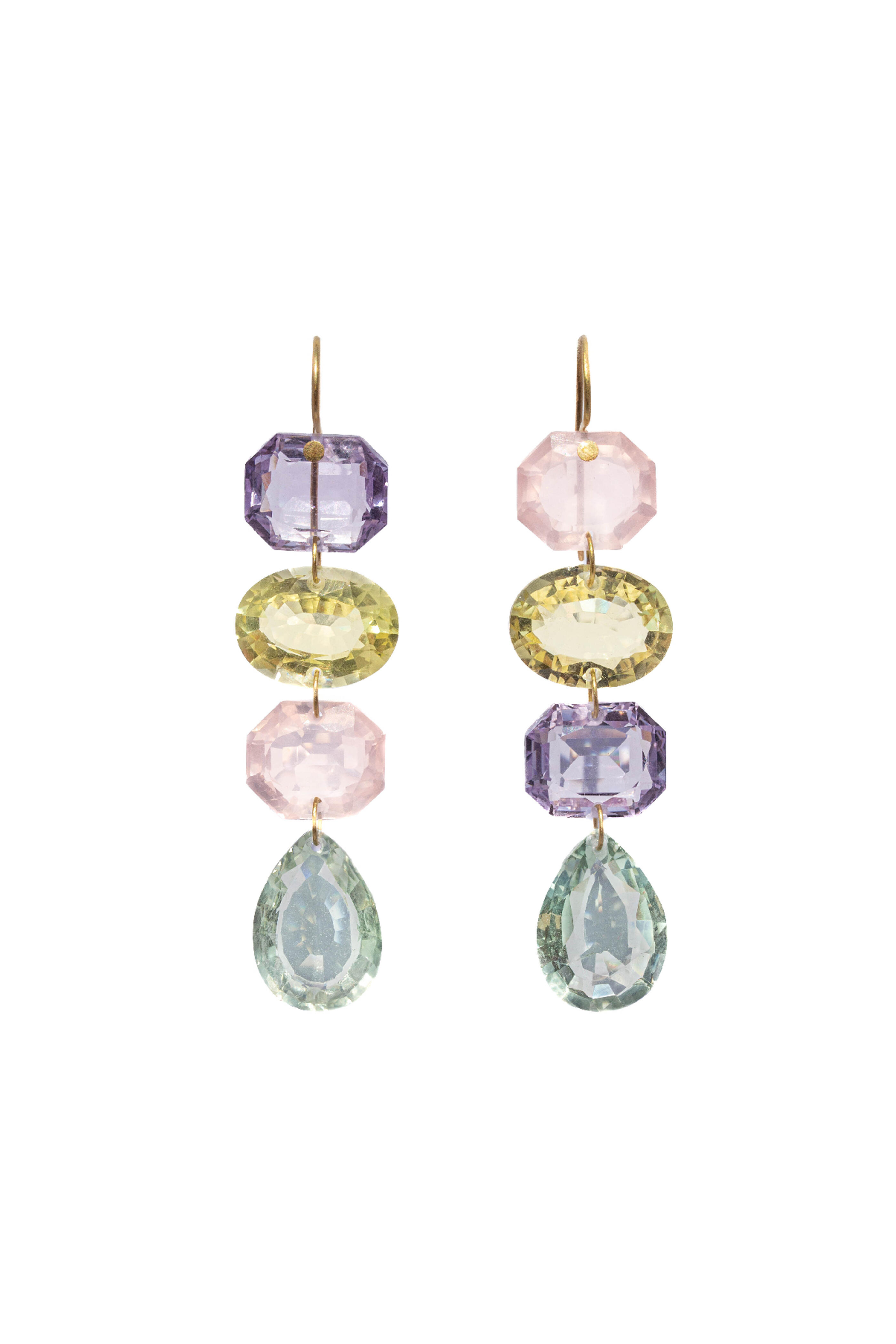 22k gold. Rose quartz. Lemon quartz. Amethyst. Green quartz. Rough cut gemstones. Drop style. Wire back. Made in India. Dimensions: 5.8cm X 1.7cm.