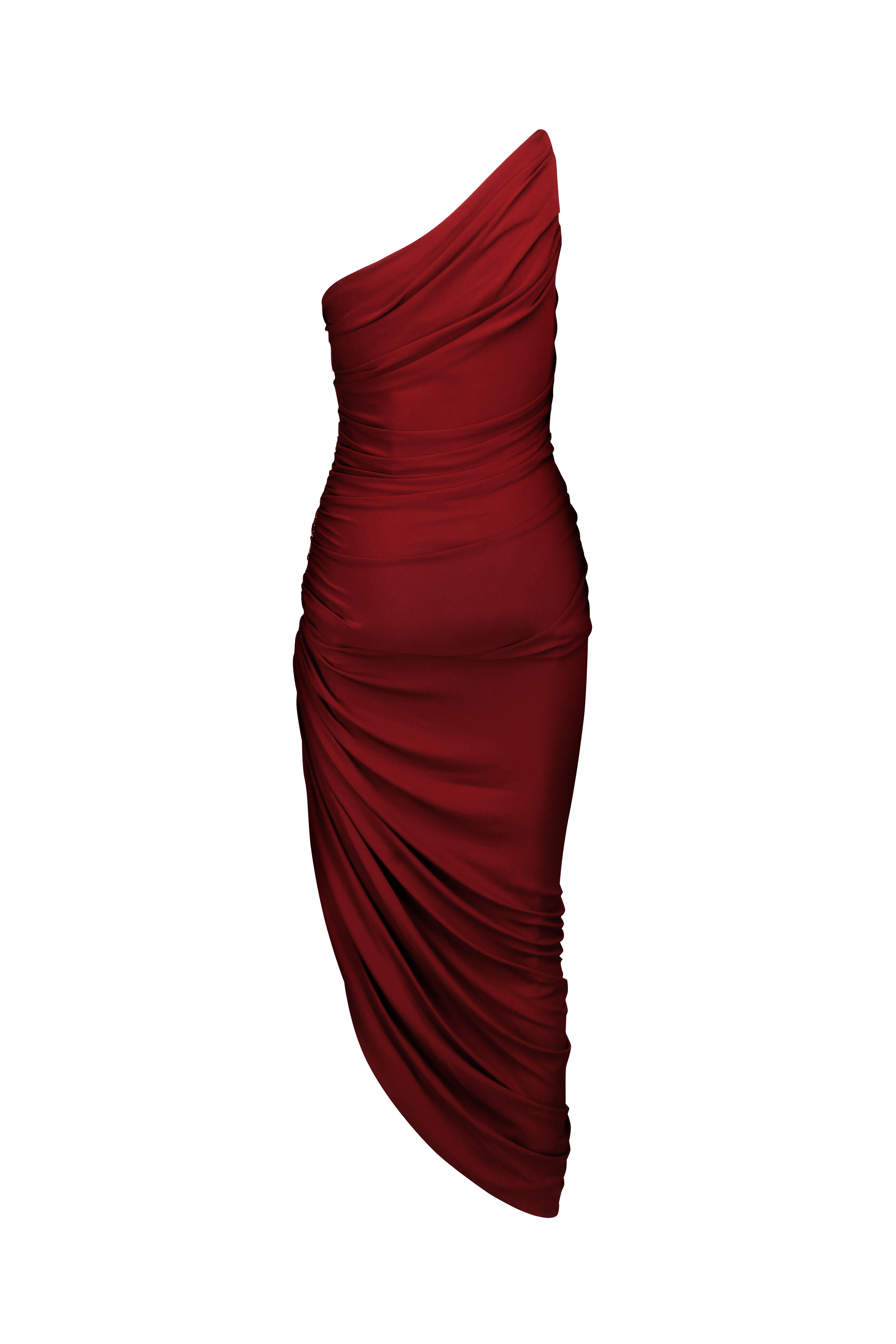 One-shoulder neckline. Sleeveless. Exposed zip fastening at the side. Side slit. Body-skimming silhouette. Hem falls below the knee. Imported. Close fit, midi length. 96% viscose, 4% elastane. Dry clean.