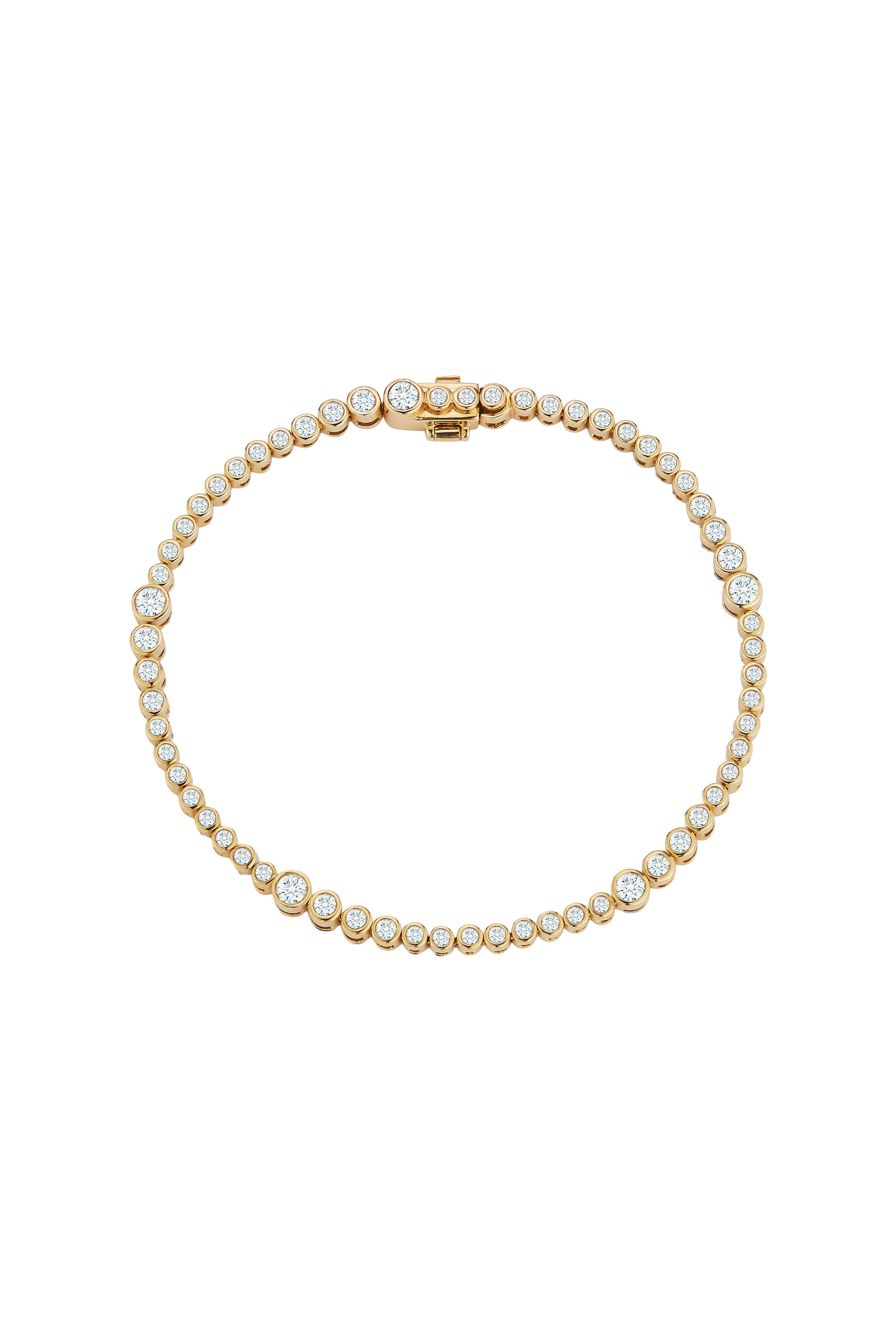 A modern reimagining of the classic diamond tennis bracelet, the Rainsun Tennis Bracelet features a mesmerizing arrangement of graduated, bezel-set diamonds, designed to catch and reflect light with every movement. Expertly crafted in 18K gold, this elegant fine jewelry piece drapes fluidly around the wrist, creating a radiant shimmer. Perfect for stacking or wearing solo, this diamond bracelet is a timeless statement of sophistication and innovation.