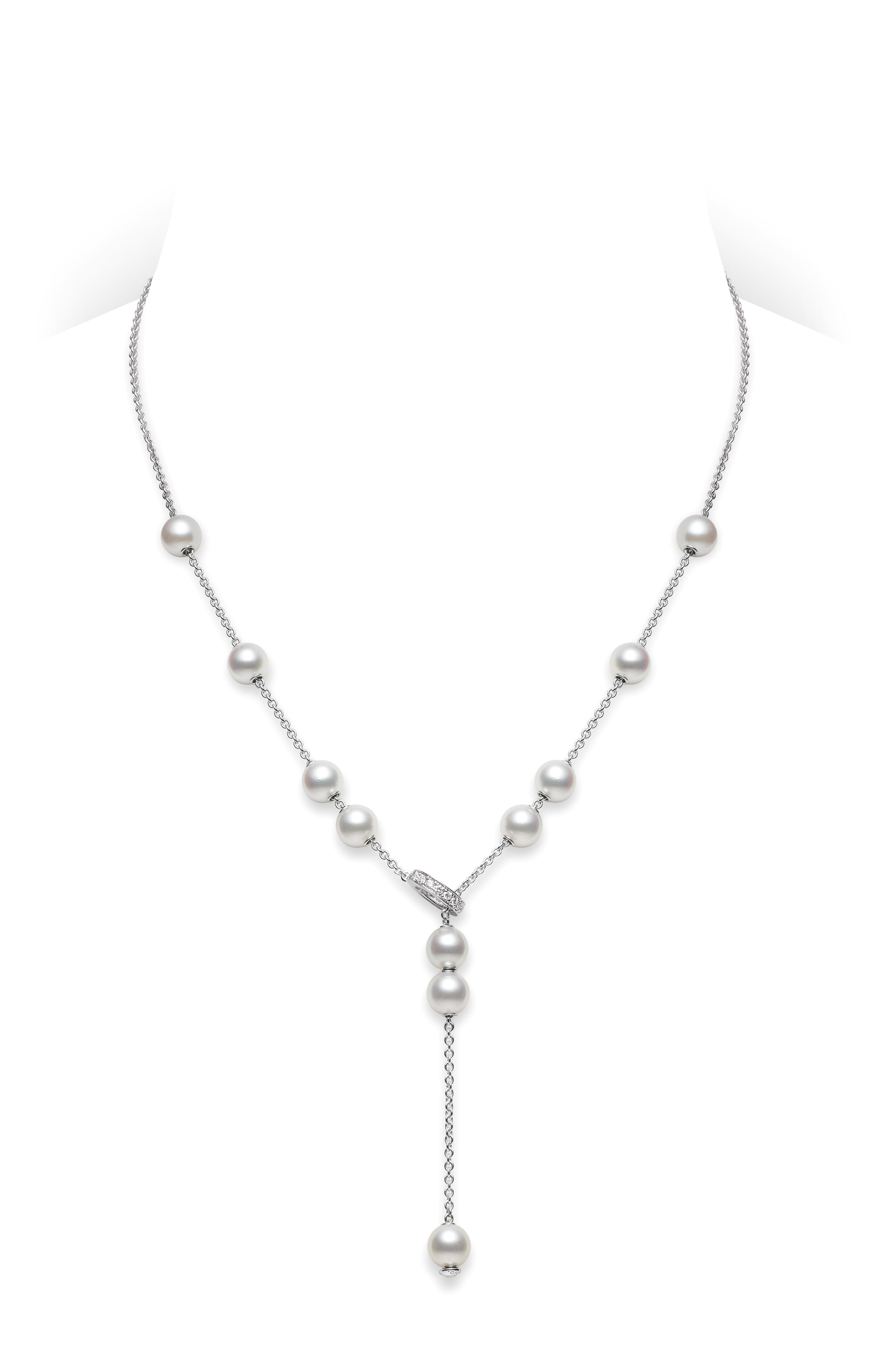 18k white gold. 11 7mm Akoya pearls. .20cts of white diamonds. Measures 19" in length.