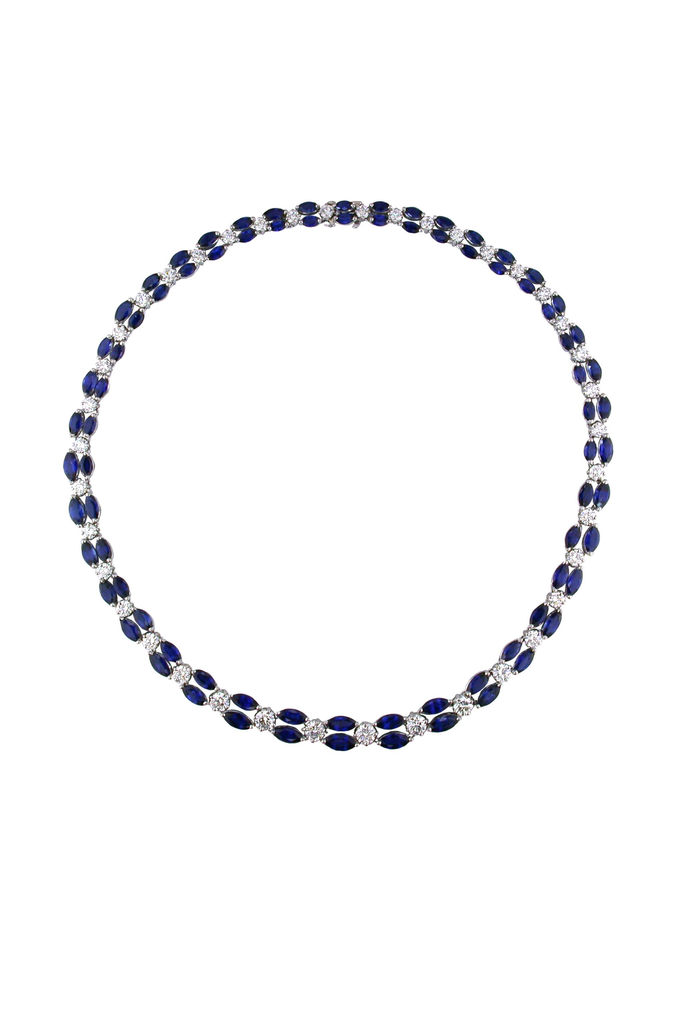 Platinum. 41.71cts 80 marquise-cut blue sapphires. 9.64cts 40 round-cut white diamonds.