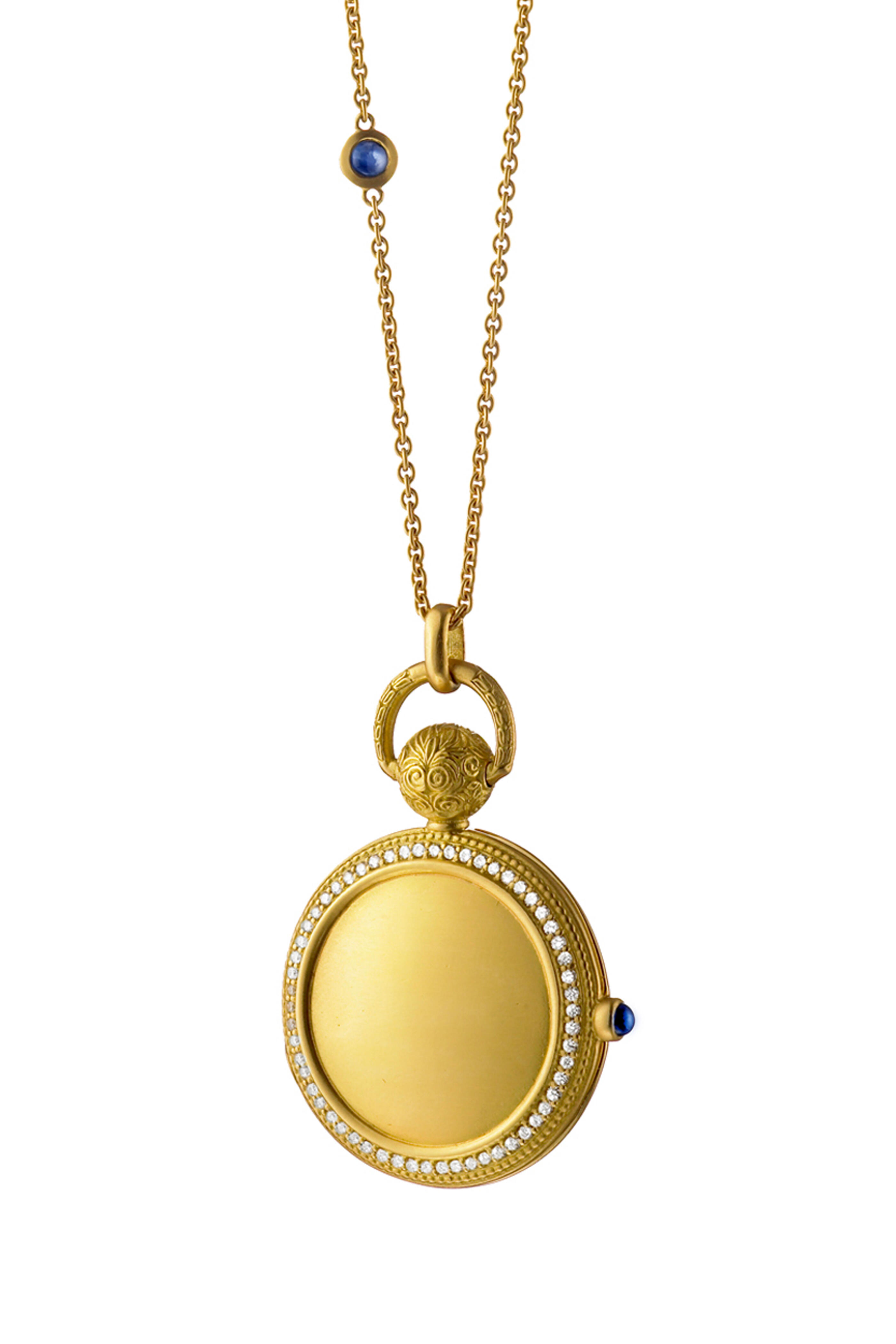 18k yellow gold. Blue sapphire. Pave diamonds.