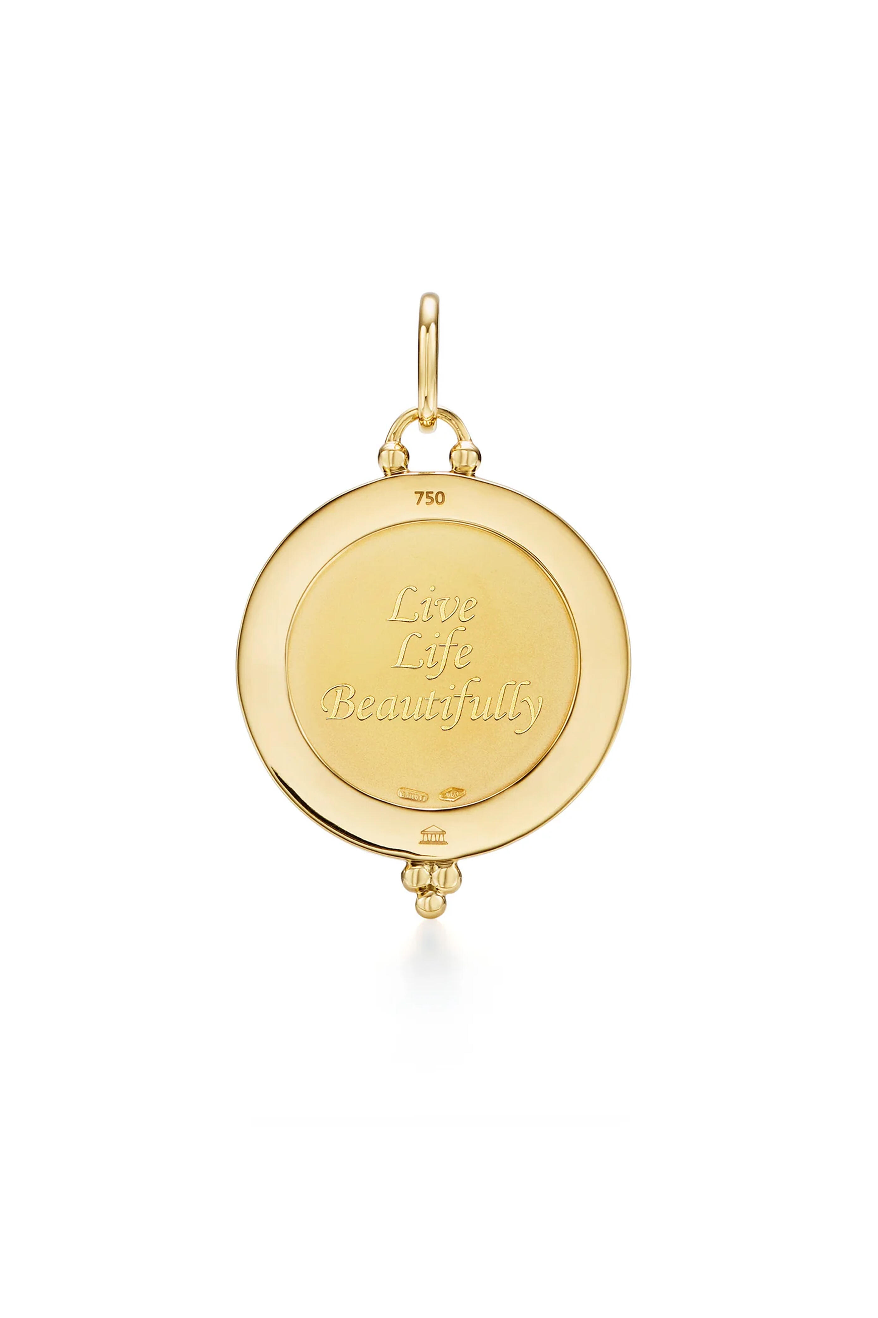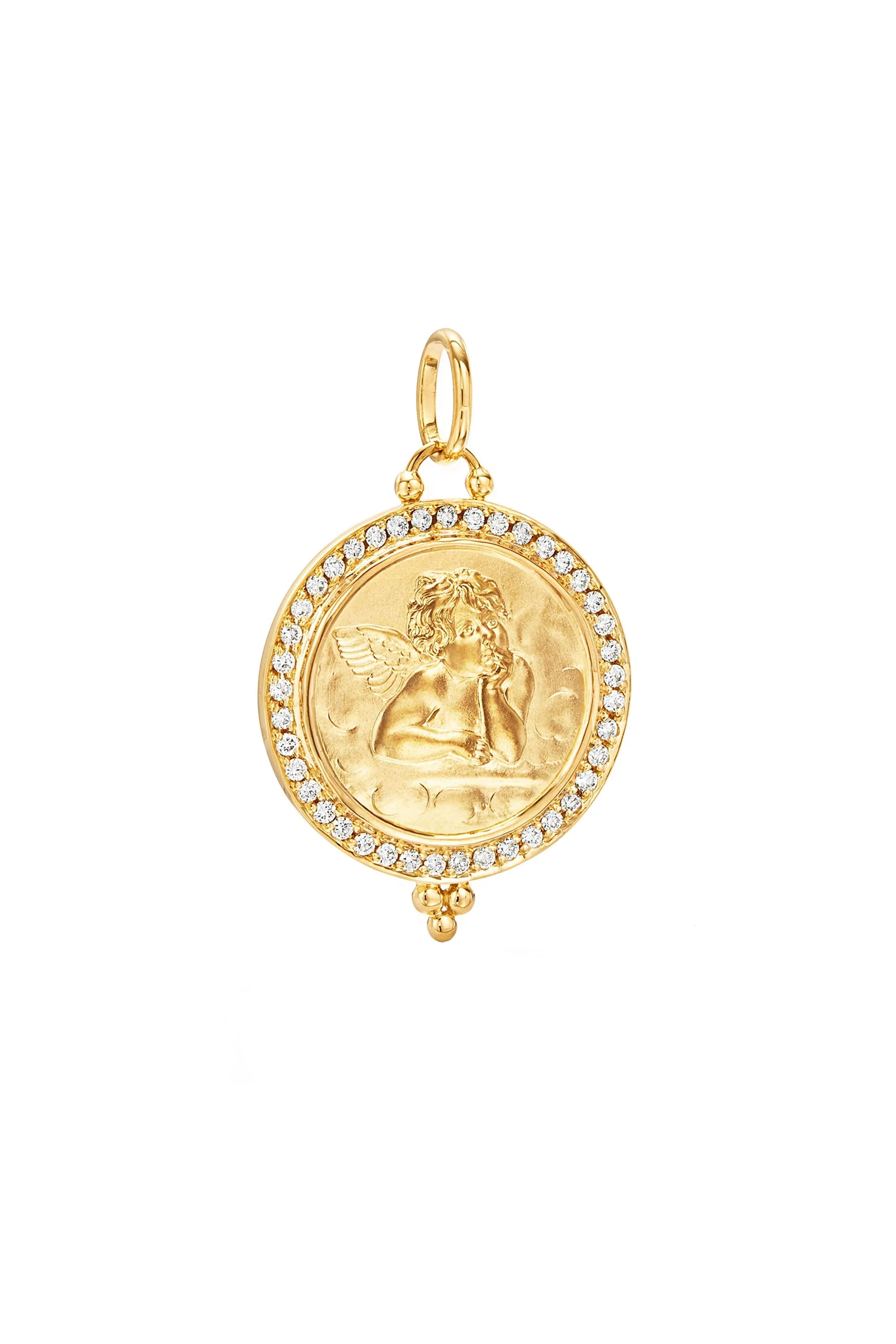 18k gold. Diamond 0.62 total carat weight. Inspired by the design of The Sistine Madonna by Renaissance partner Raphael. Featuring an angel in golden relief. Pavé diamond halo. Engraved retailing. Gold bail. Imported. Length: 1.4”. Width: 1”.