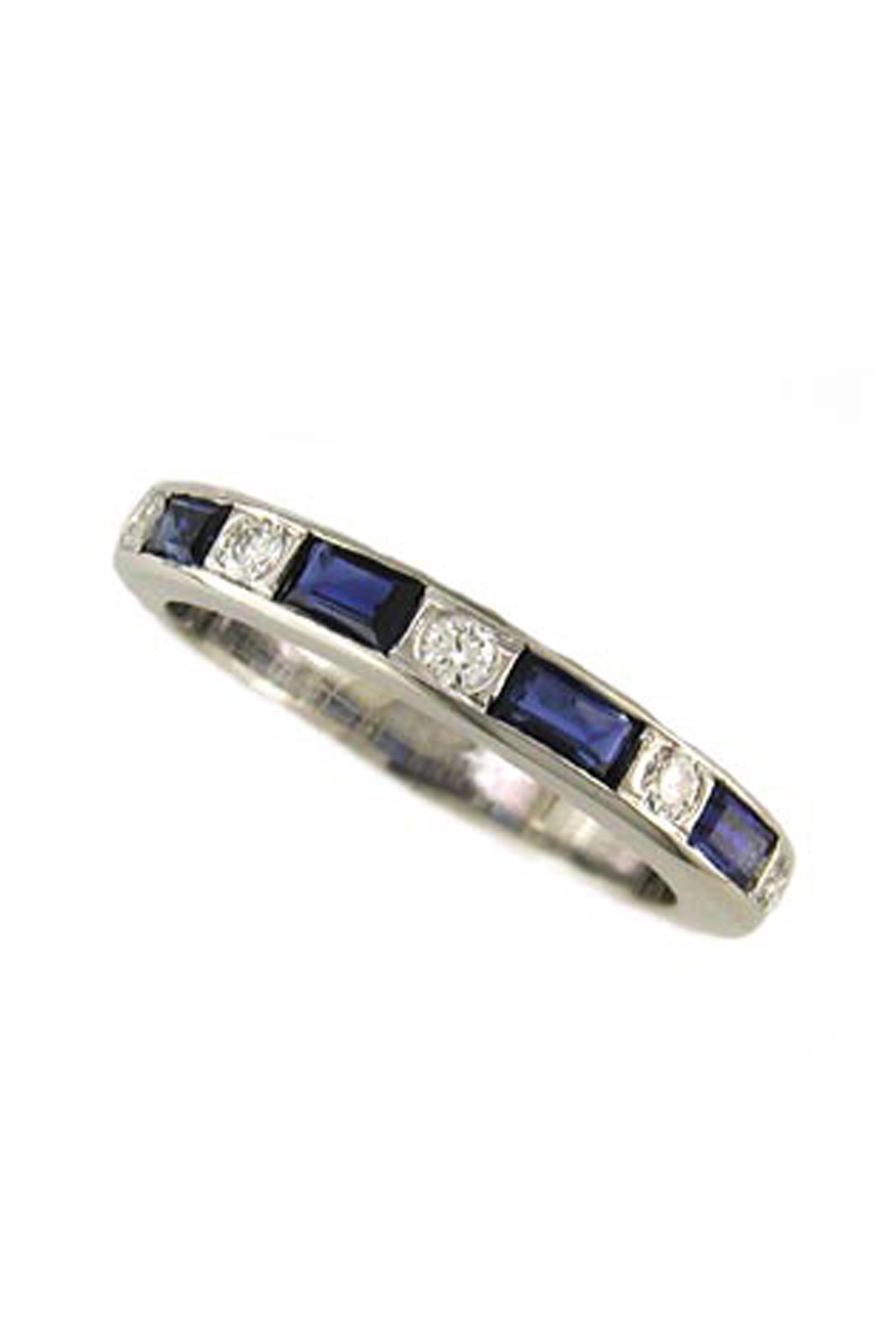 The glittering diamonds blend in perfect harmony with the striking blue sapphires. A smooth platinum band holds the alternating blue sapphires (1.27ct) and round-cut diamonds (.36ct).