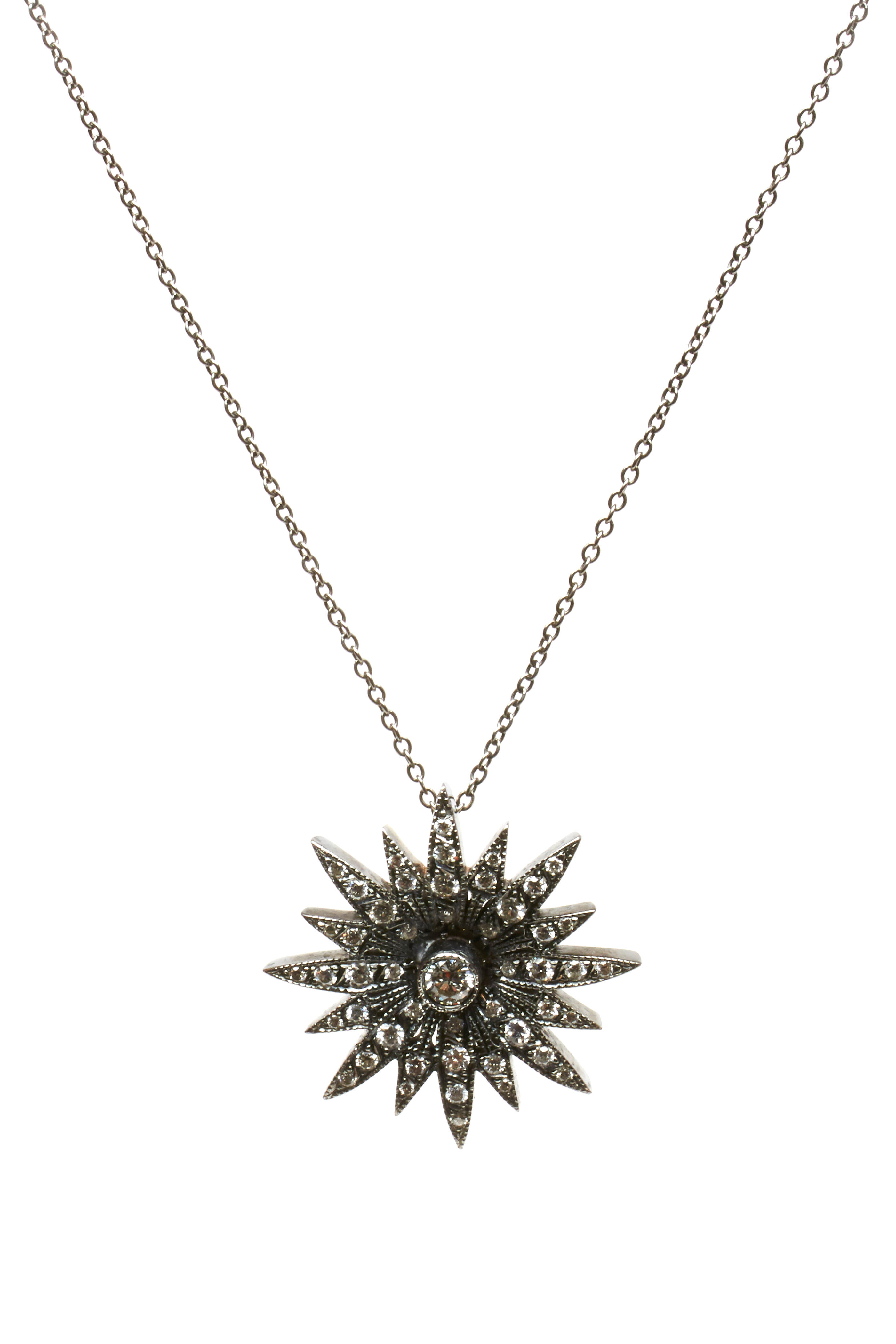 This beautiful starburst pendant features .45cts of round brilliant-cut diamonds framed in 14k oxidized white gold.