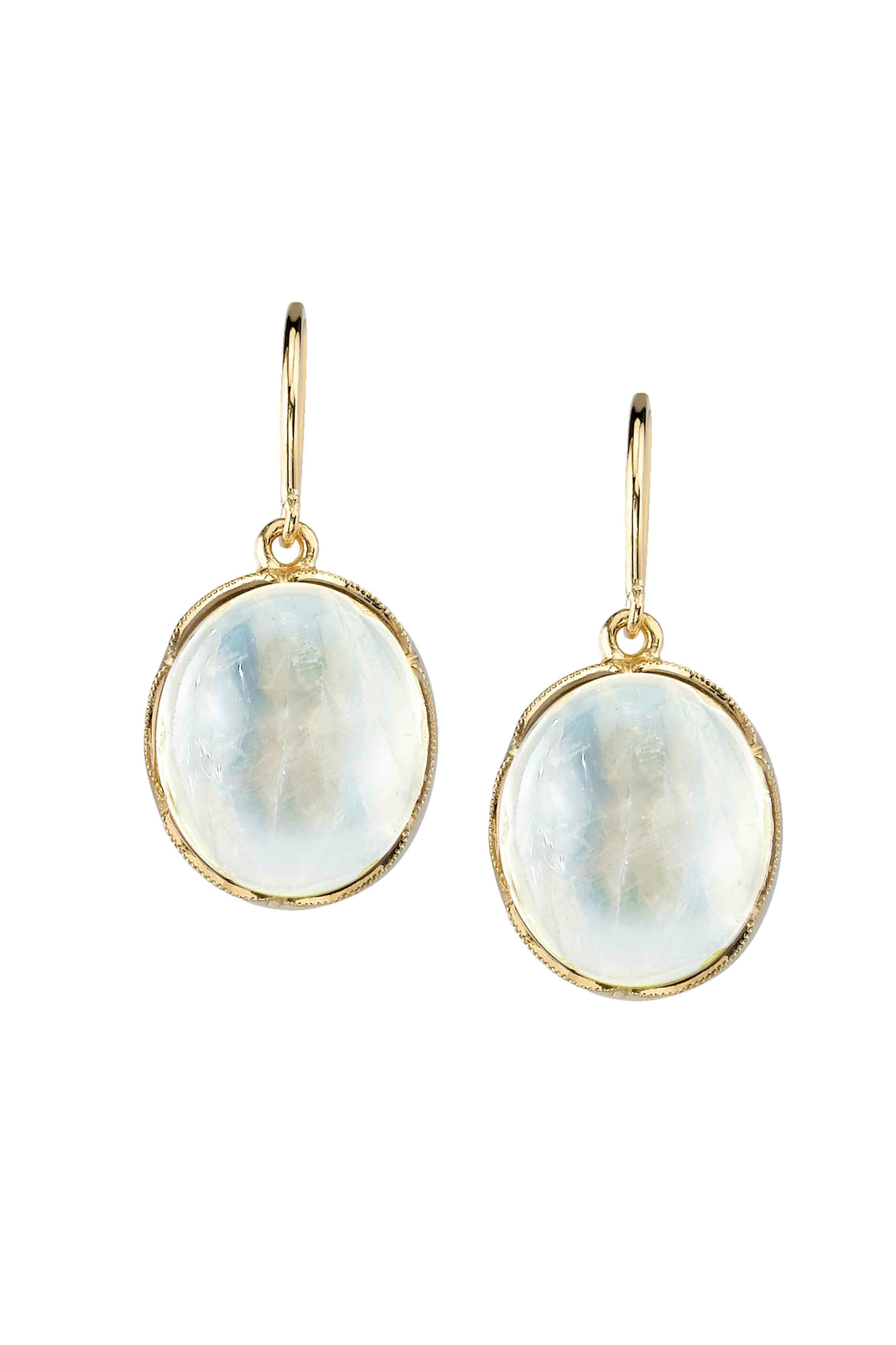 Dreamy and delightful, these earrings have two 14x12mm iridescent and glowing rainbow moonstone gemstones set in 18k yellow gold.