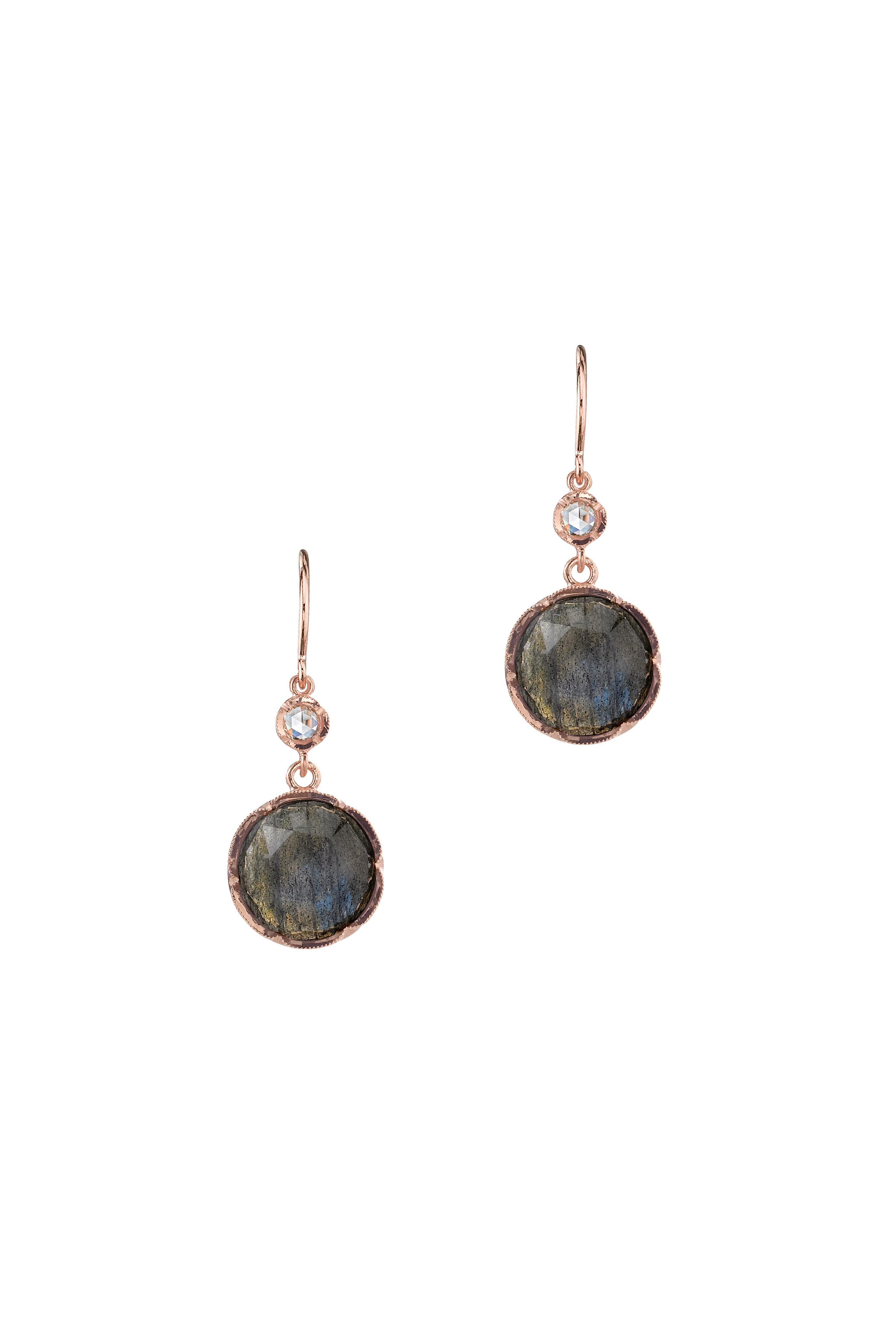 18k rose gold. 11mm rose-cut labradorite gemstones. 0.16cts 3mm rose-cut white diamonds. Round dangle off wire earrings.