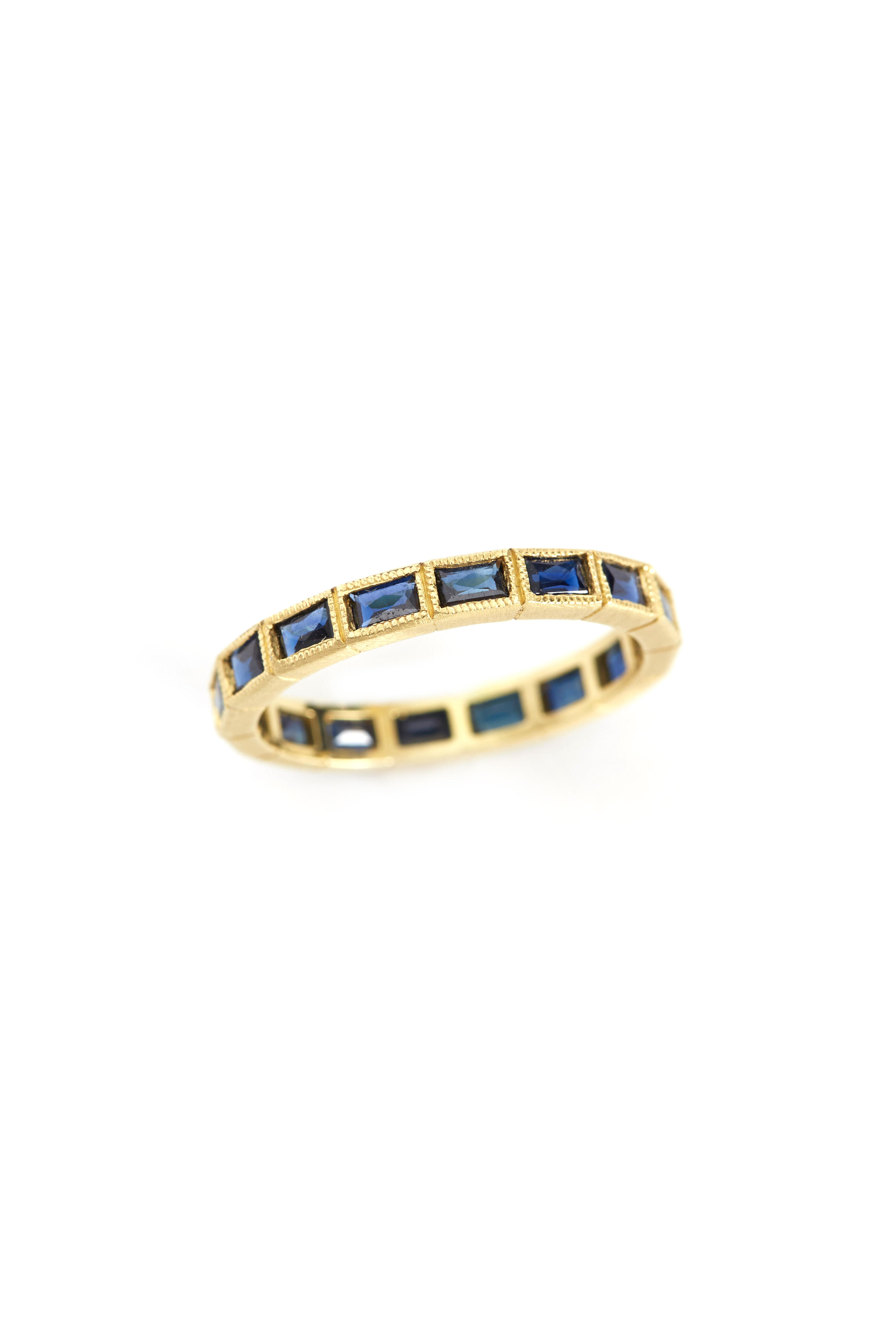 This slender ring features a beautiful set of french-cut blue sapphires in a great 18k yellow setting.