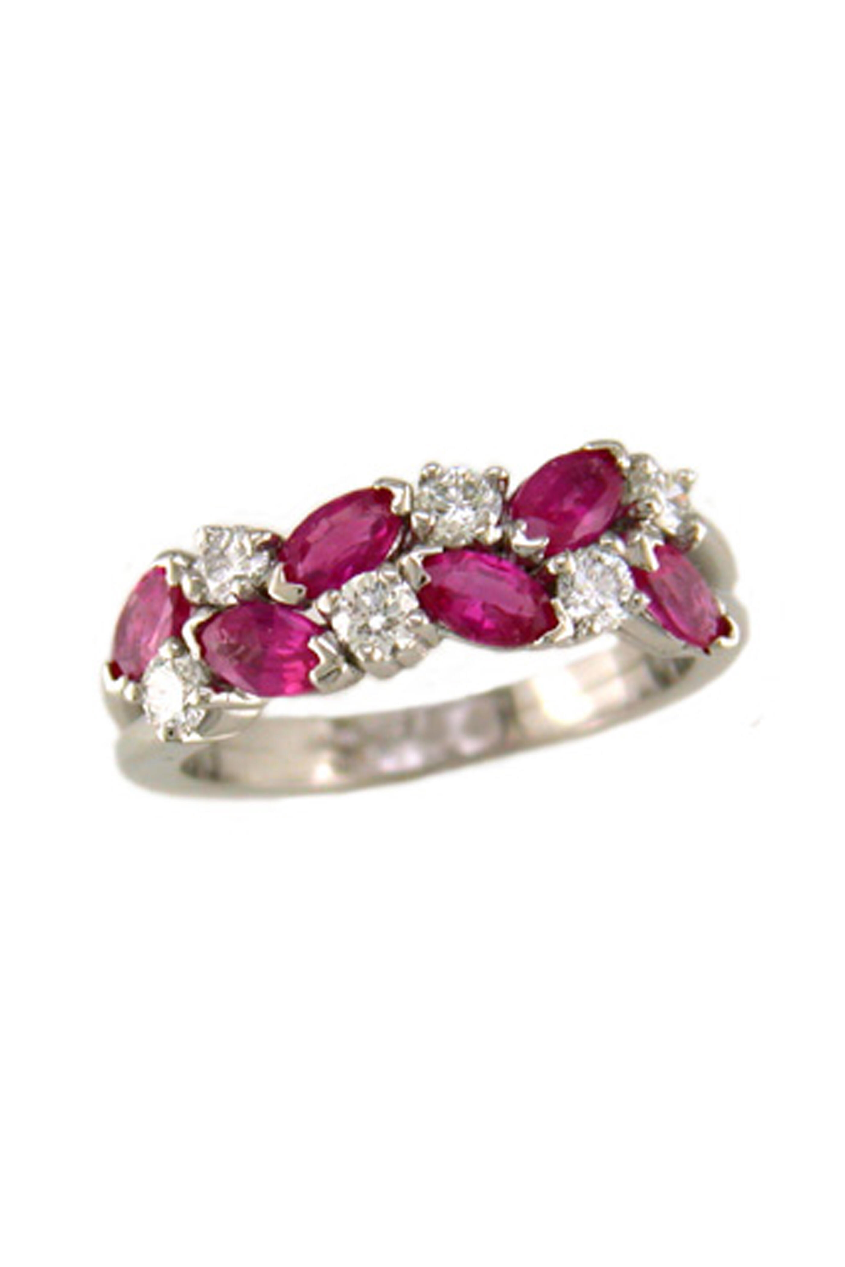 This beautiful, alternating design is fashioned from 6 sparkling round-cut diamonds (.46ct) and 6 marquise-cut pink sapphires (1.21ct) in a smooth platinum band.