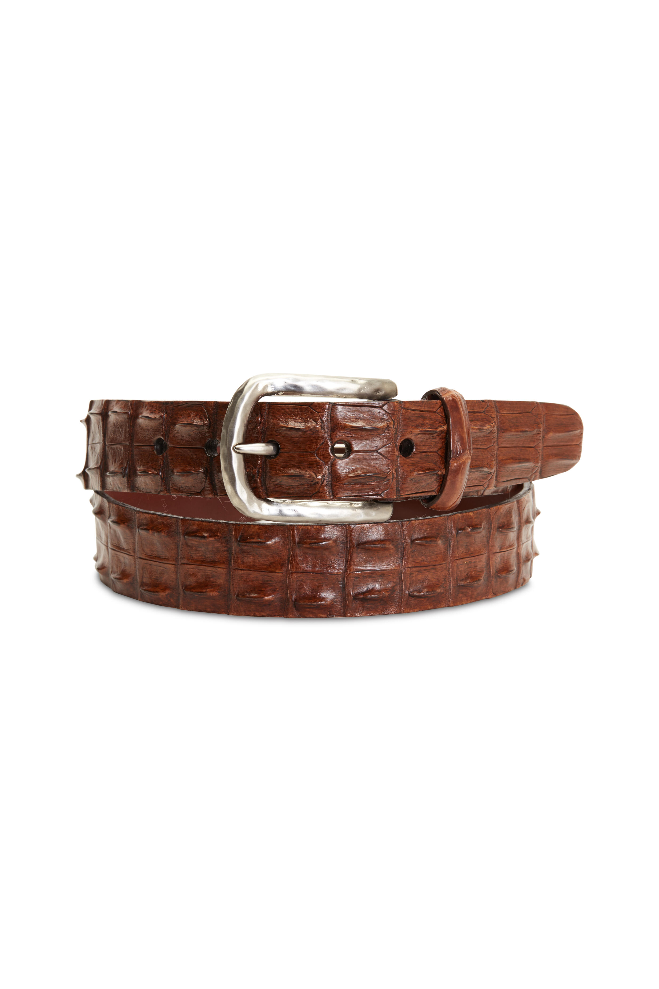 Genuine hornback crocodile. Single loop keeper. Hammered satin nickel buckle.