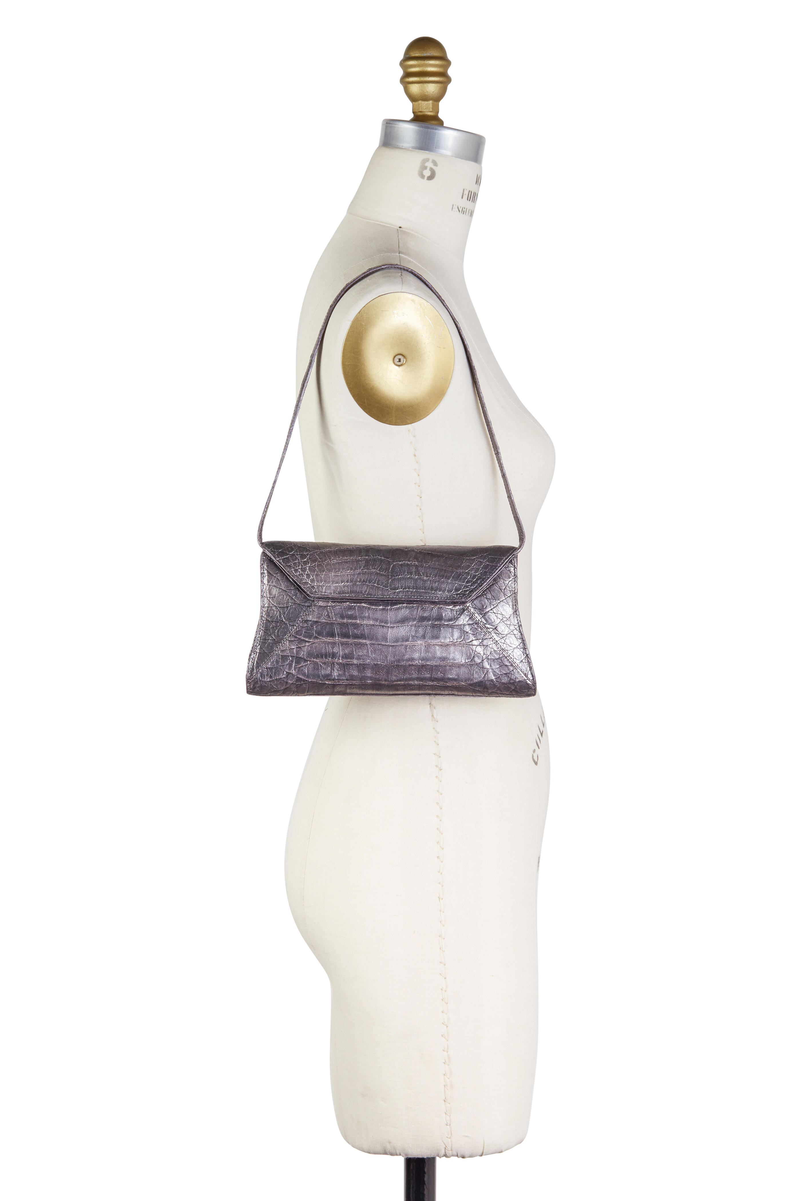 Caiman crocodile. Detachable crocodile shoulder strap. Fold over flap with concealed magnetic closure. Interior slip pocket. Suede lining. Made in Colombia. Width: 9 ½". Height: 4 ¾". Depth: 2 ½". Strap drop: 9".
