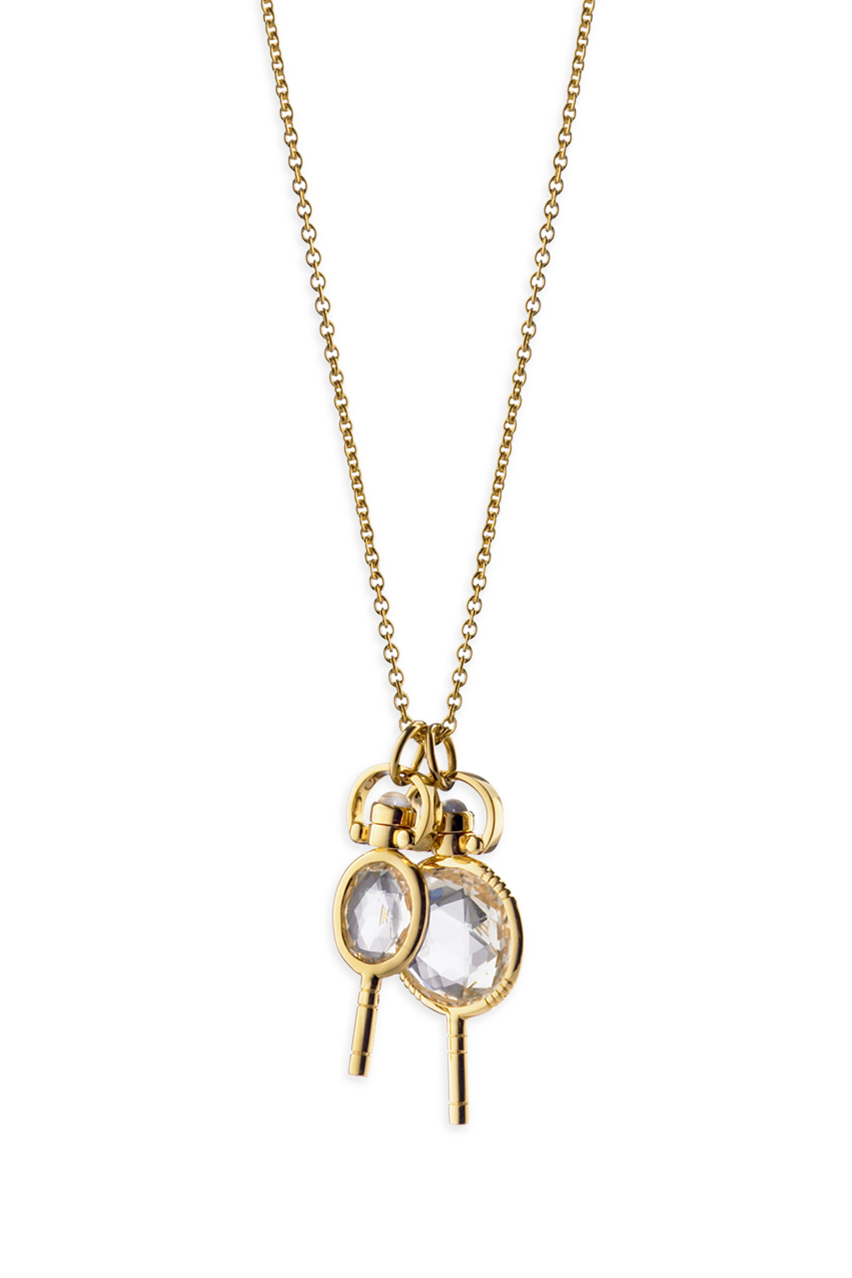 18K yellow gold. Rock crystals set in mini round pocket watch keys. 26"L.