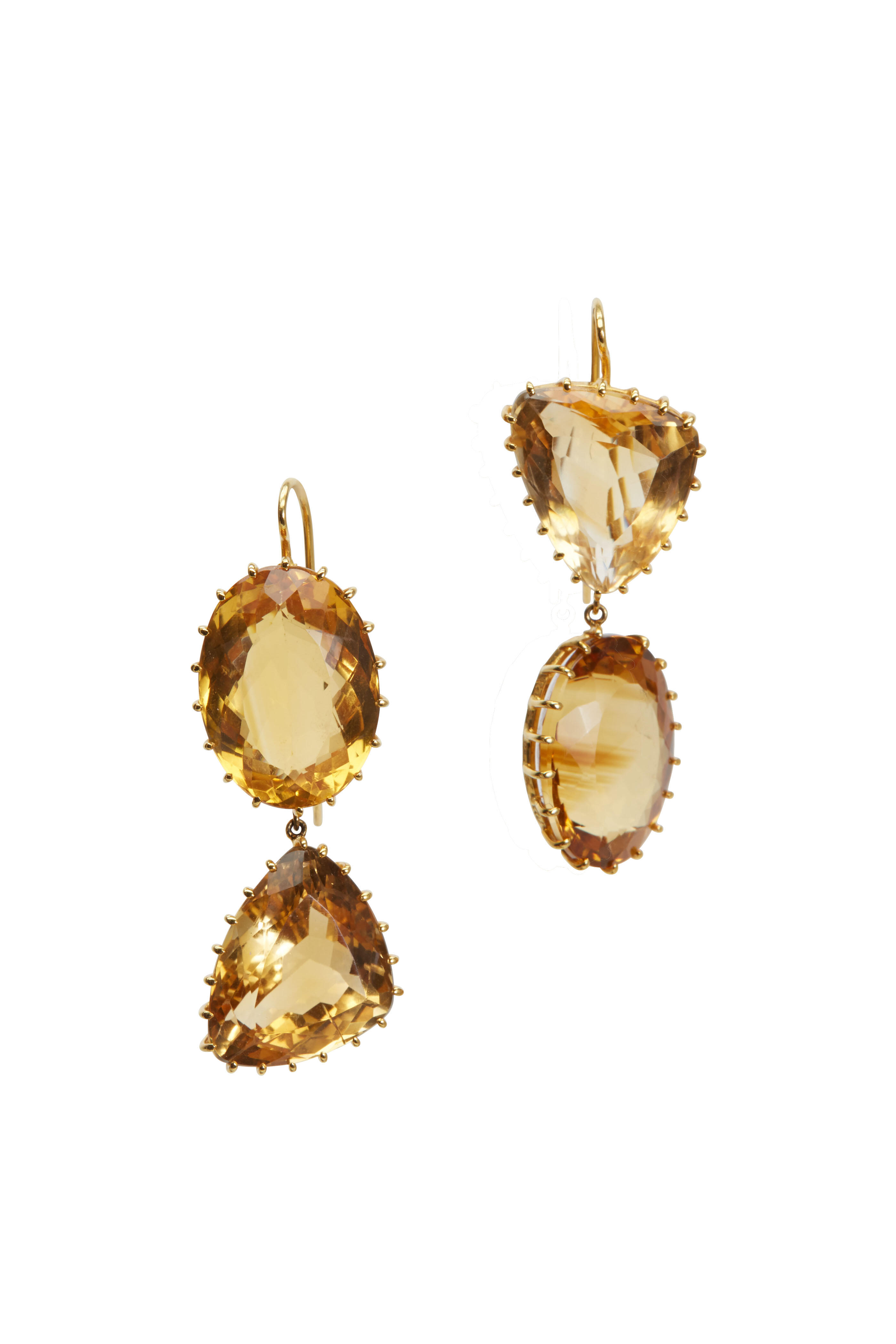 18k yellow gold. Antique fancy-cut citrine gemstones. French wire backs.