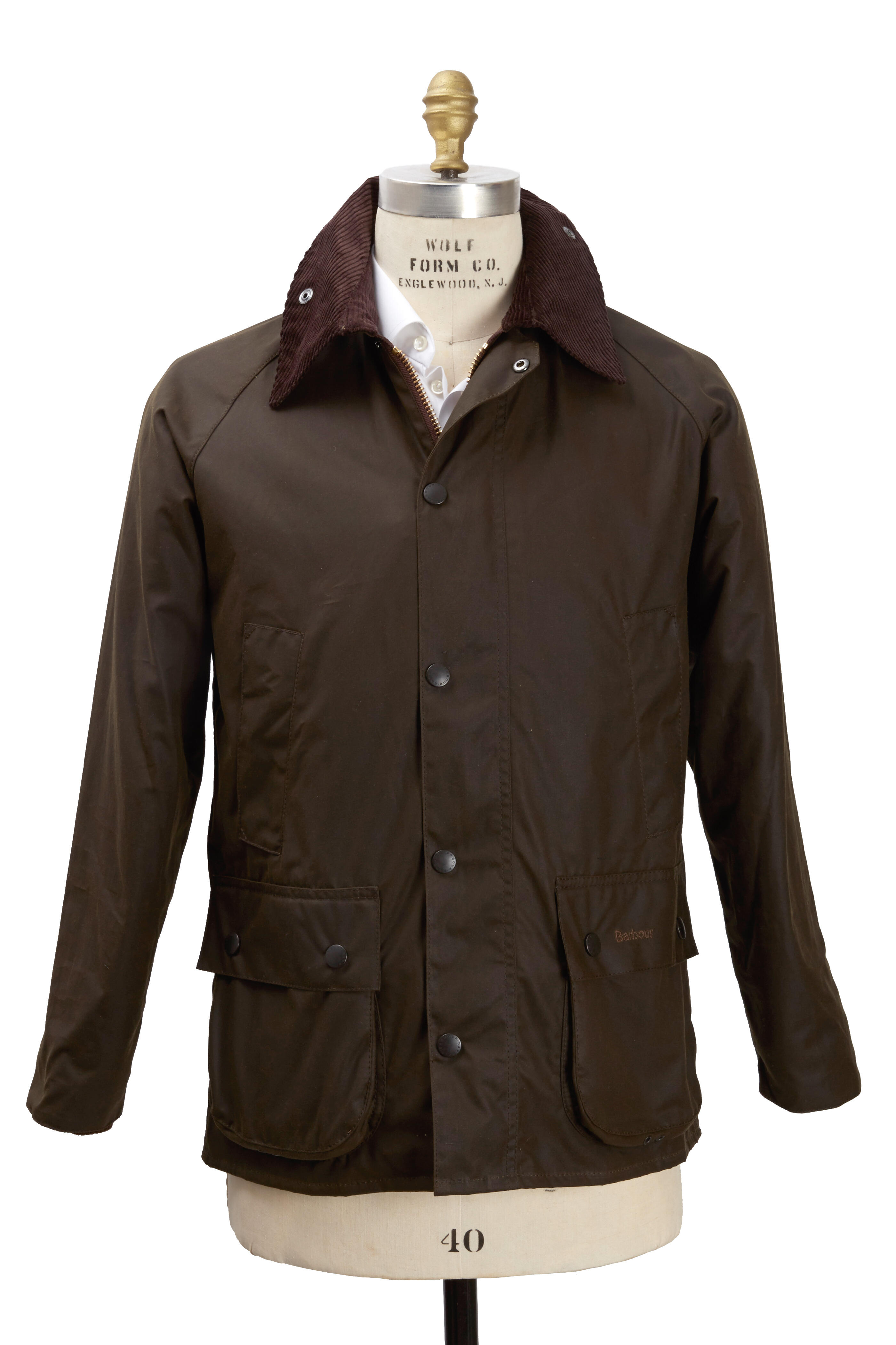 Spot clean. Corduroy spread collar. Concealed zip and snap front placket. Knit ribbed banded cuffs. Welt pockets; lower flap pockets. Made in England. 100% waxed nylon.