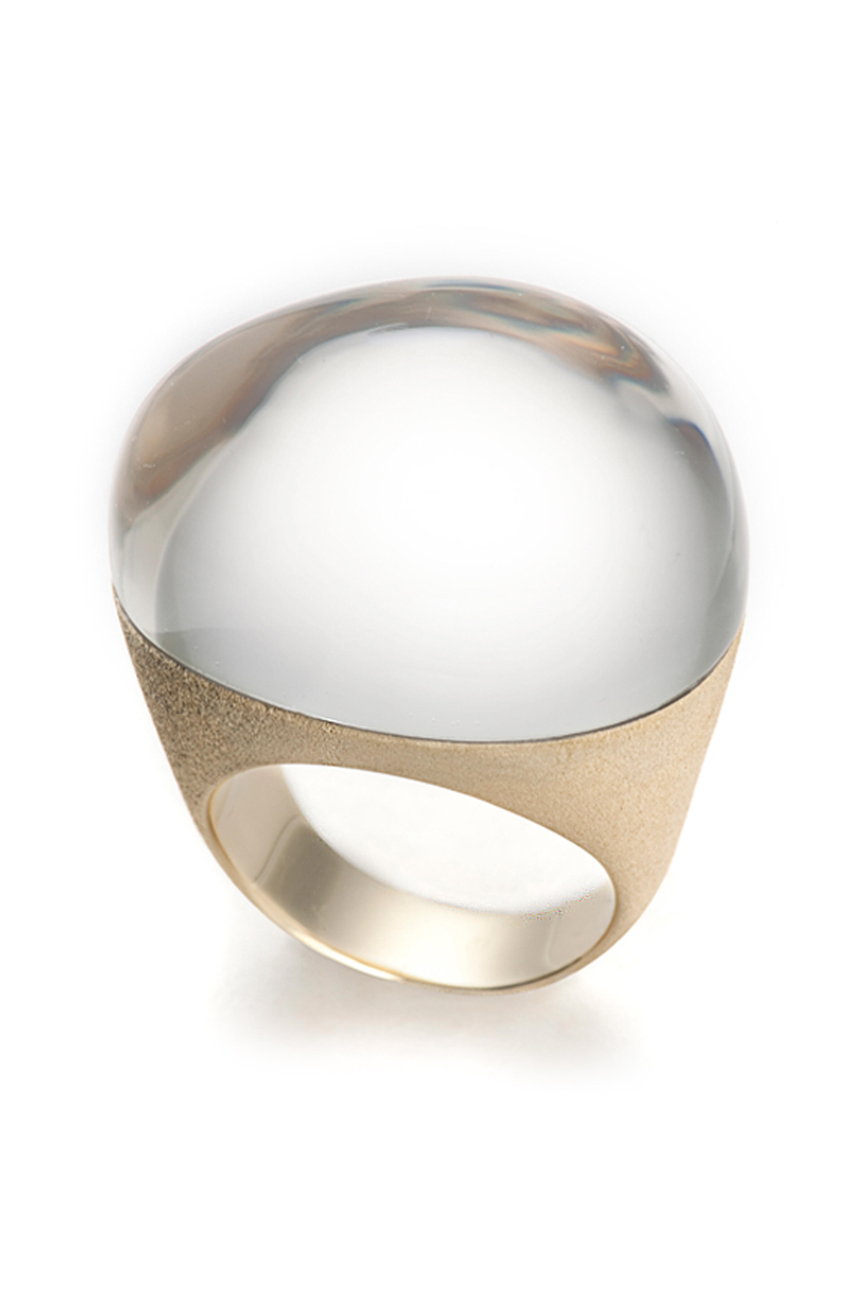 This gorgeous, dramatic ring features a stunning, faceted, round crystal quartz atop smooth 18k yellow gold.