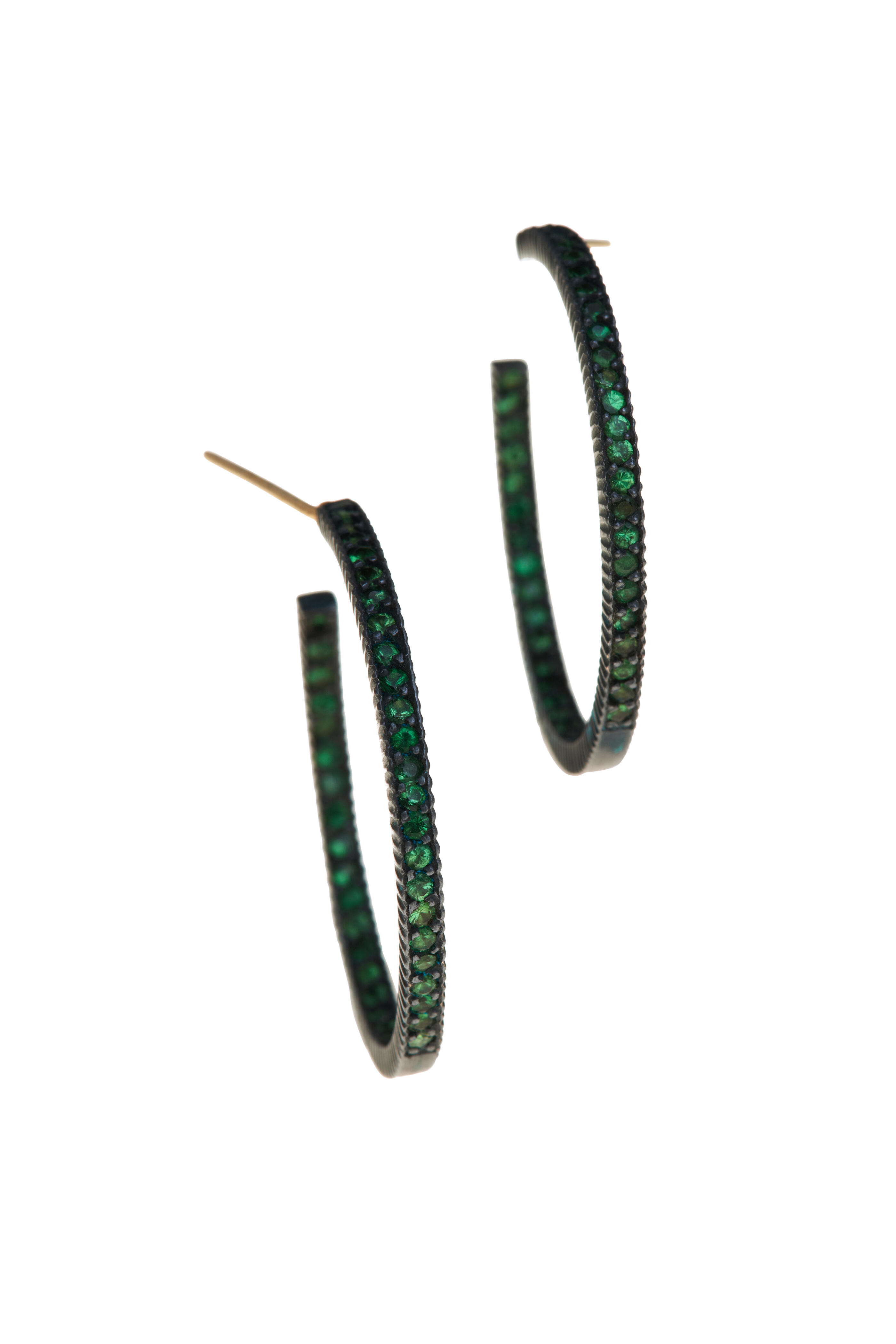 Oxidized yellow gold & sterling silver. 3cts pavé-set tsavorite gemstones. Medium hoops.