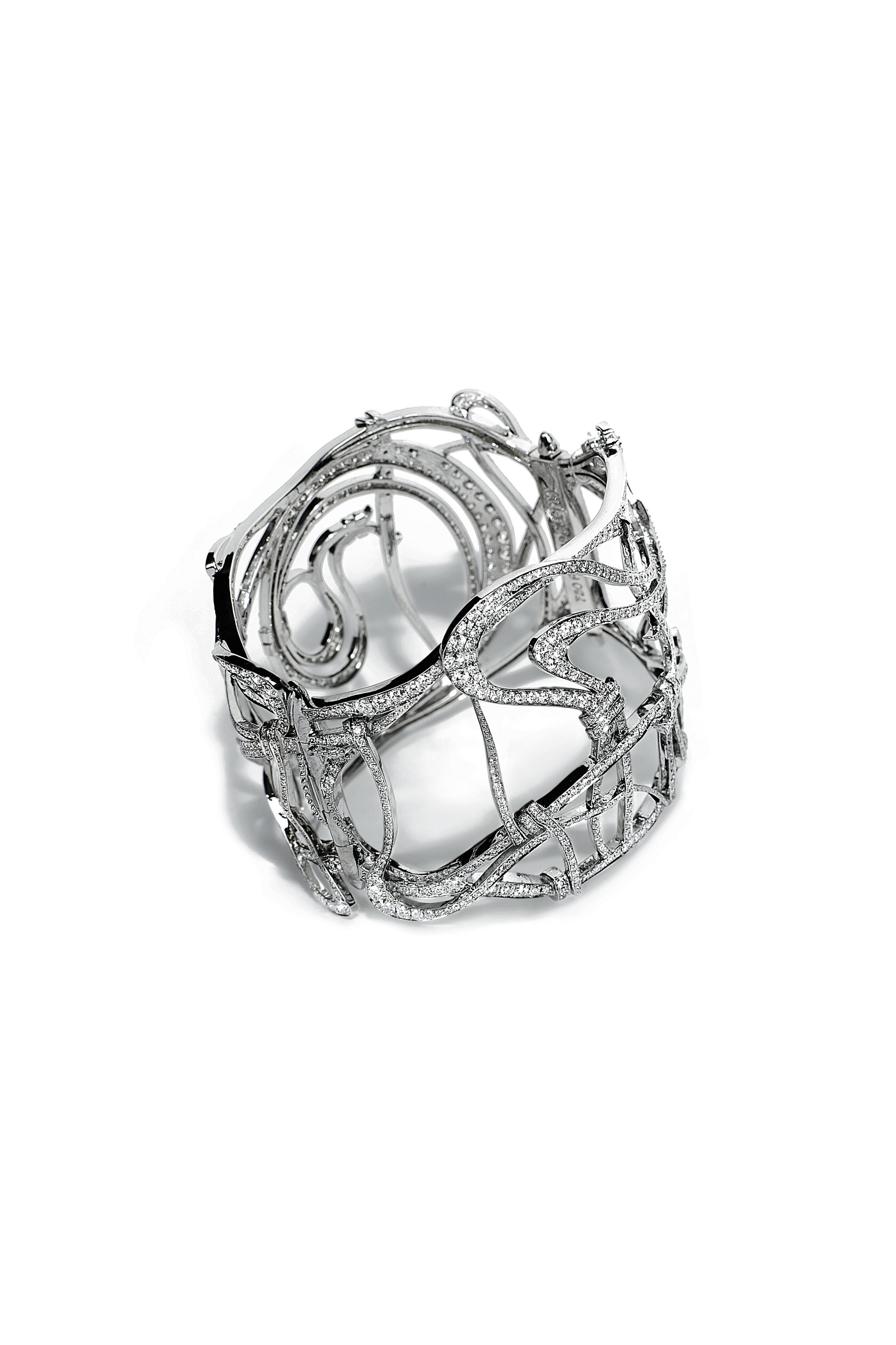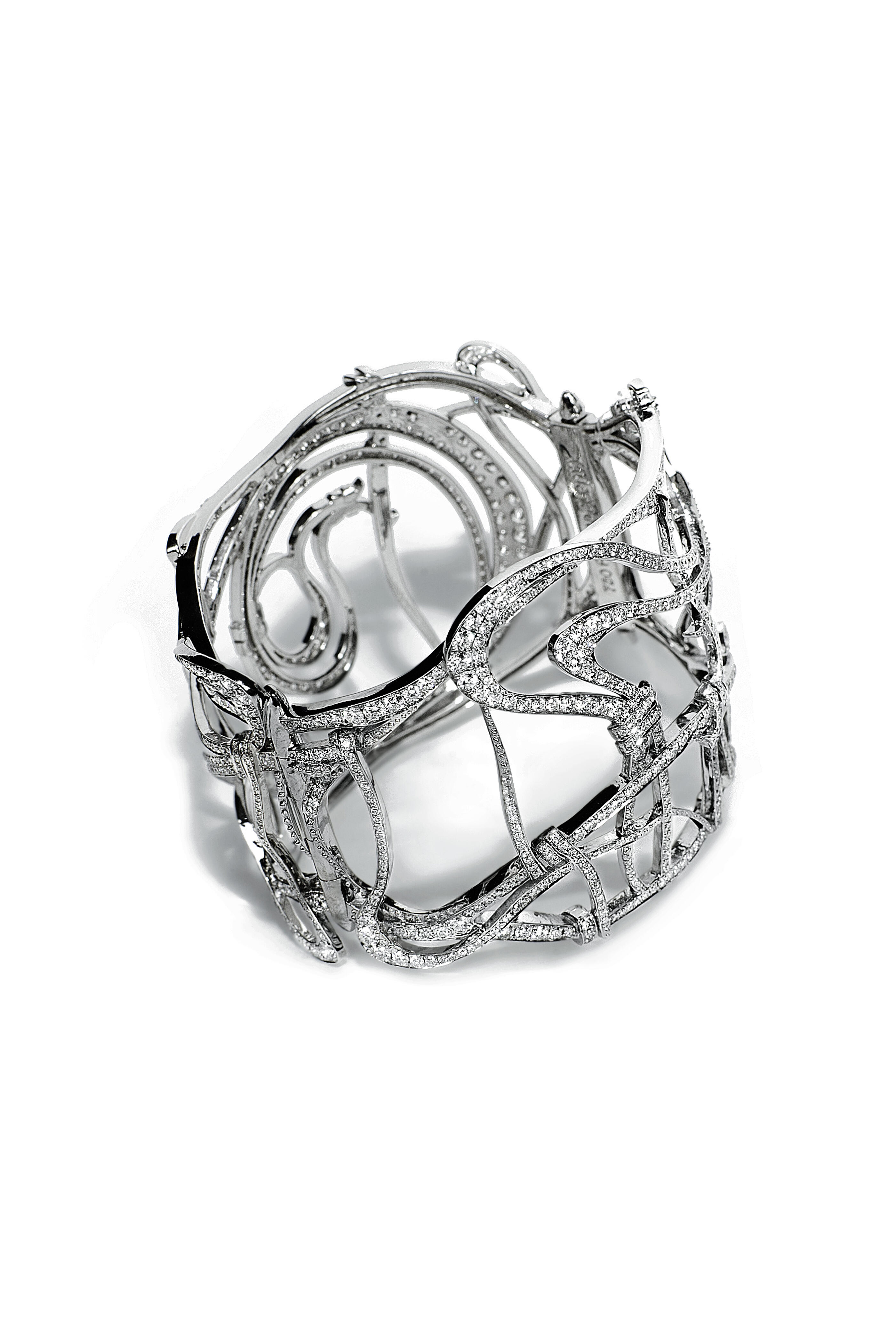Dare to dazzle with this radiant 18K white gold and 14.05CT diamond art nouveau pave cuff bracelet.
