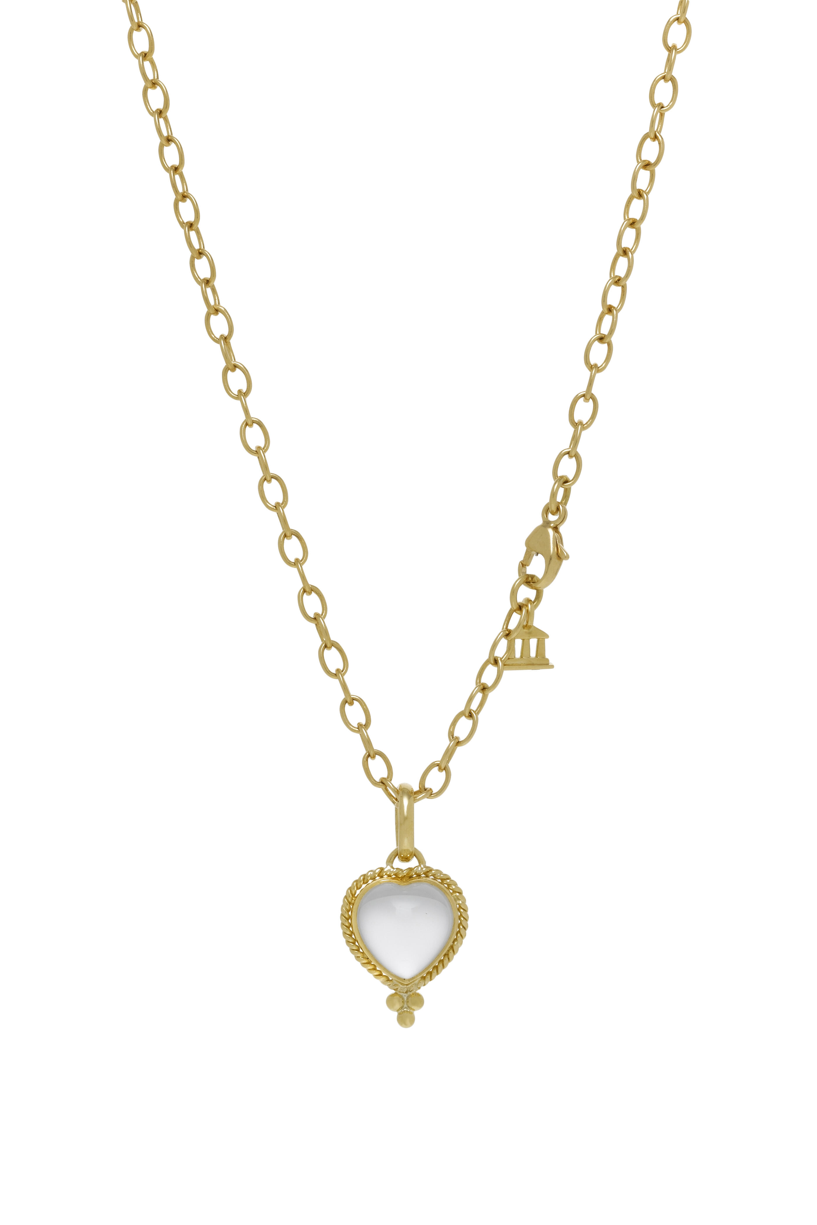 This luxury necklace is fashioned from 18k yellow gold and showcases an elegant, 3.90ct heart-shaped crystal gemstone in a braided gold frame.