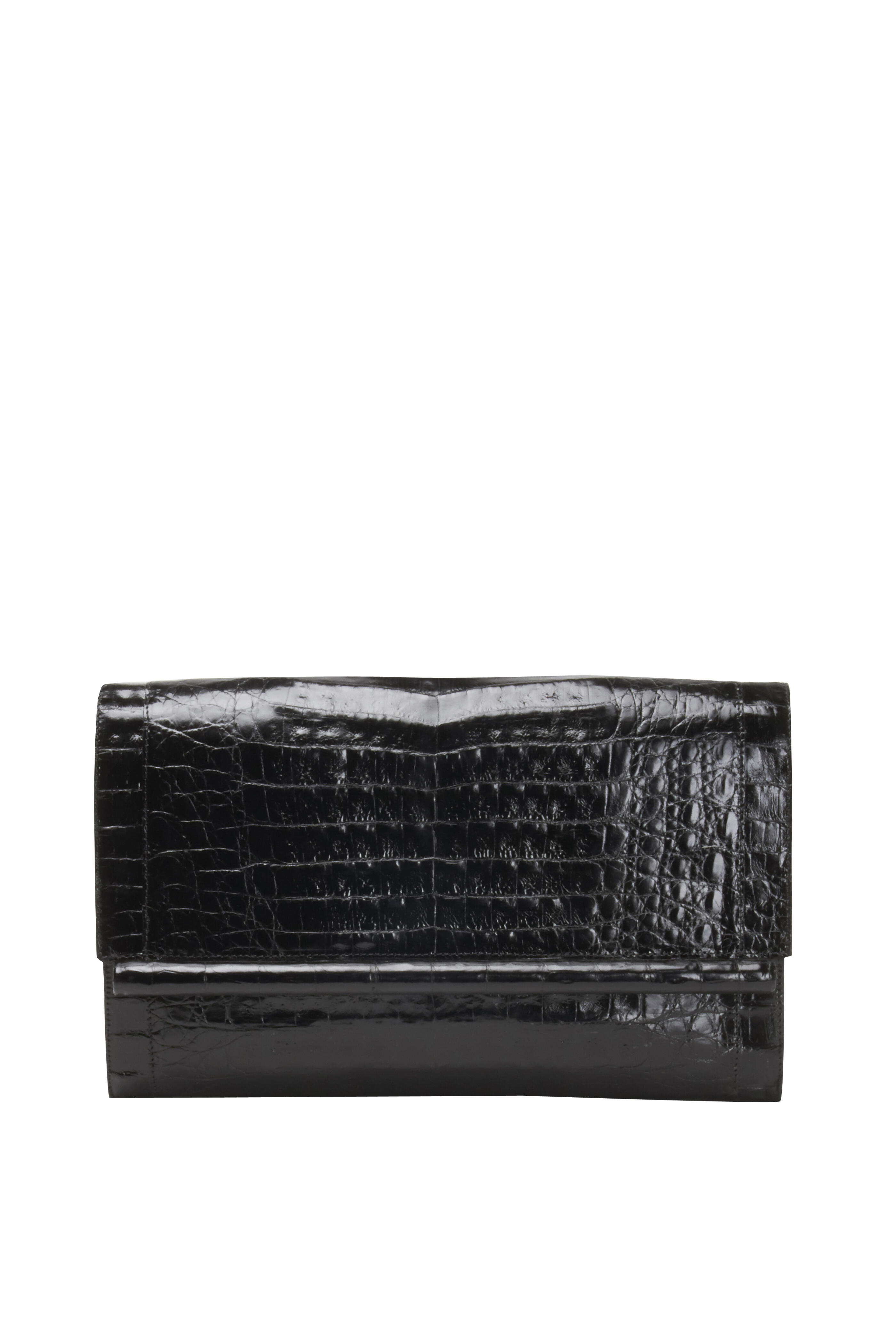 A classic design clutch in shiny crocodile with self-covered bar is in a perfect size for day or evening.