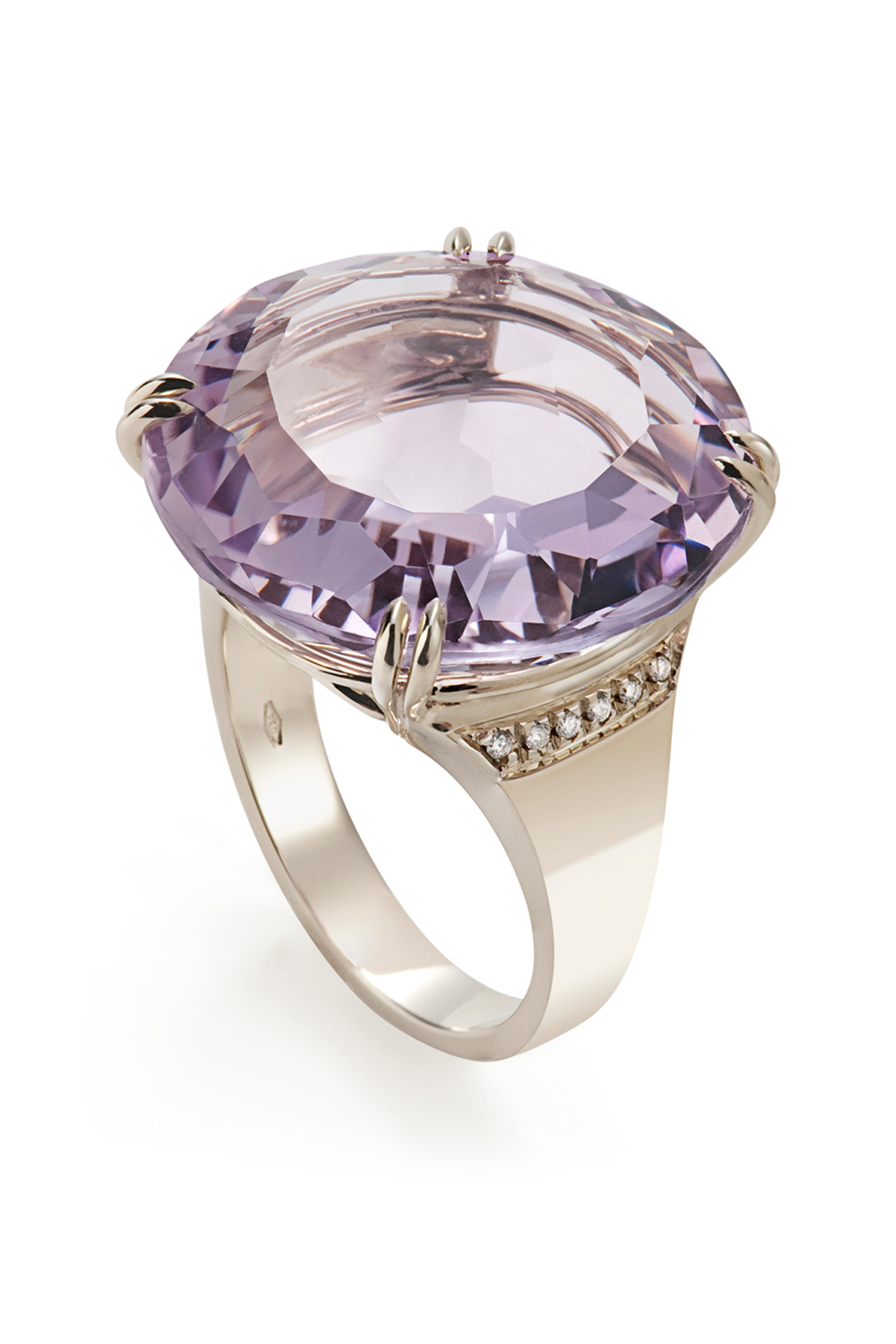 This luxurious 18k noble gold ring has .06ct of diamonds in an elegant design below a magnificent 18.05ct amethyst.