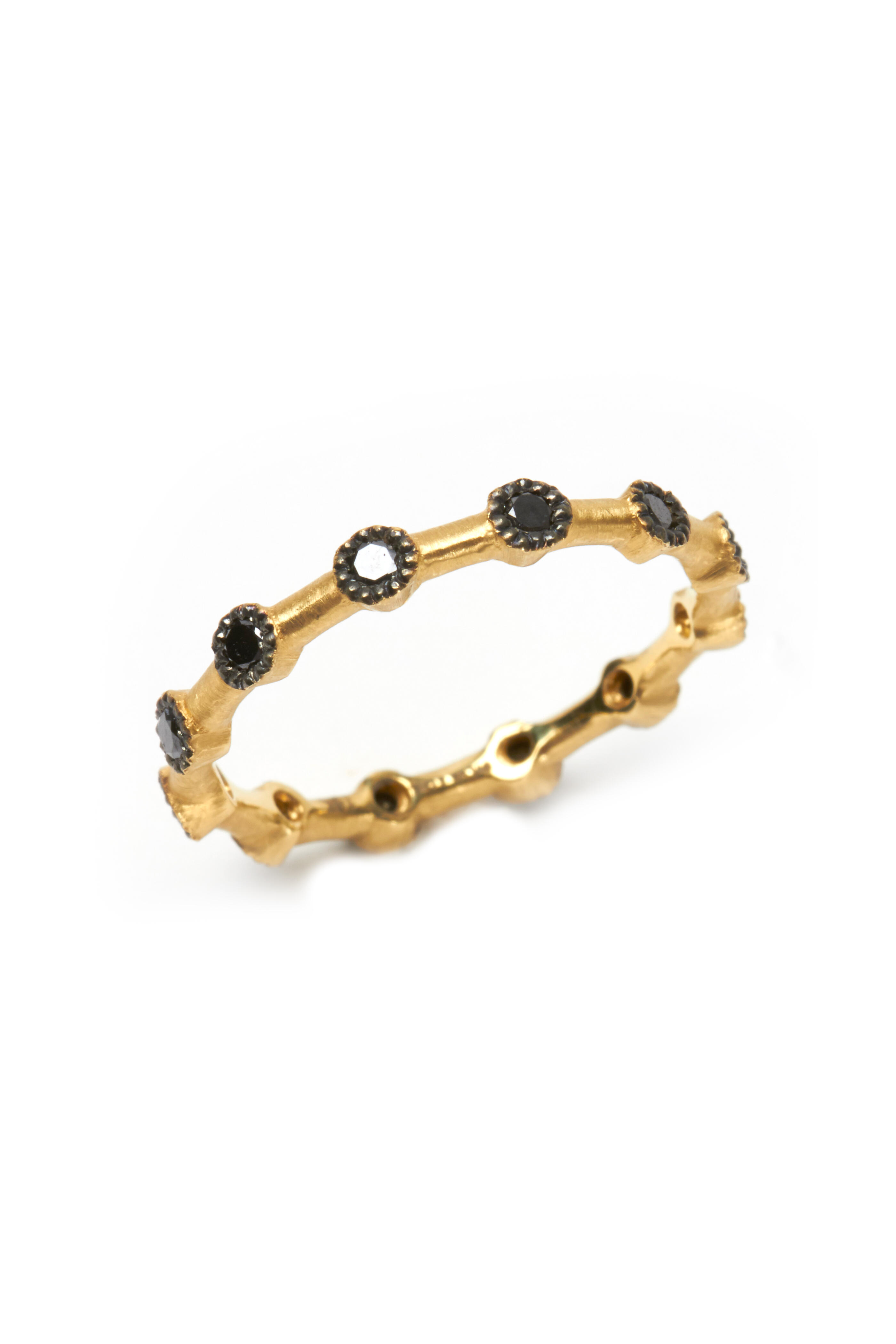 18k yellow gold. 0.33cts black diamonds. Thin, stackable band.