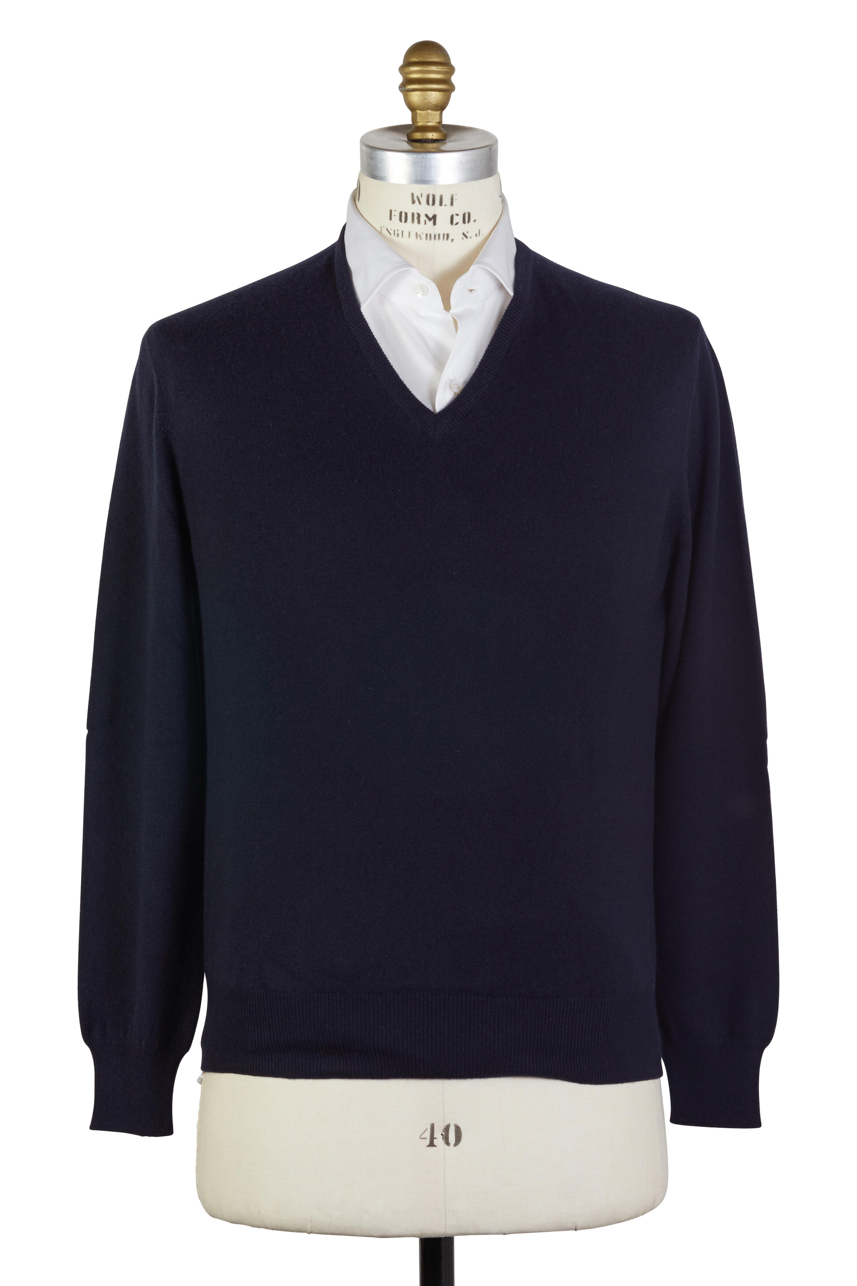 V neckline. Long sleeves. Ribbed trims. Made in Italy. 100% baby cashmere. Machine wash or dry clean.