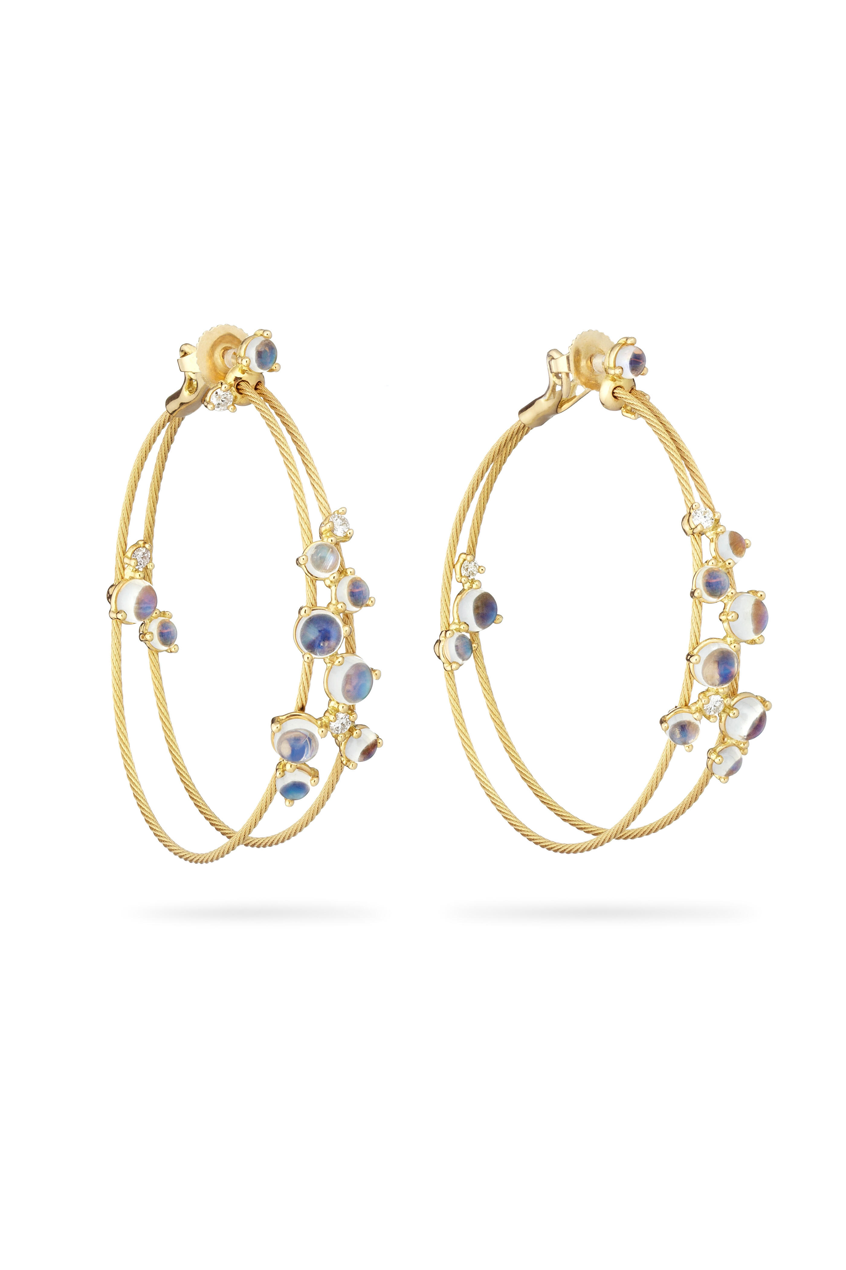These gorgeous double wire hoop earrings are fashioned from 18k yellow gold with cabochon-cut moonstones and sparkling diamonds (.91ct).