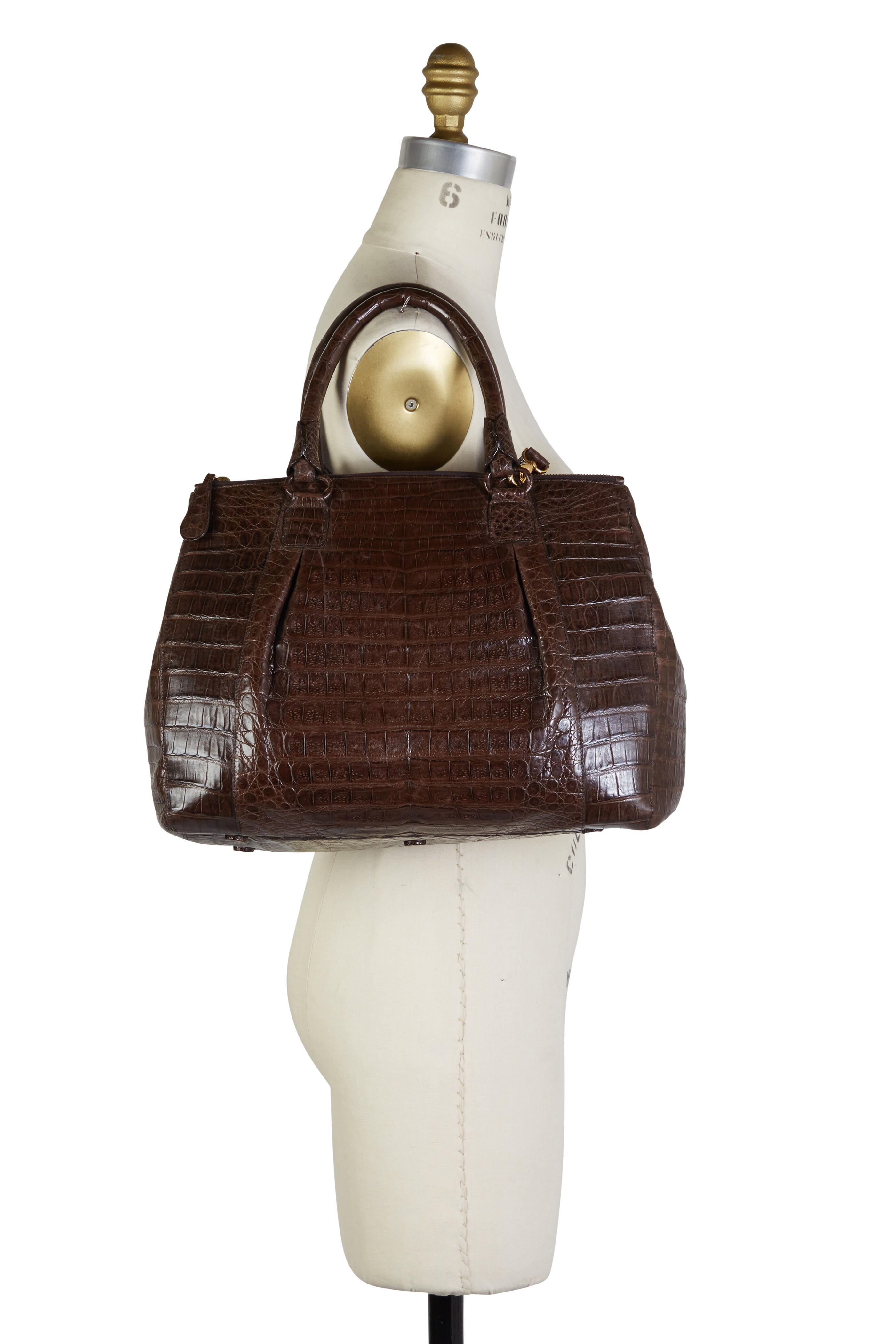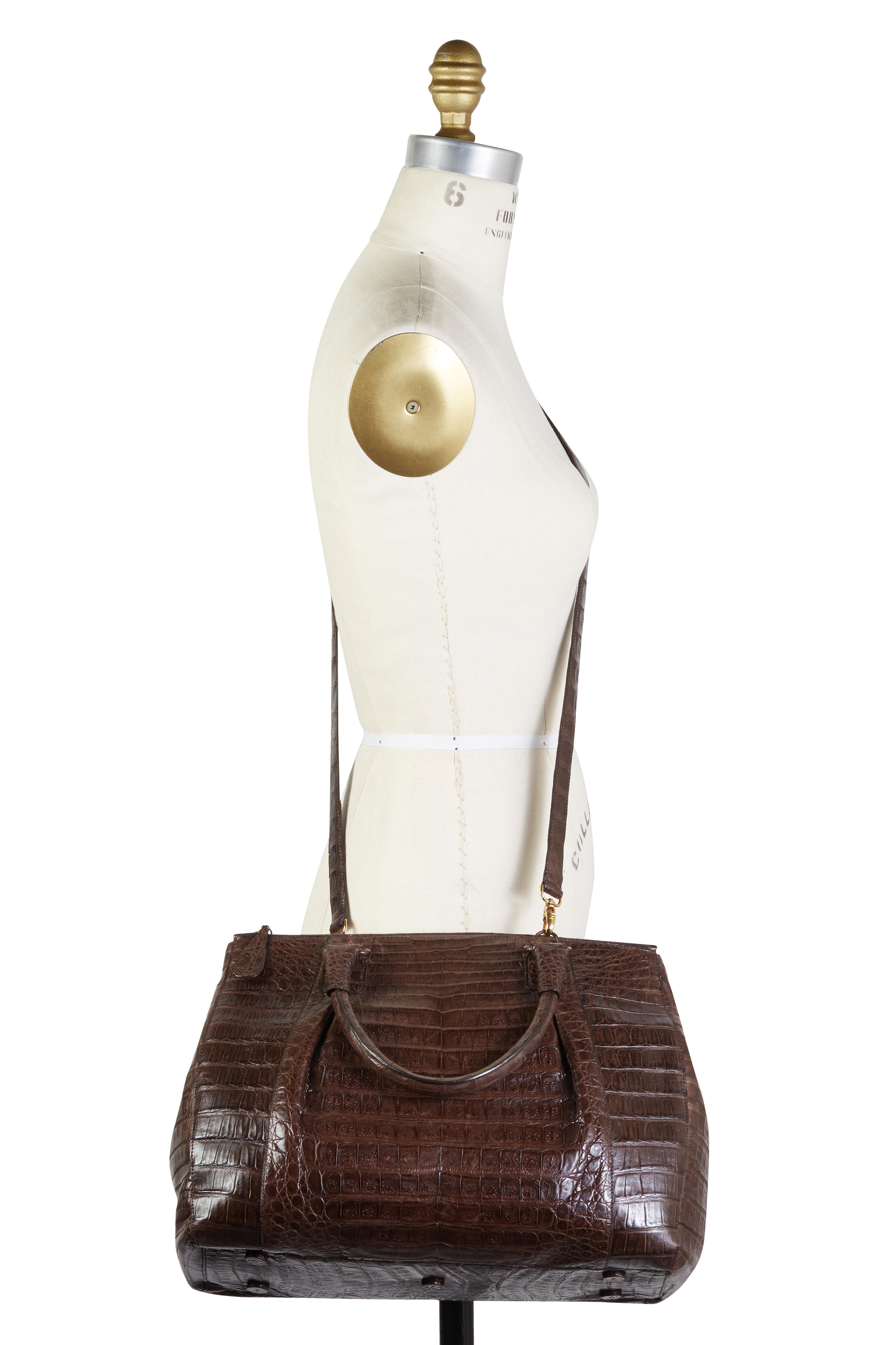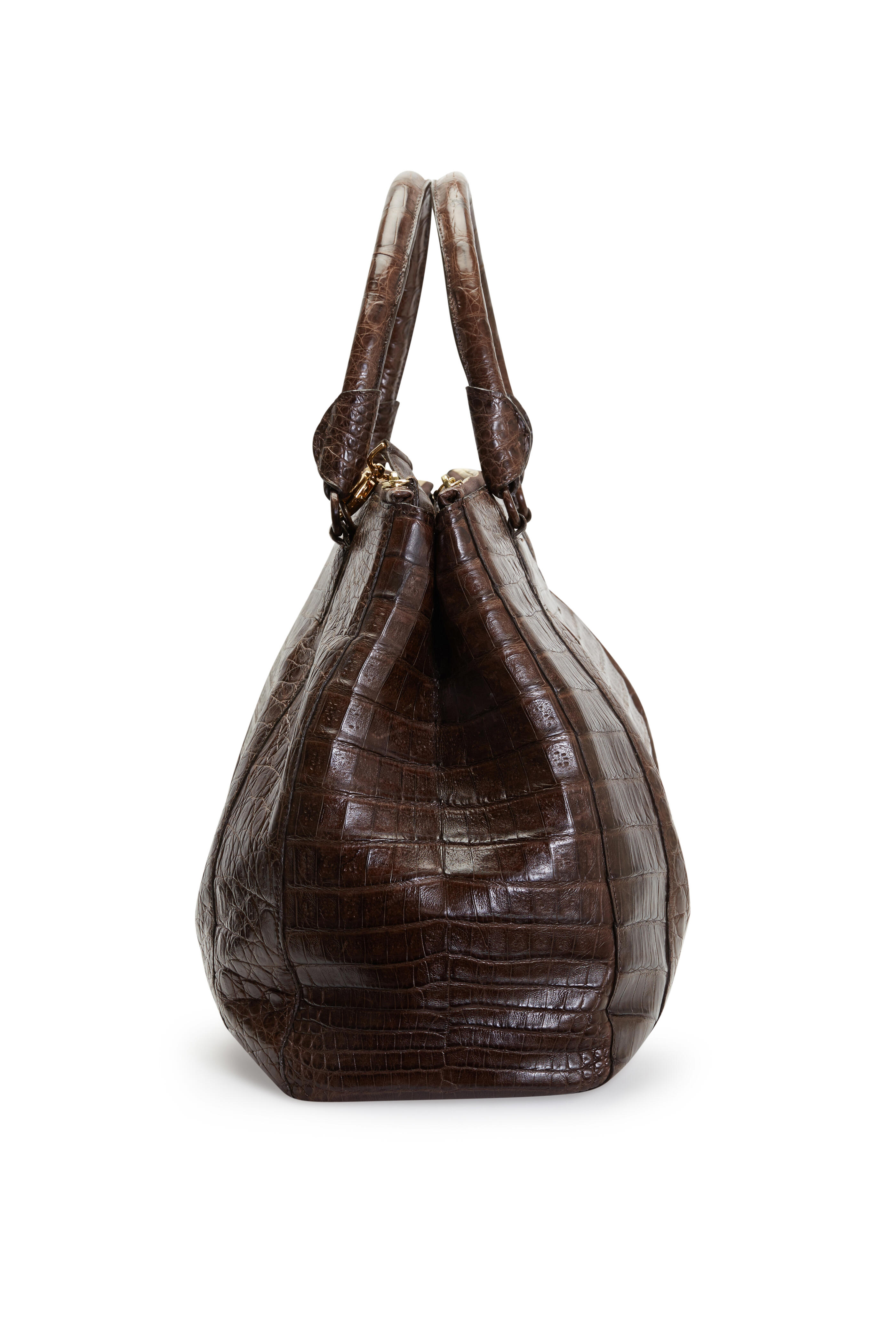 Caiman crocodile; suede lining. Open top, concealed magnetic side closures. Front and back zip compartments. Double rolled top handles. Removable shoulder strap. Interior zip pocket, interior cell phone pocket. Self covered protective feet.