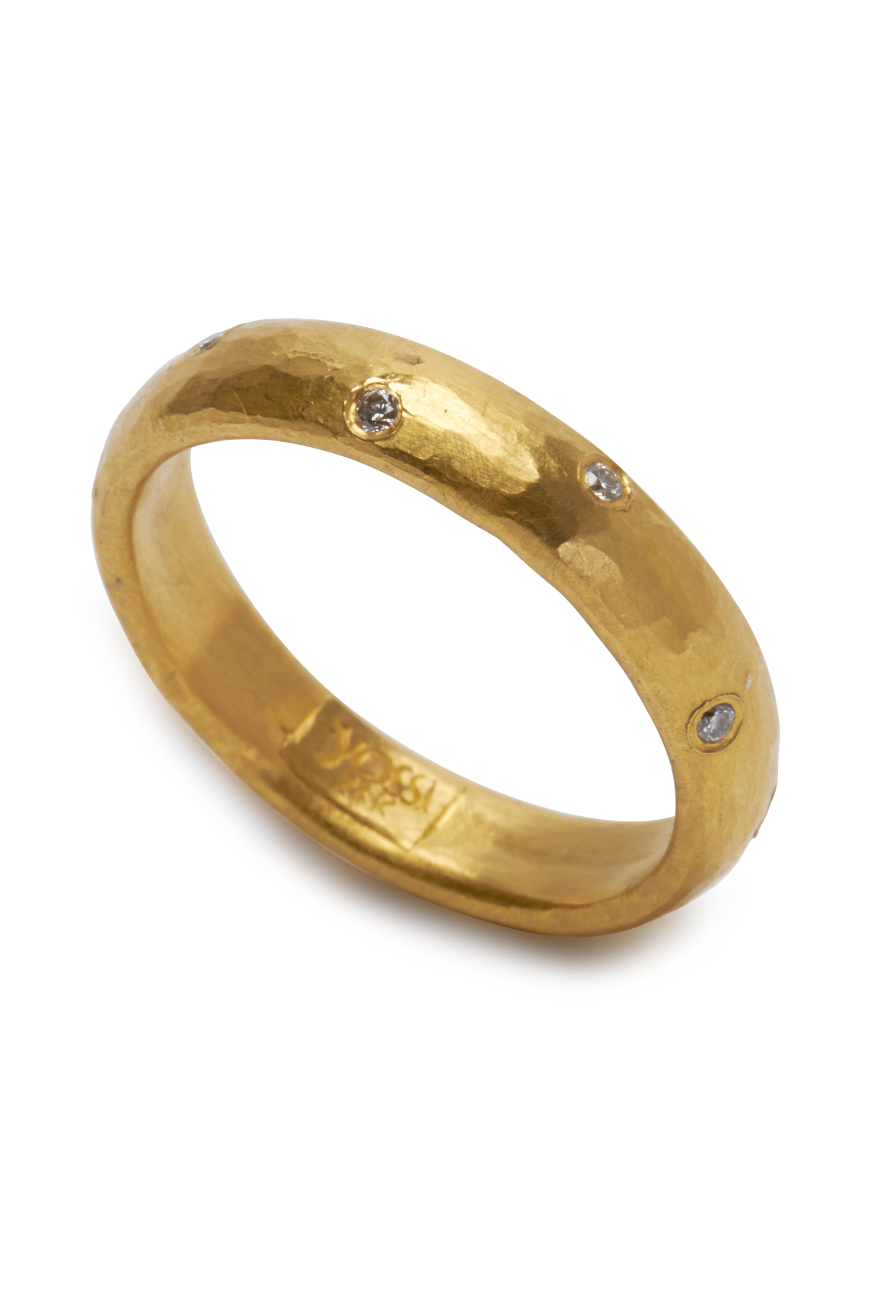 24k yellow gold. .10cts white diamonds. 3.5mm band.