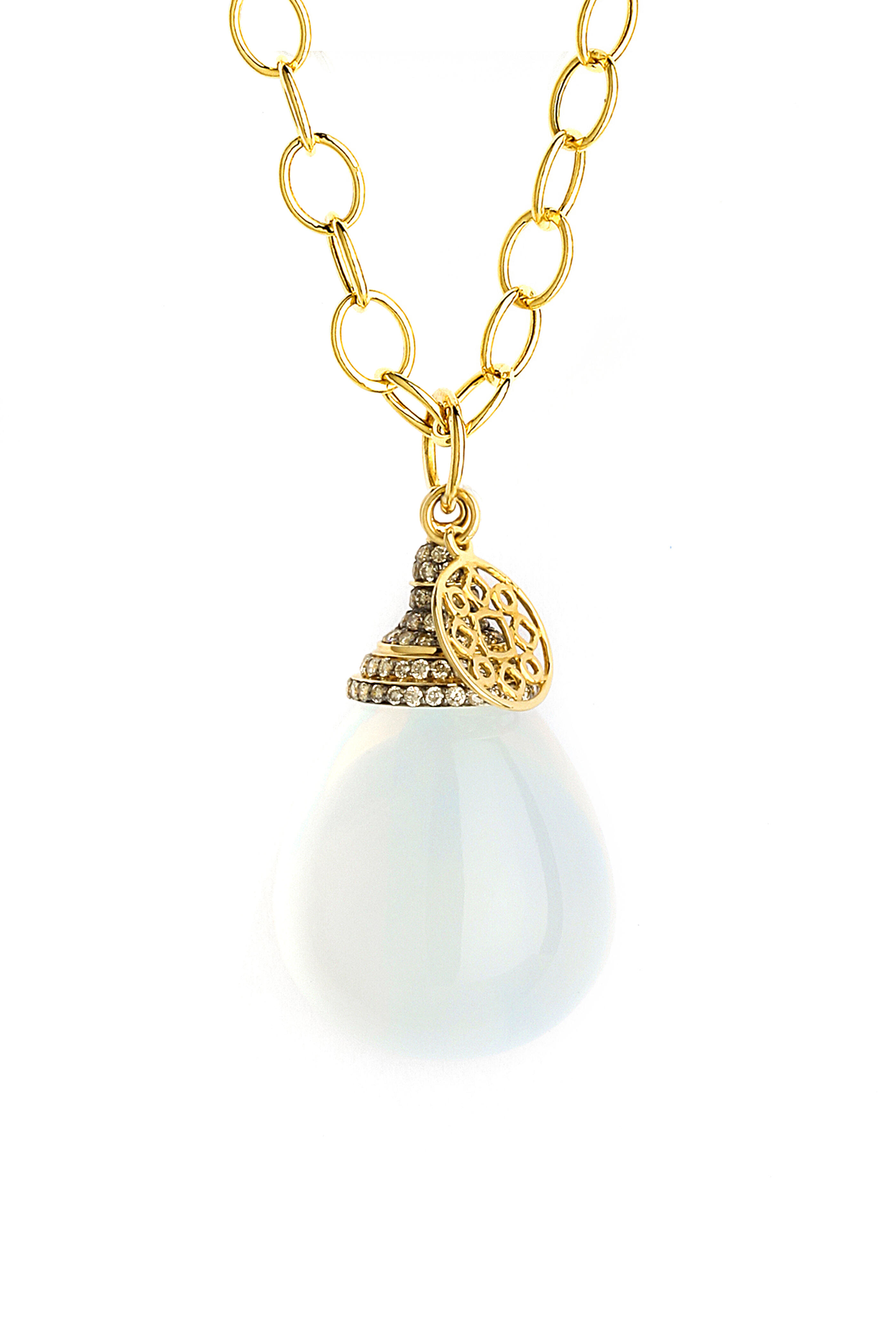 This beautiful pendant is exceptionally crafted from 18k yellow gold and .7ct of sparkling champagne diamonds. It showcases a spectacular 50ct moonstone quartz gemstone.