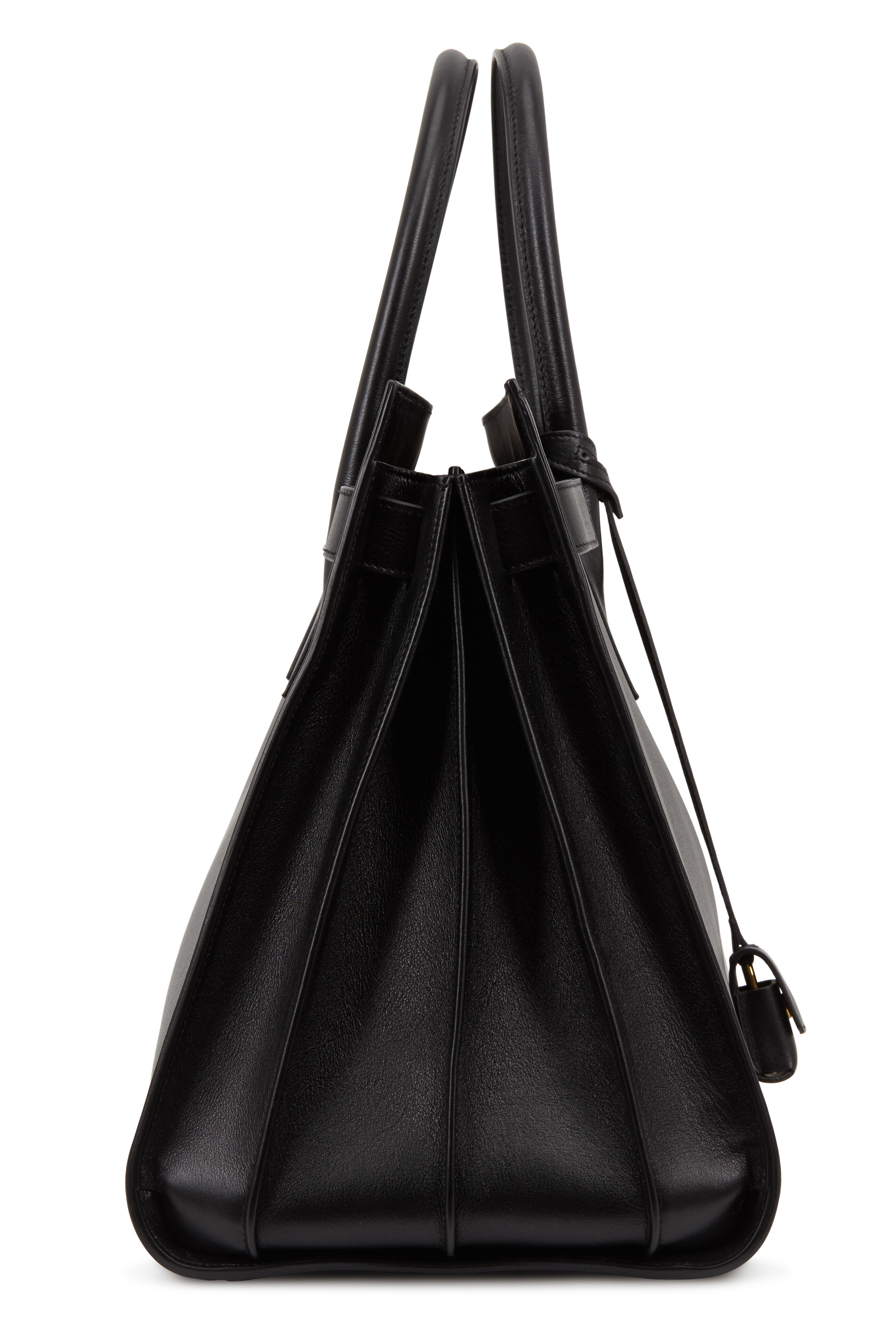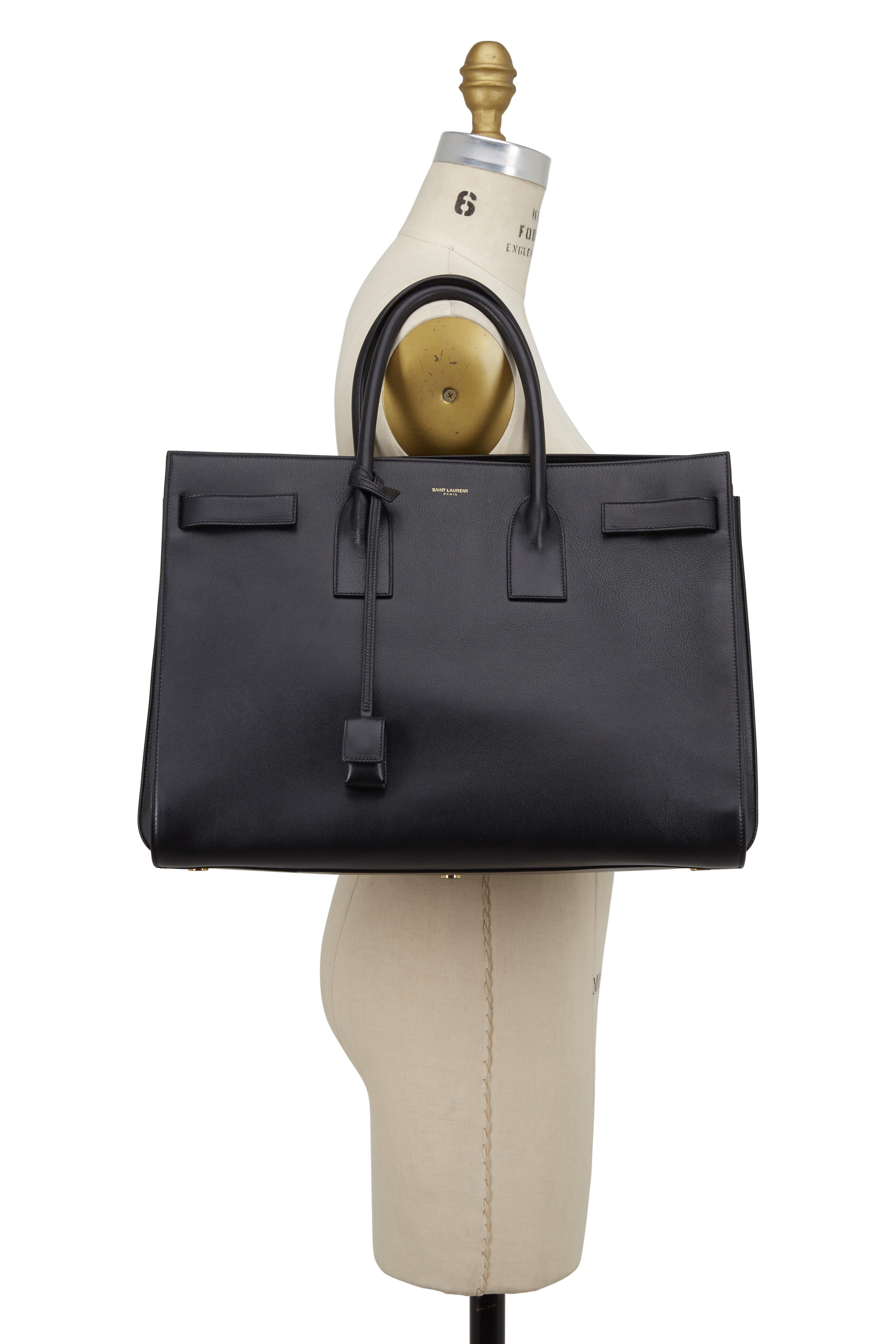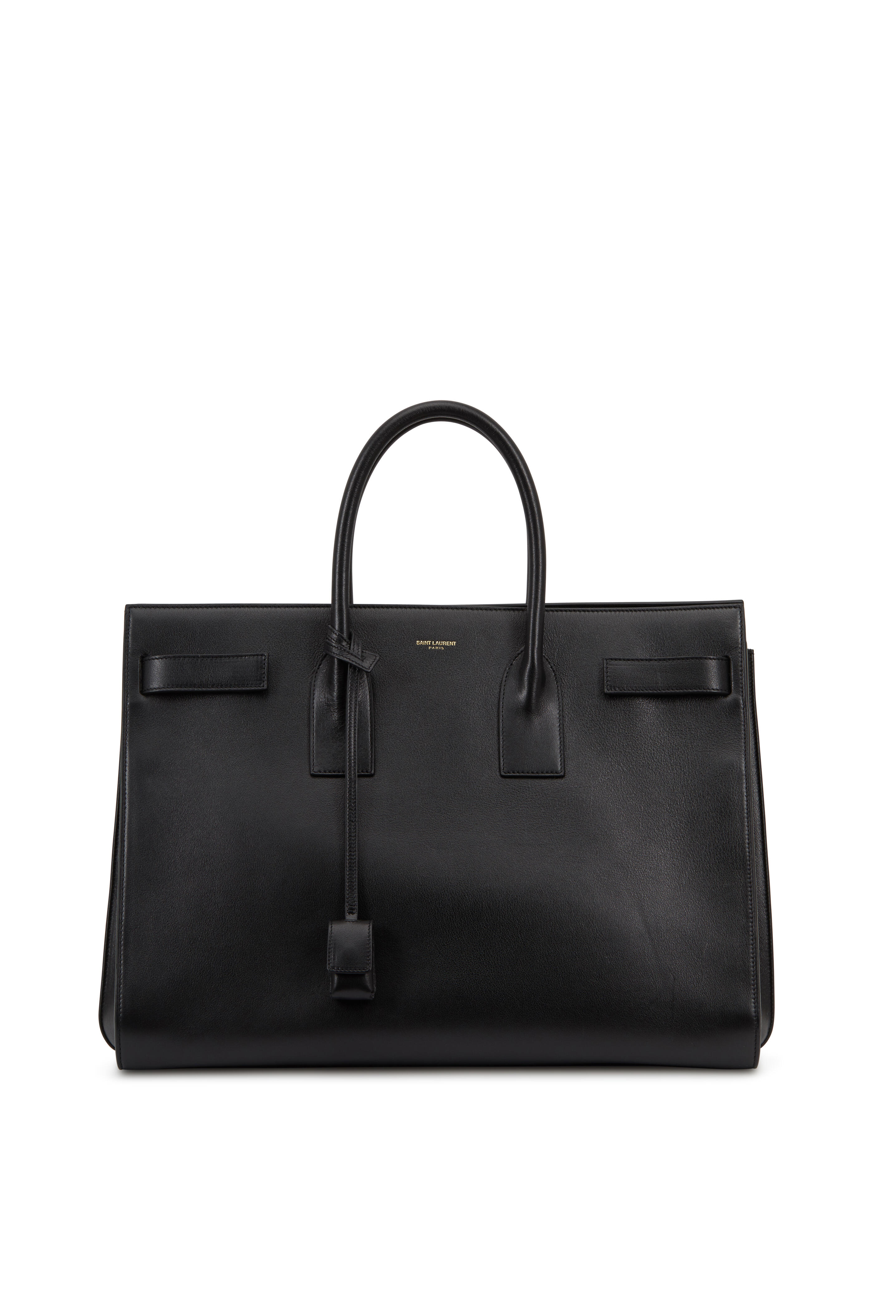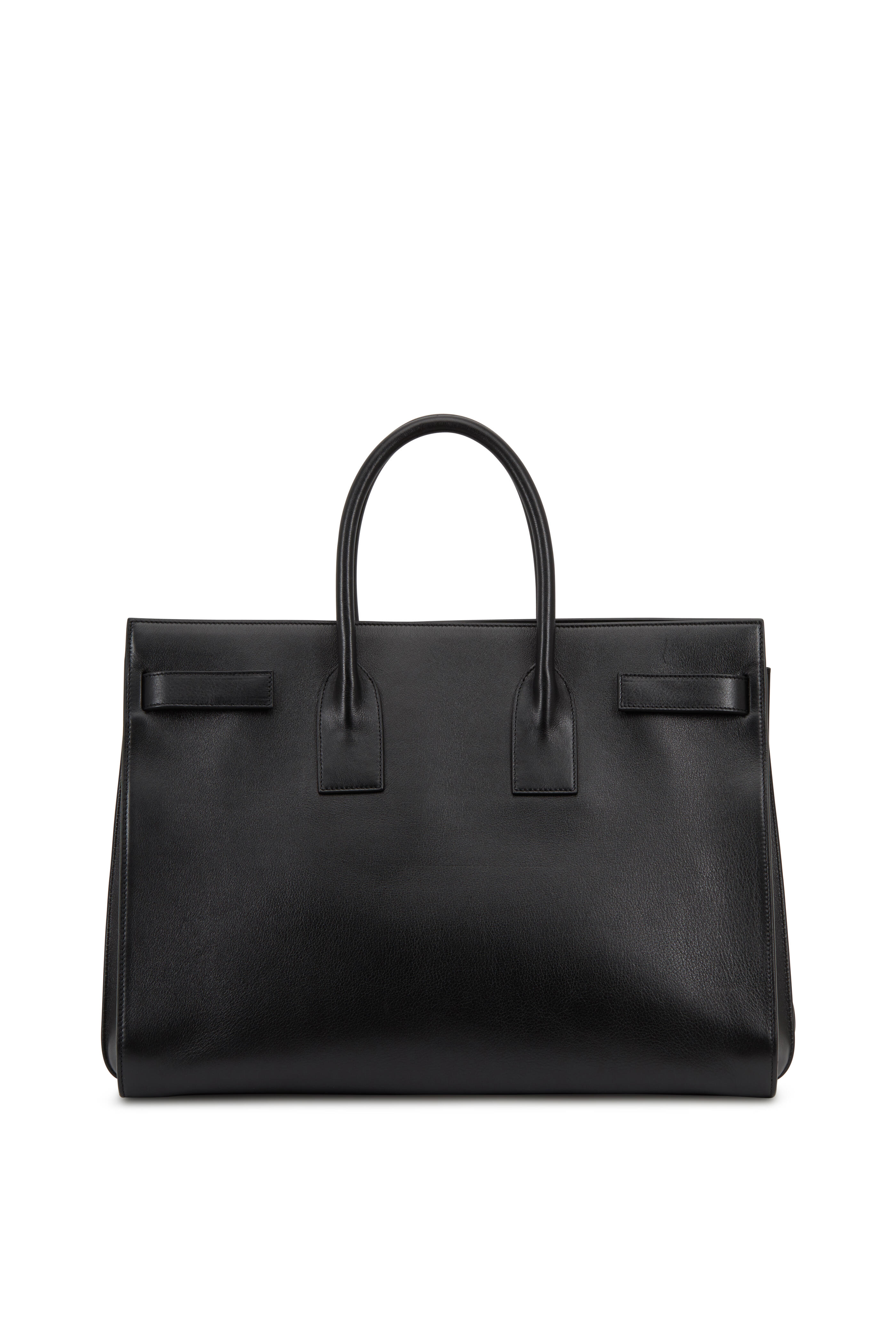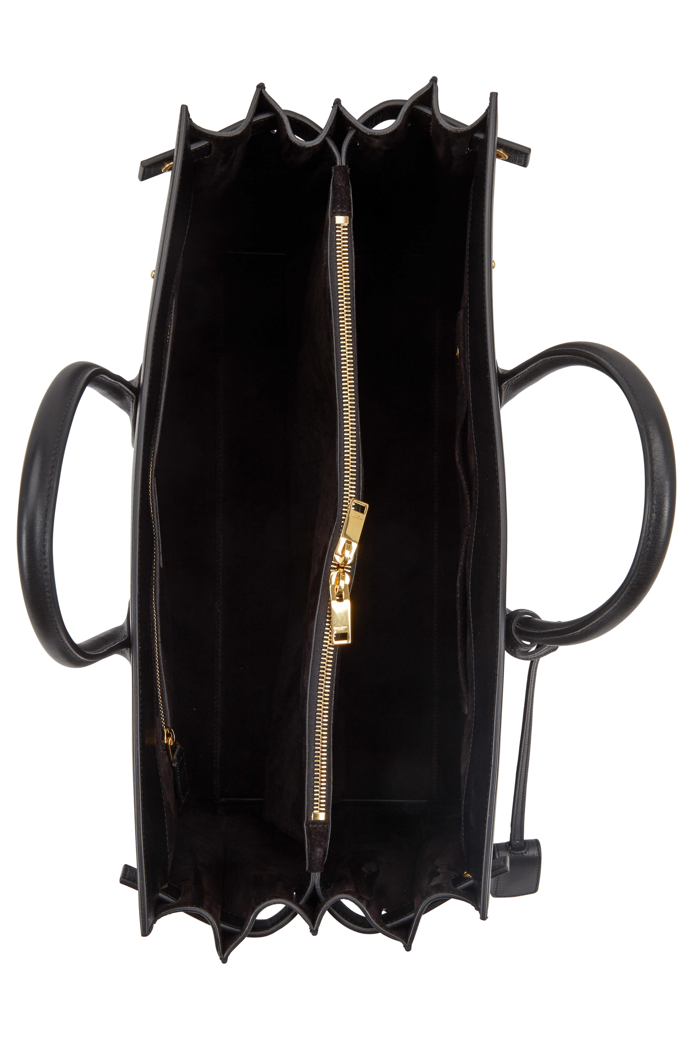 Calfskin leather. Double top handles. Open top. Detachable shoulder strap. Interior zip pocket. Polished gold-tone hardware. Protective metal feet. Made in Italy. Width: 14 ¼". Height: 10 ½". Depth: 5 ½". Top handle drop: 5".