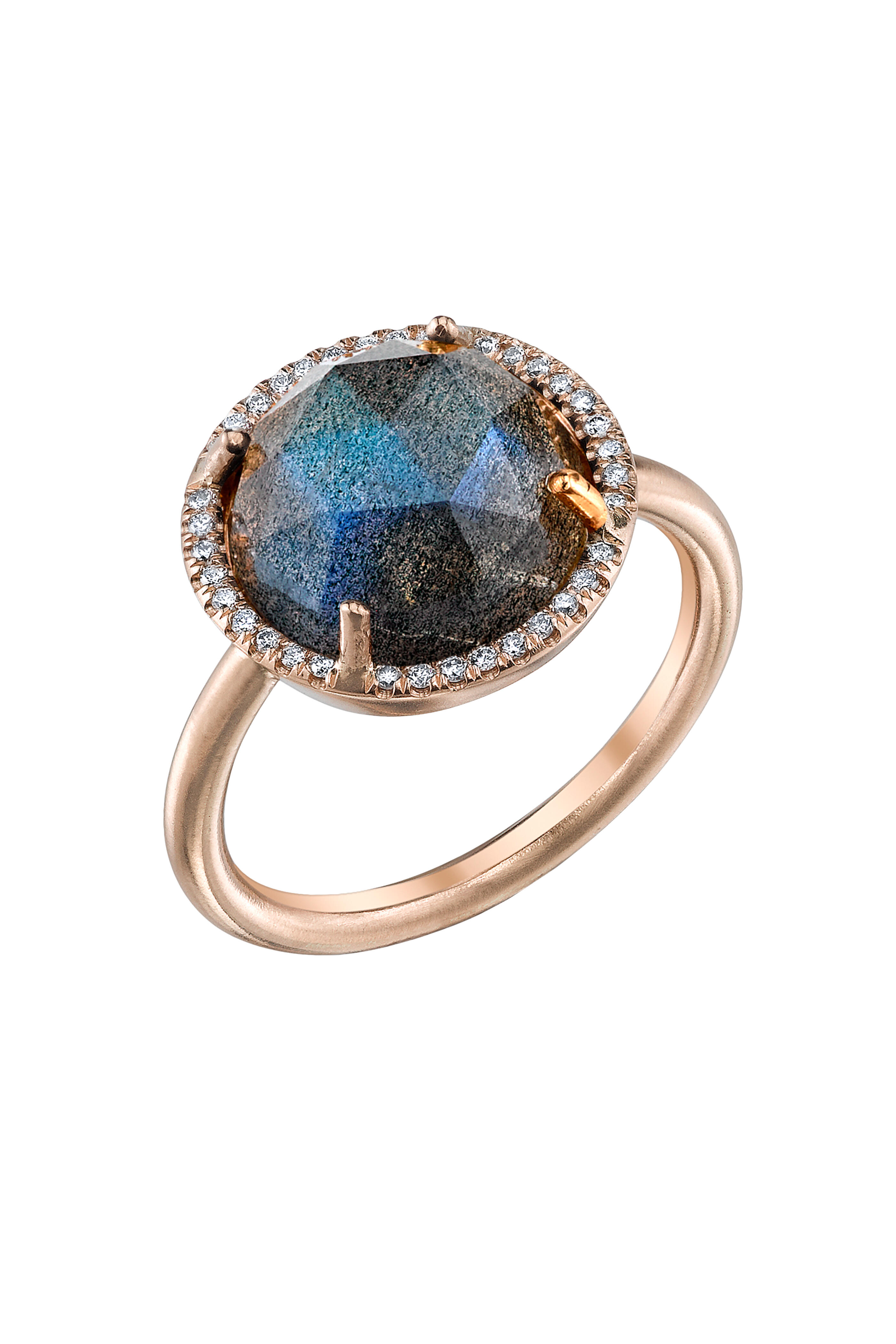 18k rose gold. 11mm rose-cut labradorite gemstone. .13ct pavé-set diamonds.