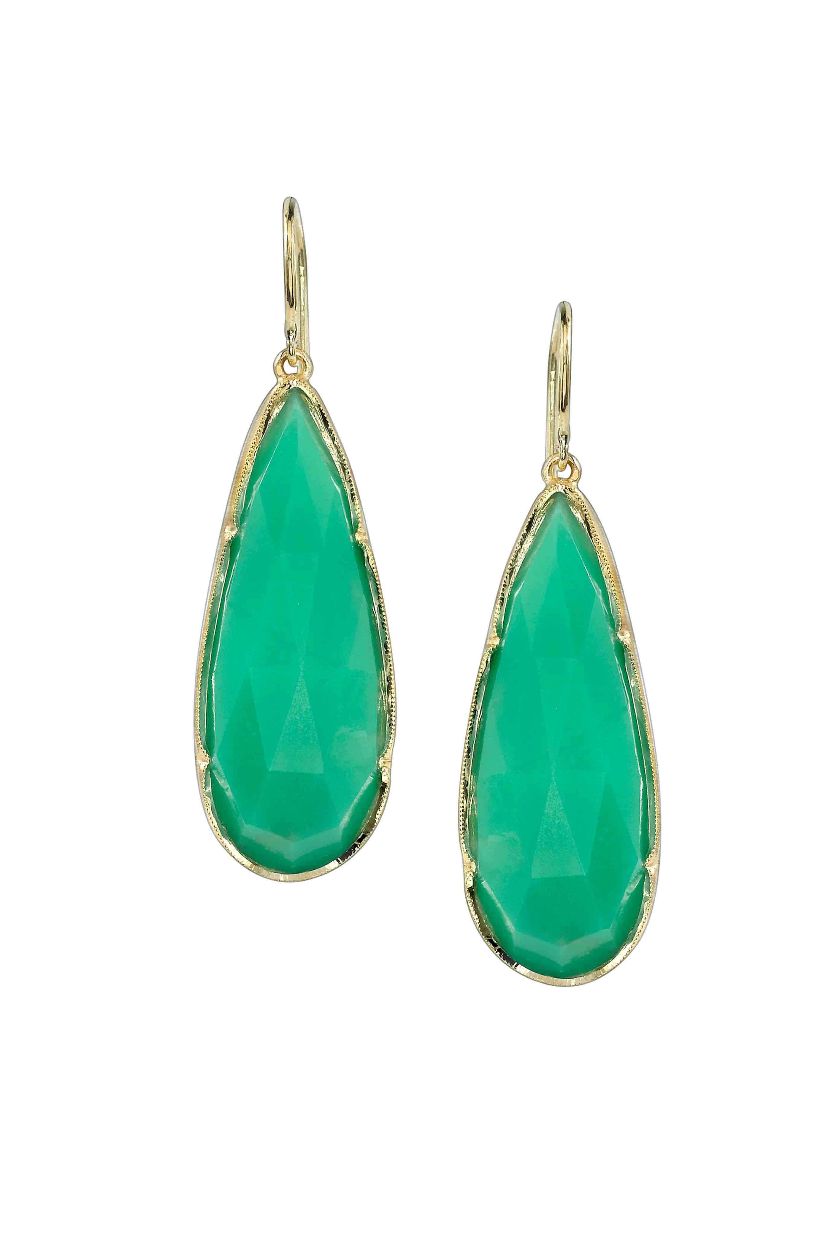 These bright and bold dangle earrings offer a great color and design. They feature two pear shaped, vivid green, rose-cut chrysoprase gemstones set in 18k yellow gold.