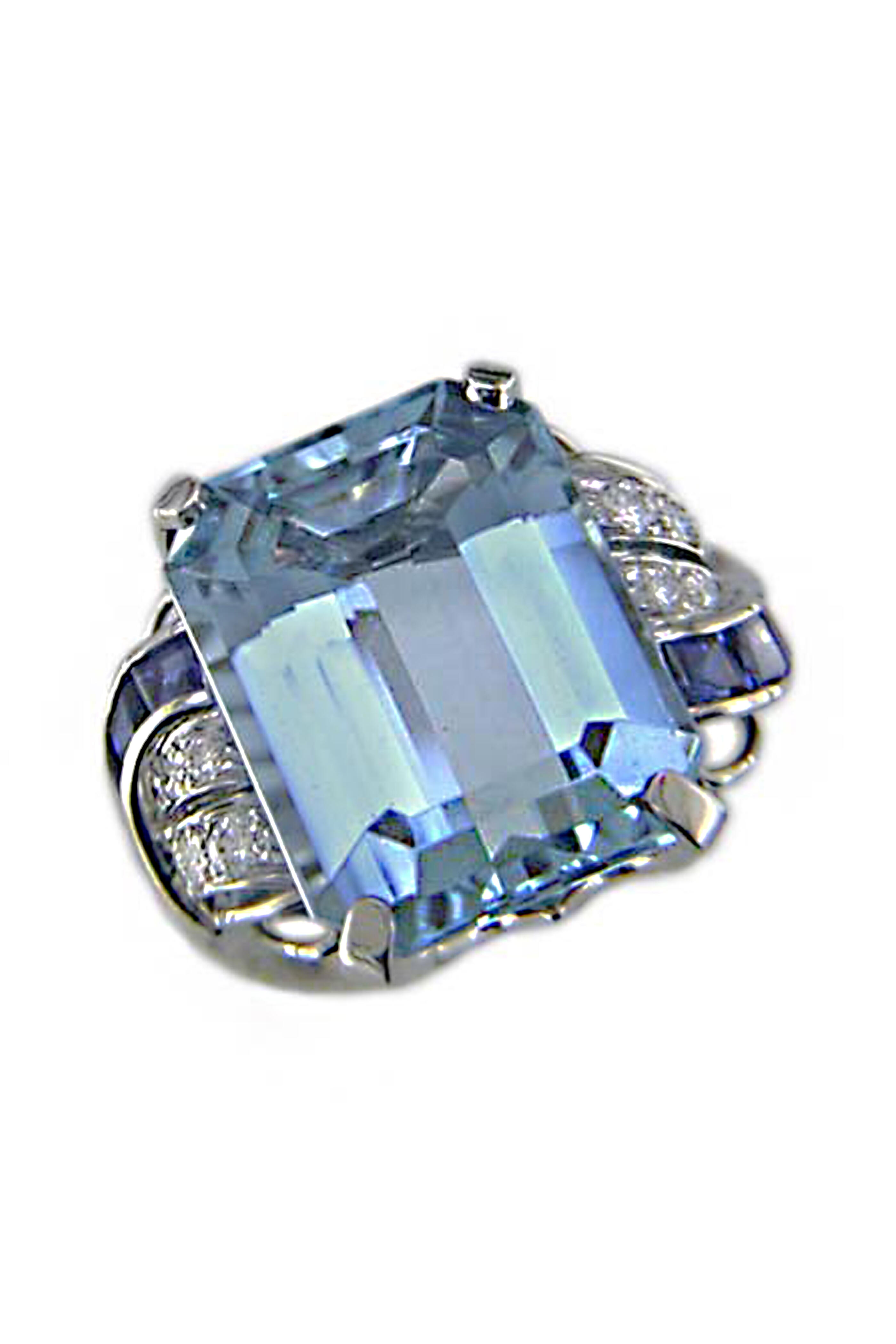 The luxuriant emerald-cut aqua gemstone creates eye catching effects that make this ring shine wonderfully. The band features an array of beautiful round-cut white diamonds intertwined with deep blue sapphires.