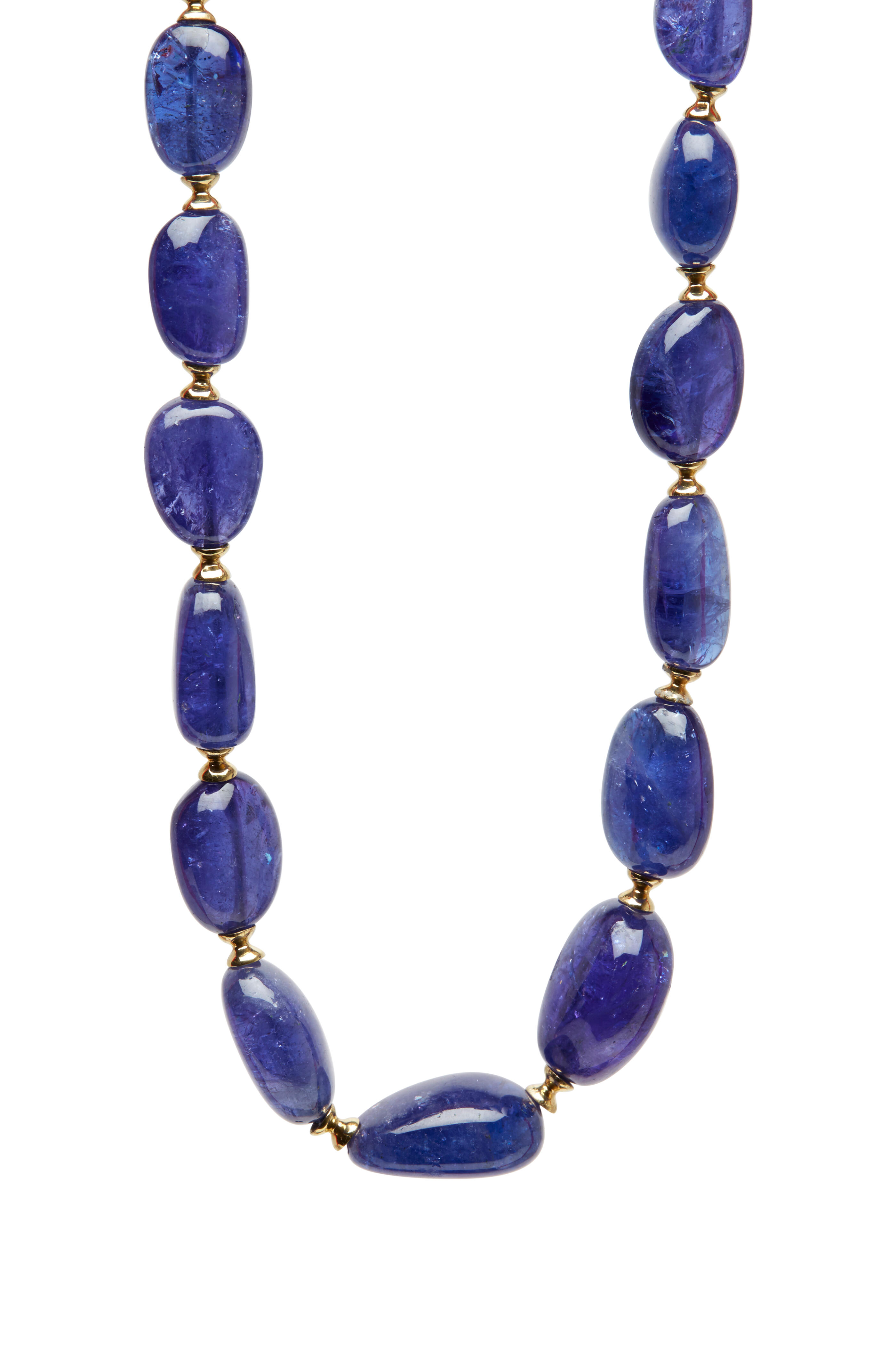 A dark blue dream comes dramatically to life in this stunning tanzanite strand necklace. Warm yellow gold forms an enigmatic backdrop for the beautiful, mismatched gemstones with exceptional hues.