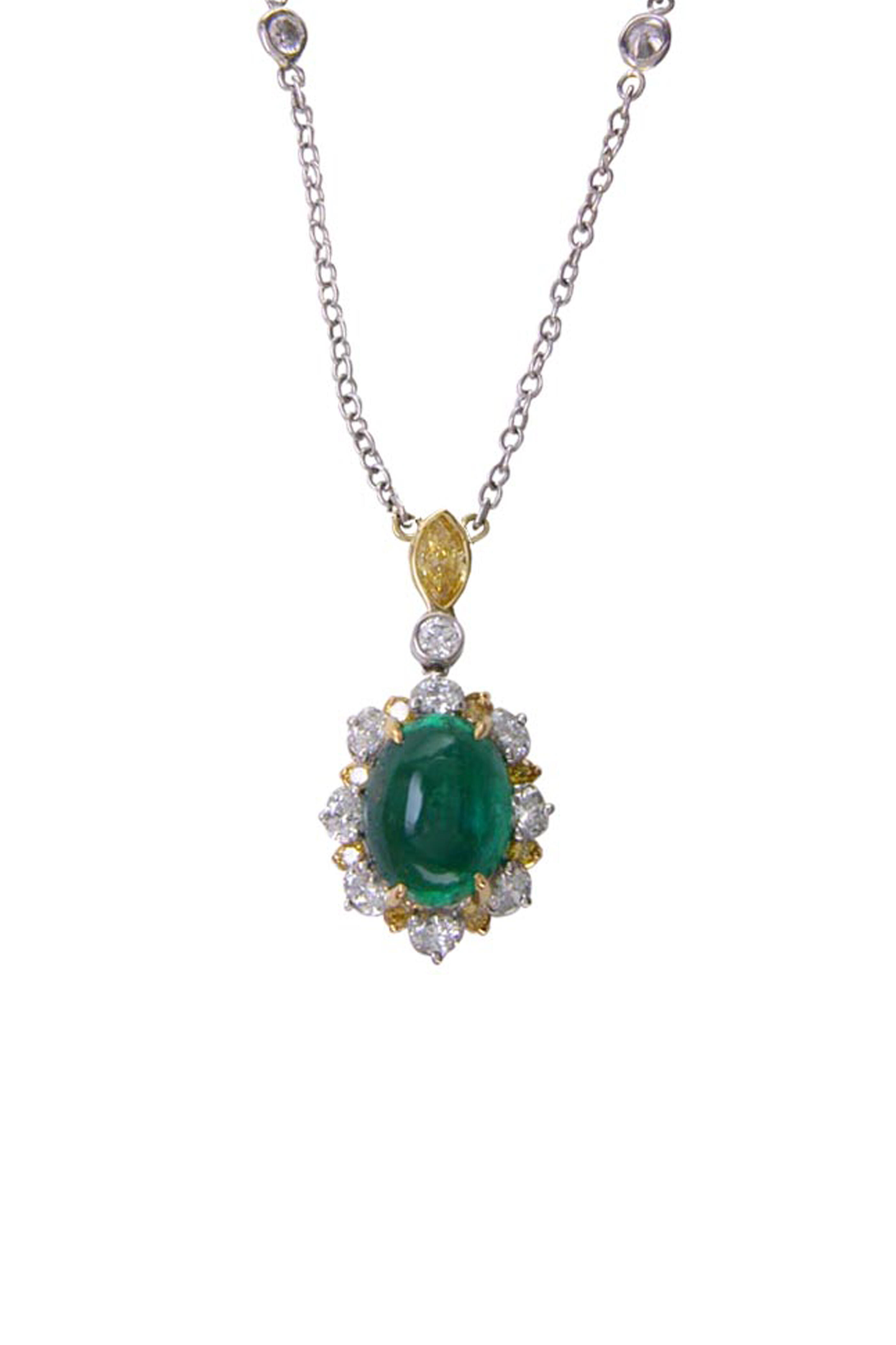 Platinum. 4.11cts emerald gemstones. .26cts (1) marquise-cut fancy yellow diamond. .17cts (8) round-cut fancy yellow diamonds. .49cts (8) oval-cut white diamonds. .97cts white diamonds.