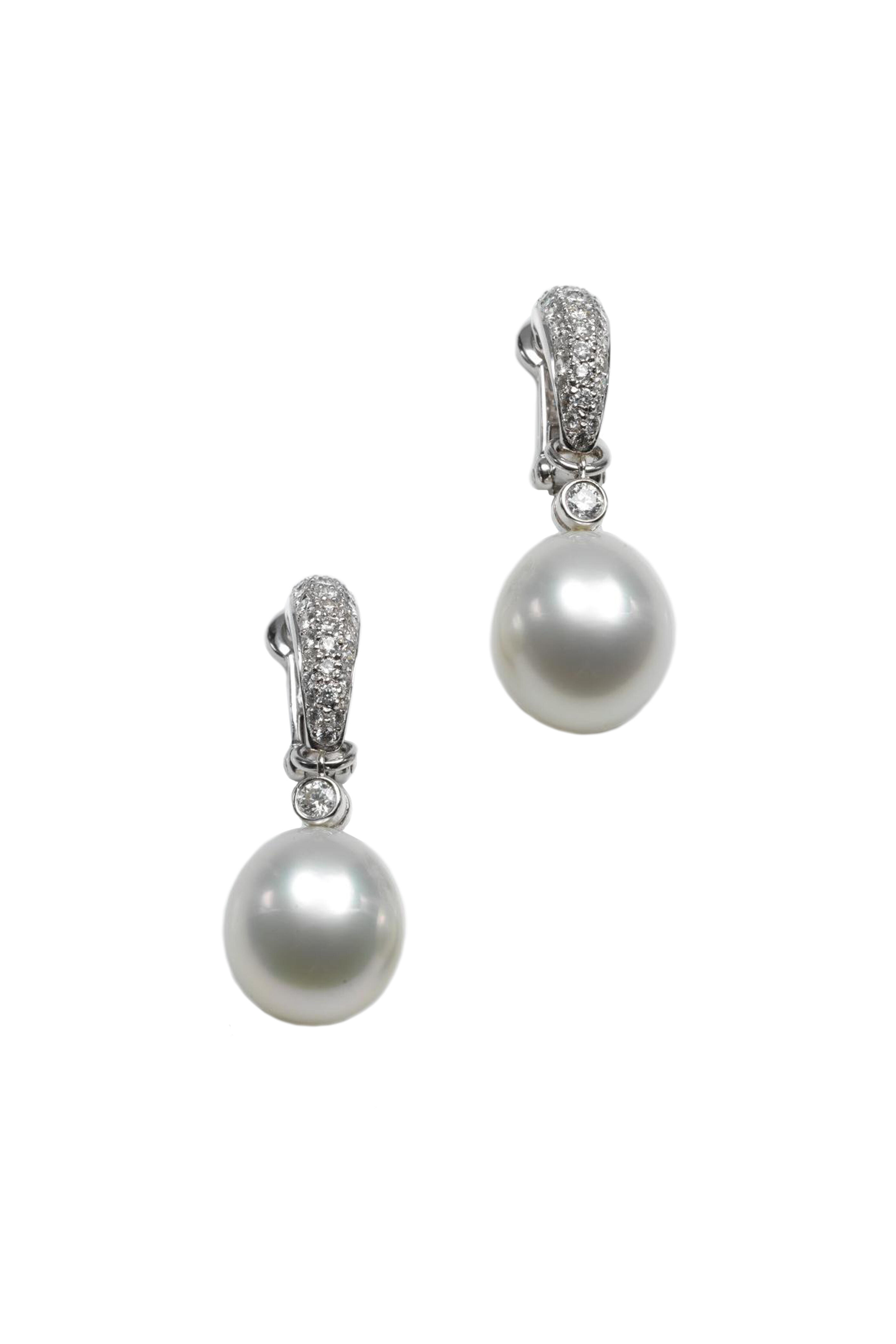 Steal the spotlight with these magnificent South Sea pearl earrings by Assael. The exquisite style is crafted in the palest white gold with white diamond tops and two lustrous pearls.
